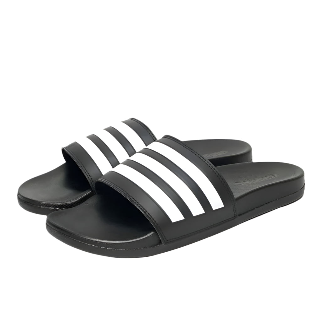classic Adidas Adilette Comfort slides in a sleek black and white color combination. Each slide features a wide, black strap across the midfoot, boldly accented with three parallel white stripes, which is the signature design element of Adidas. The strap appears to be made from a smooth, synthetic material for comfort.