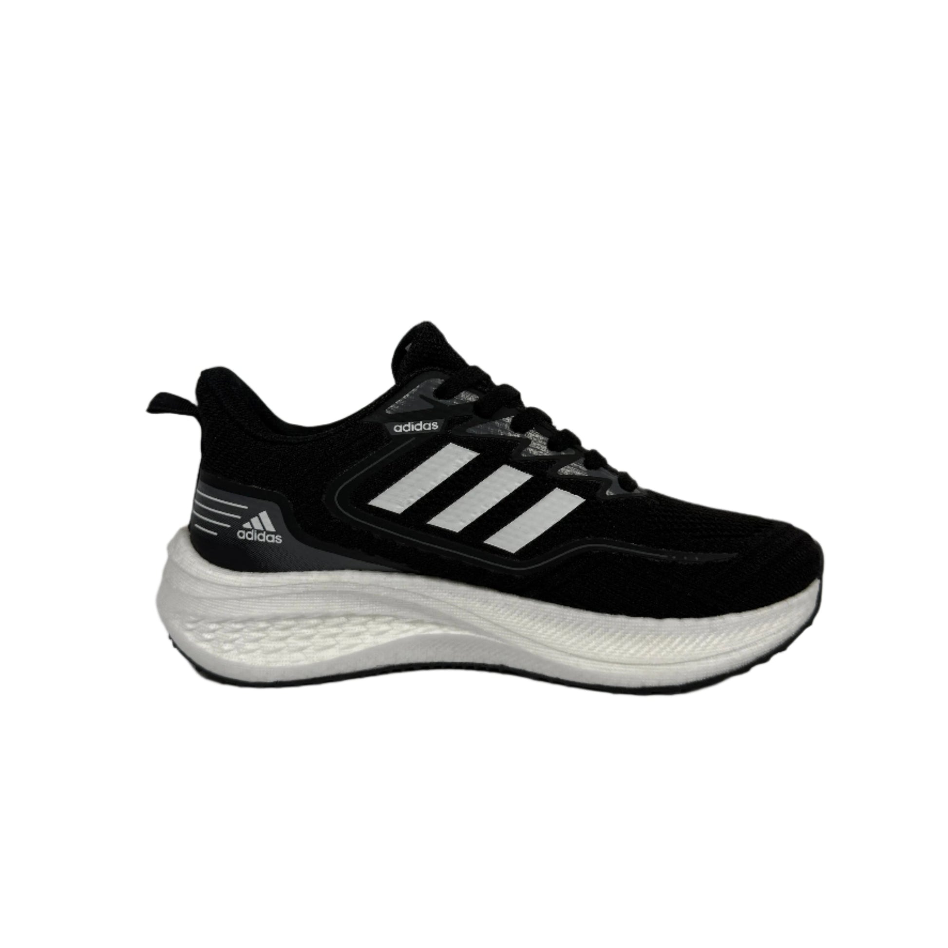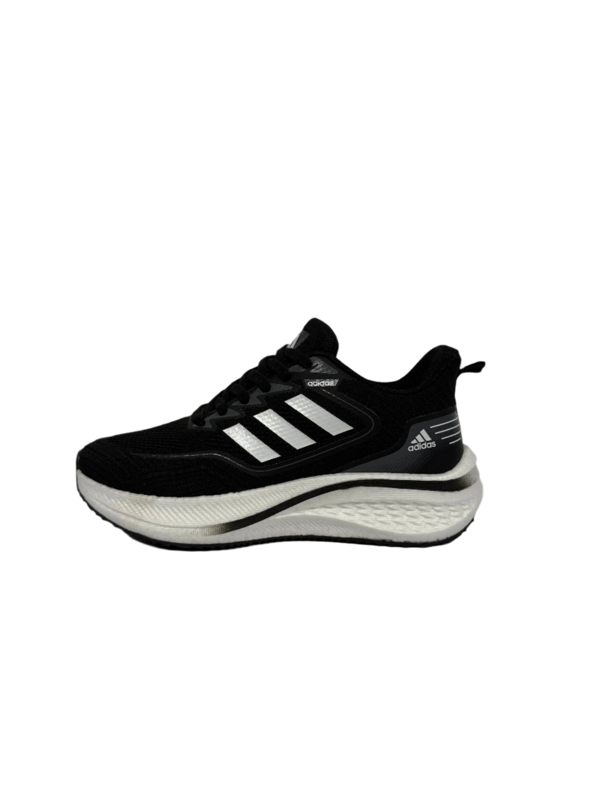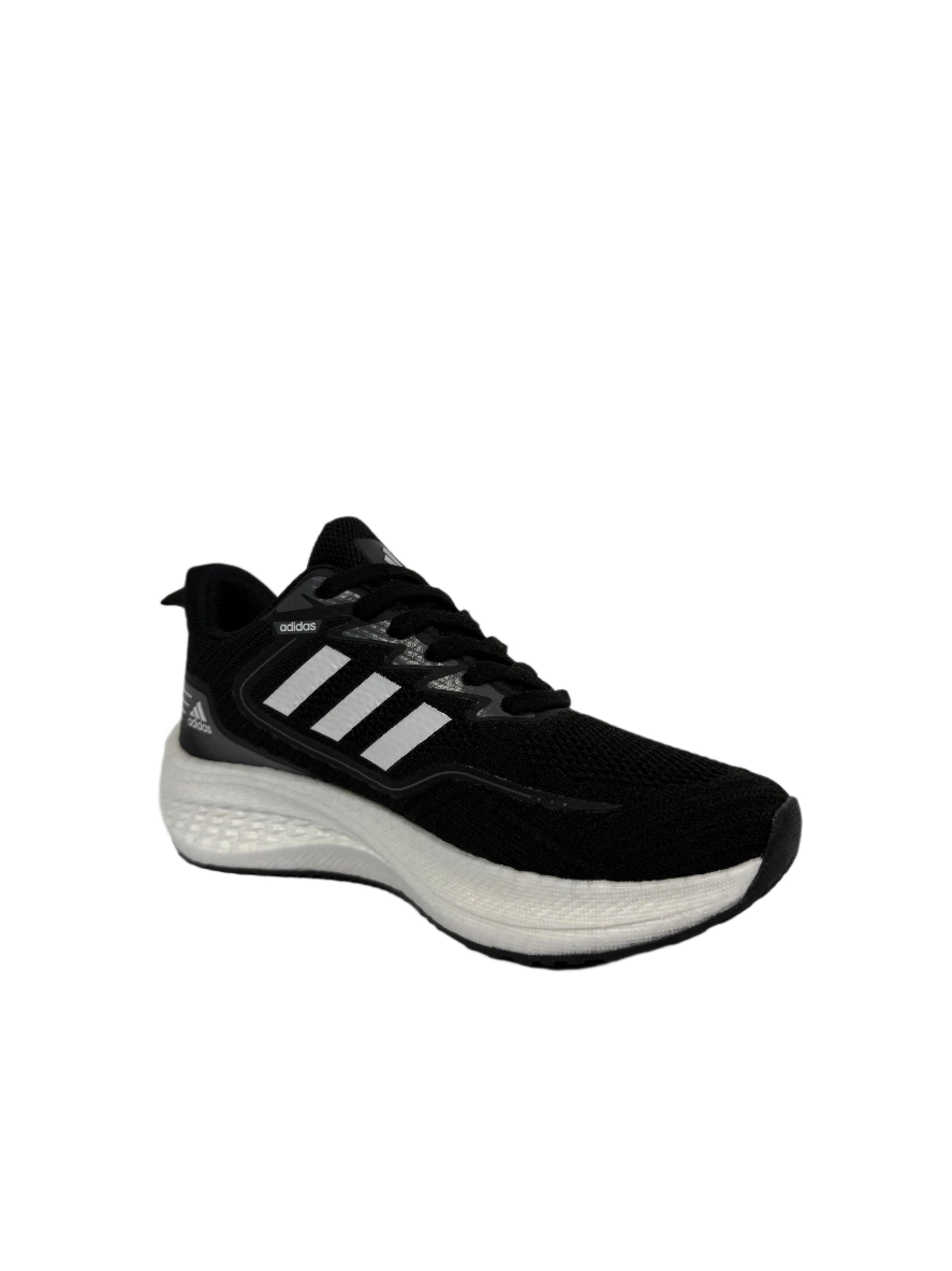These Adidas Duramo SL running shoes are designed for comfort and versatility, suitable for various athletic activities and casual wear. The upper features a sleek black mesh for breathability and a clean aesthetic. Distinct white Adidas three stripes are prominently displayed on the sides, providing a classic look.