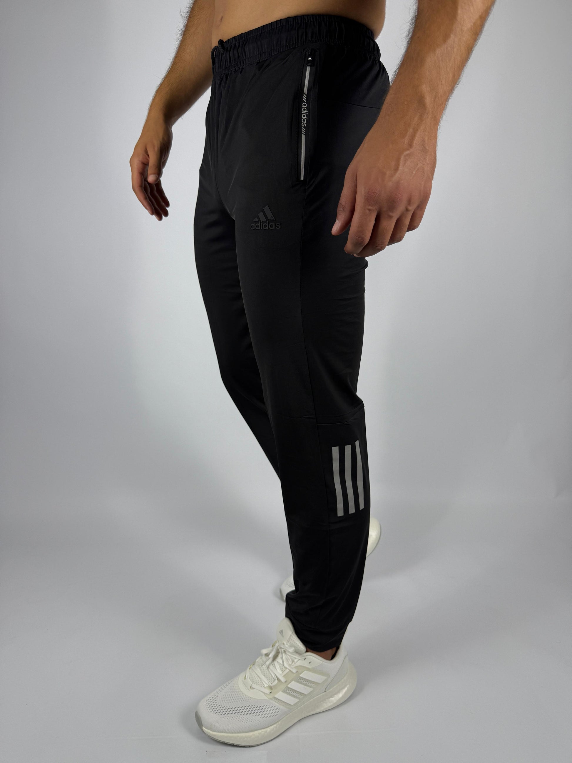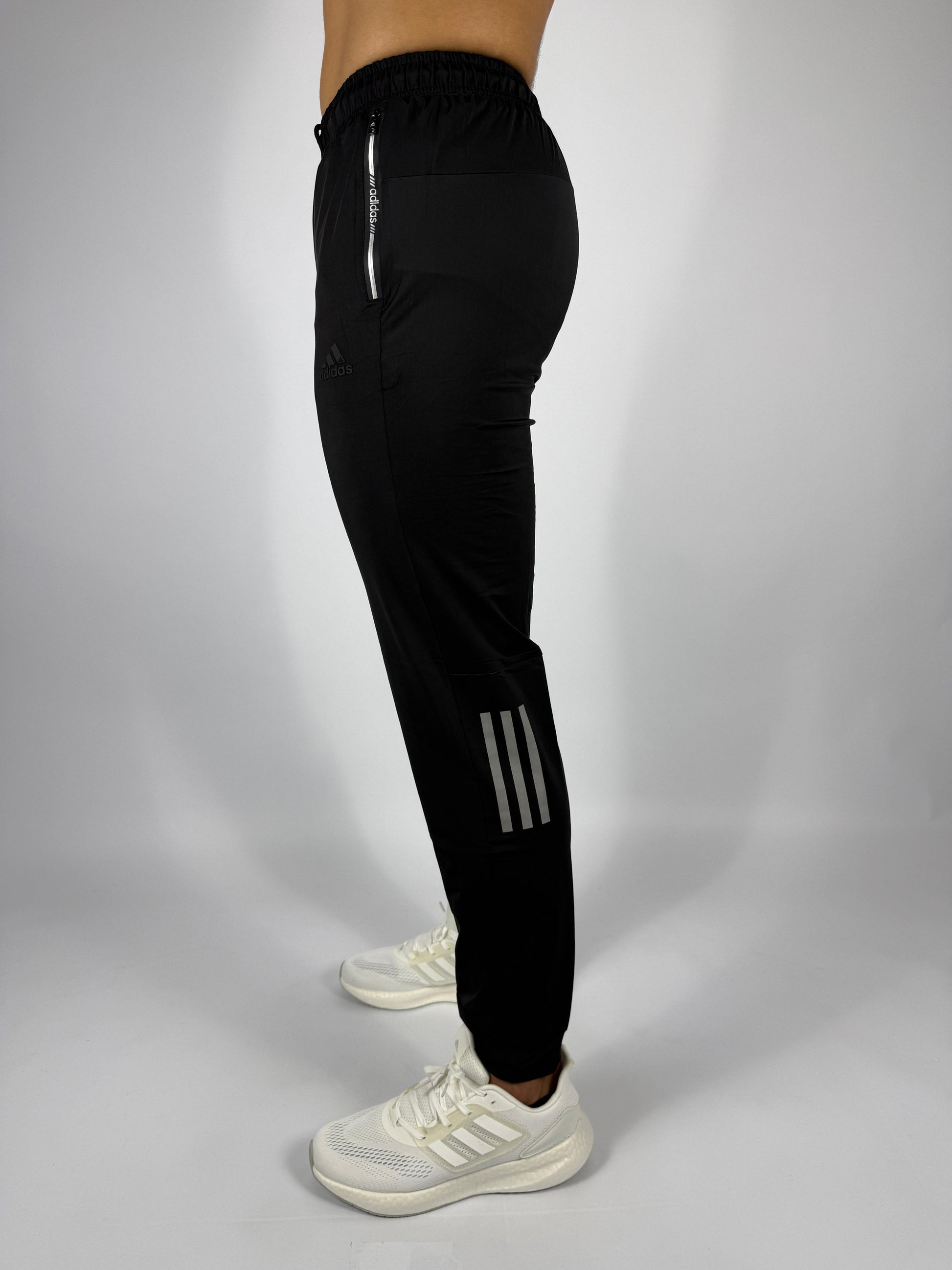 solid black training pants by Adidas, displayed on a person (torso not visible) standing against a light grey background. The pants feature a plain, minimalist design with no prominent branding on the front, offering a sleek and versatile look. They have an elasticated waistband with a visible drawstring for a secure and adjustable fit. The fit is tapered, narrowing towards the ankles, which are finished with elastic cuffs. These pants appear to be made from a lightweight, breathable fabric, ideal for athletic activities or comfortable everyday wear.