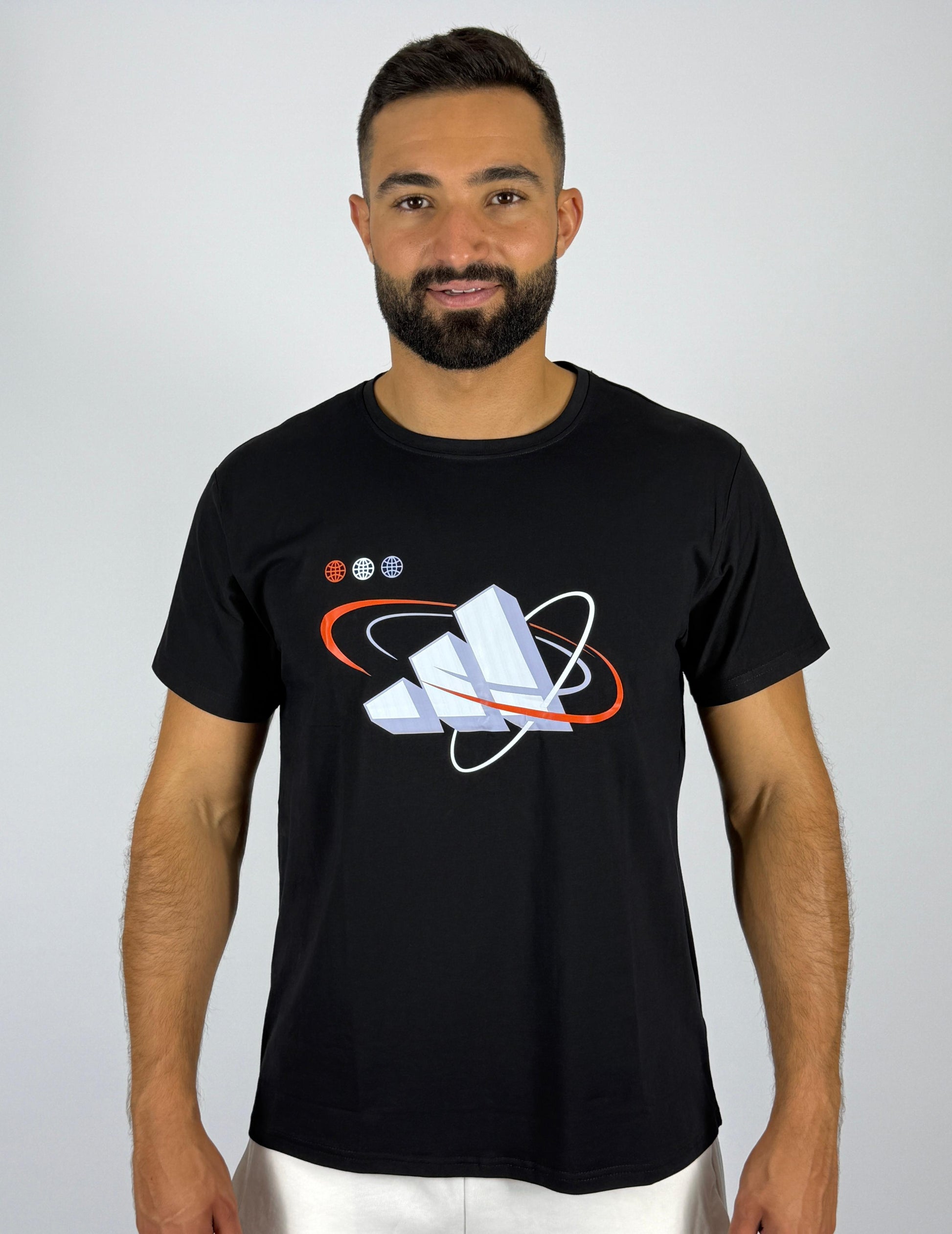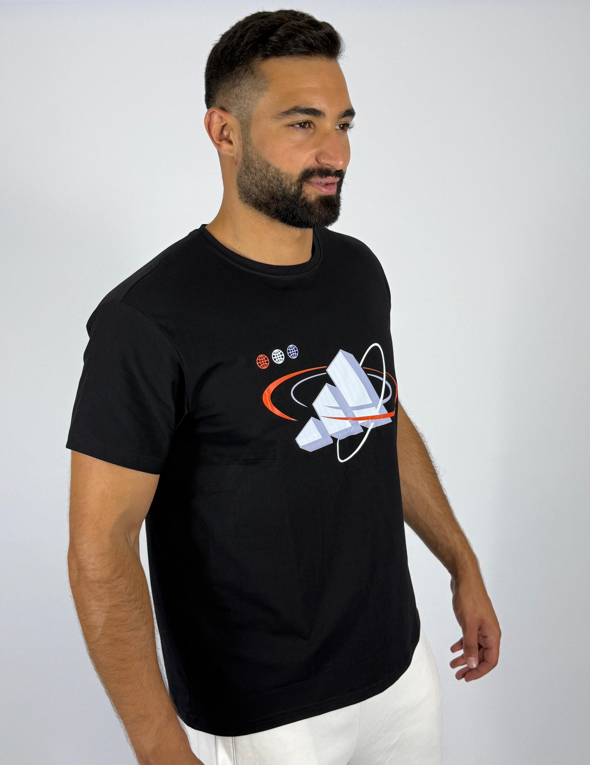 Step into the future of sportswear with the Men's Adidas 3D Geometric Badge of Sport T-Shirt. This sleek black tee features a captivating, multi-dimensional graphic of the iconic Adidas "Mountain" logo on the chest, rendered with geometric facets and dynamic lines that create a contemporary, almost architectural effect. Orbiting elements and small globe icons above the main graphic add to its futuristic and connected vibe.