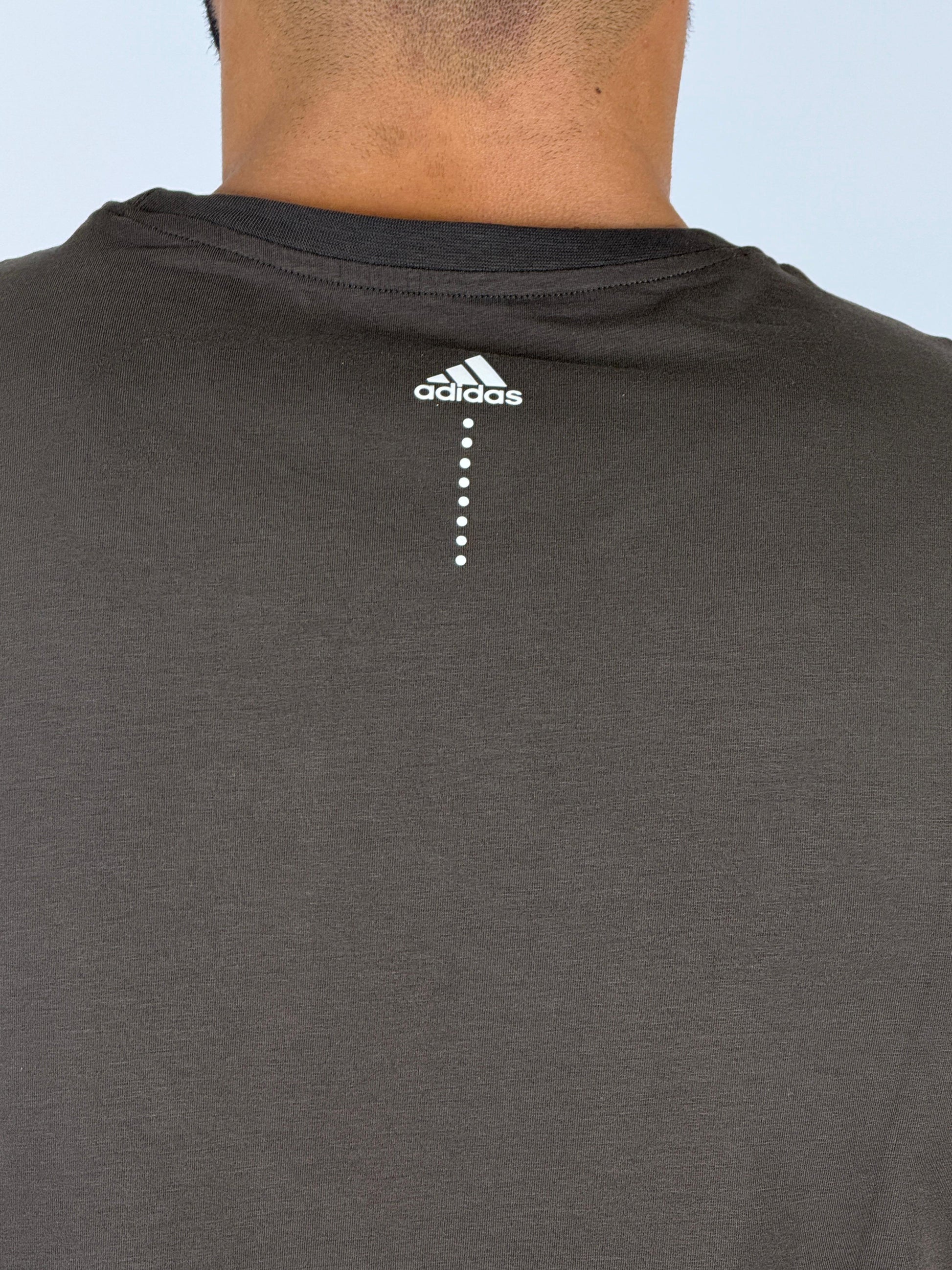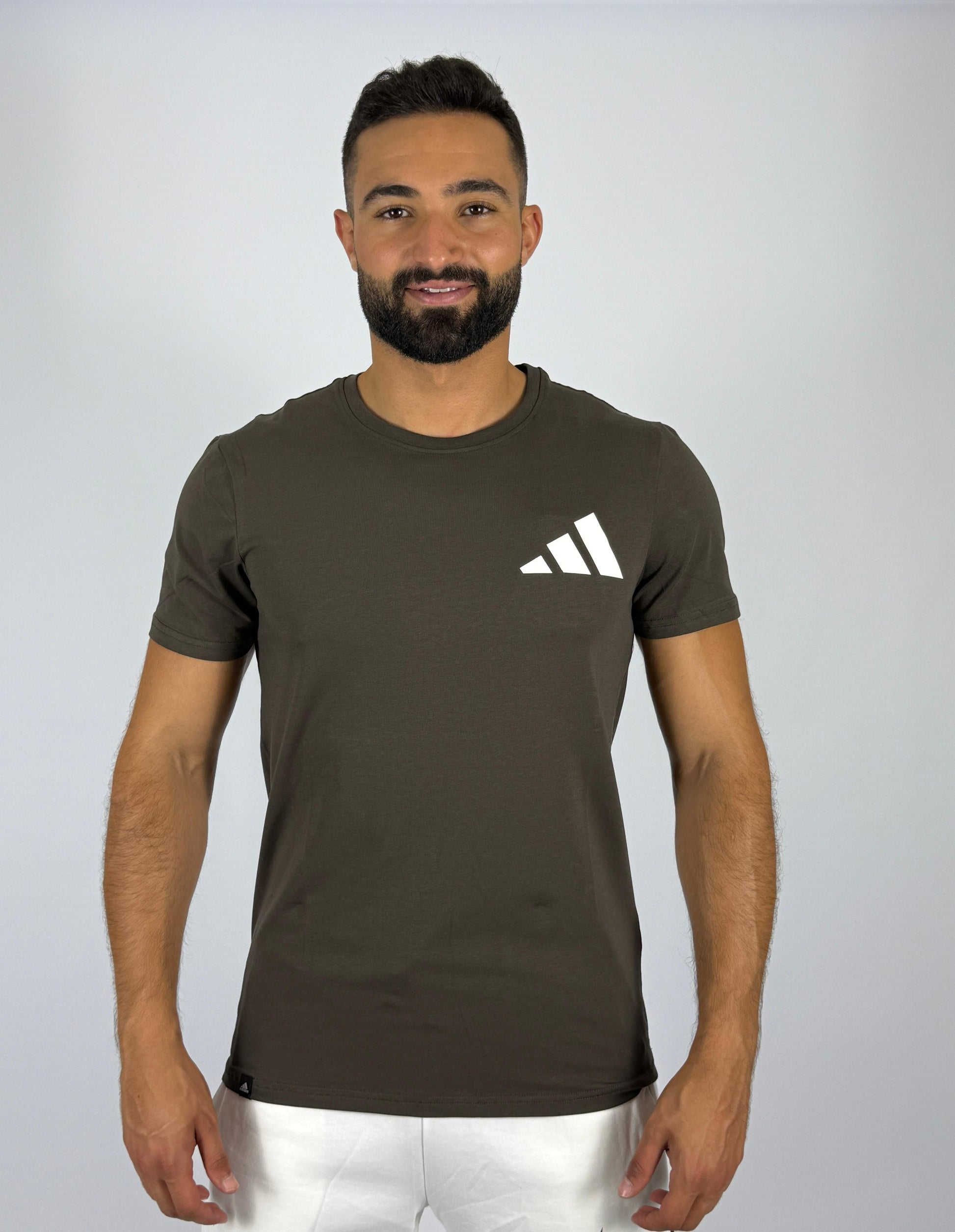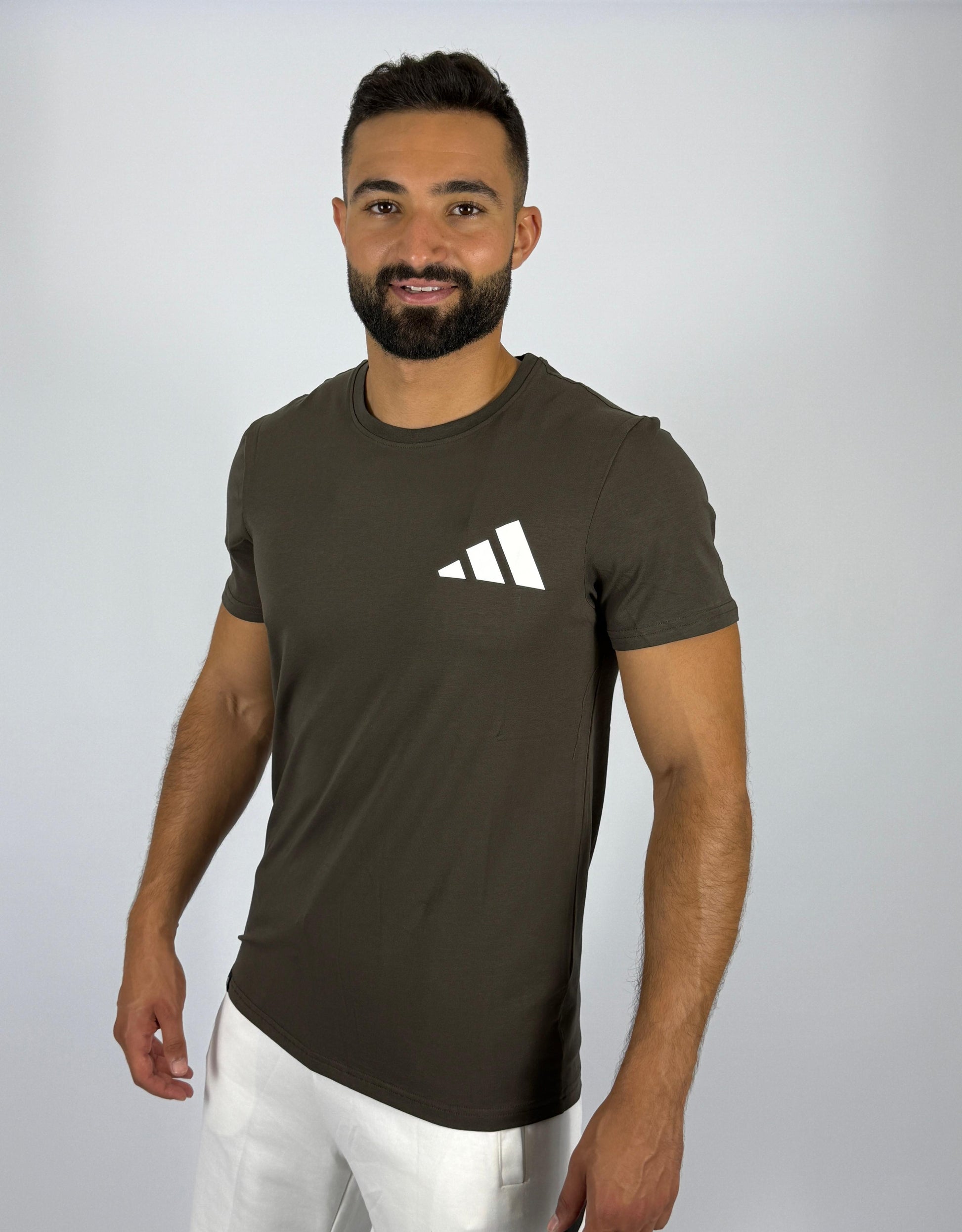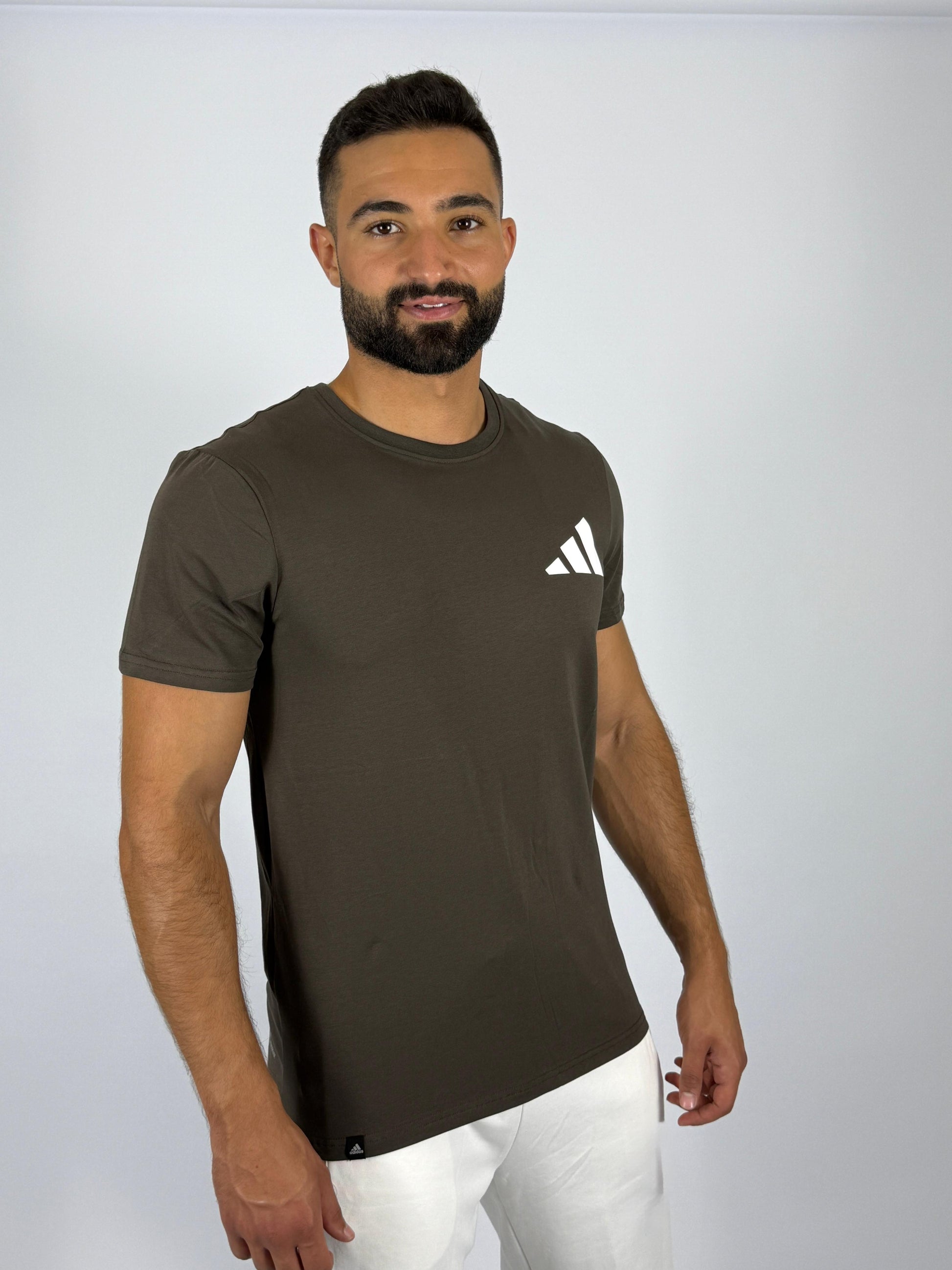 Embrace classic athletic style and comfort with the Men's Adidas Badge of Sport Logo T-Shirt in a versatile Dark Olive Green (or Khaki Green). This essential tee features the iconic Adidas "Mountain" logo, also known as part of the Badge of Sport, prominently displayed in crisp white on the chest. This instantly recognizable symbol represents performance, achievement, and the enduring quality of Adidas.