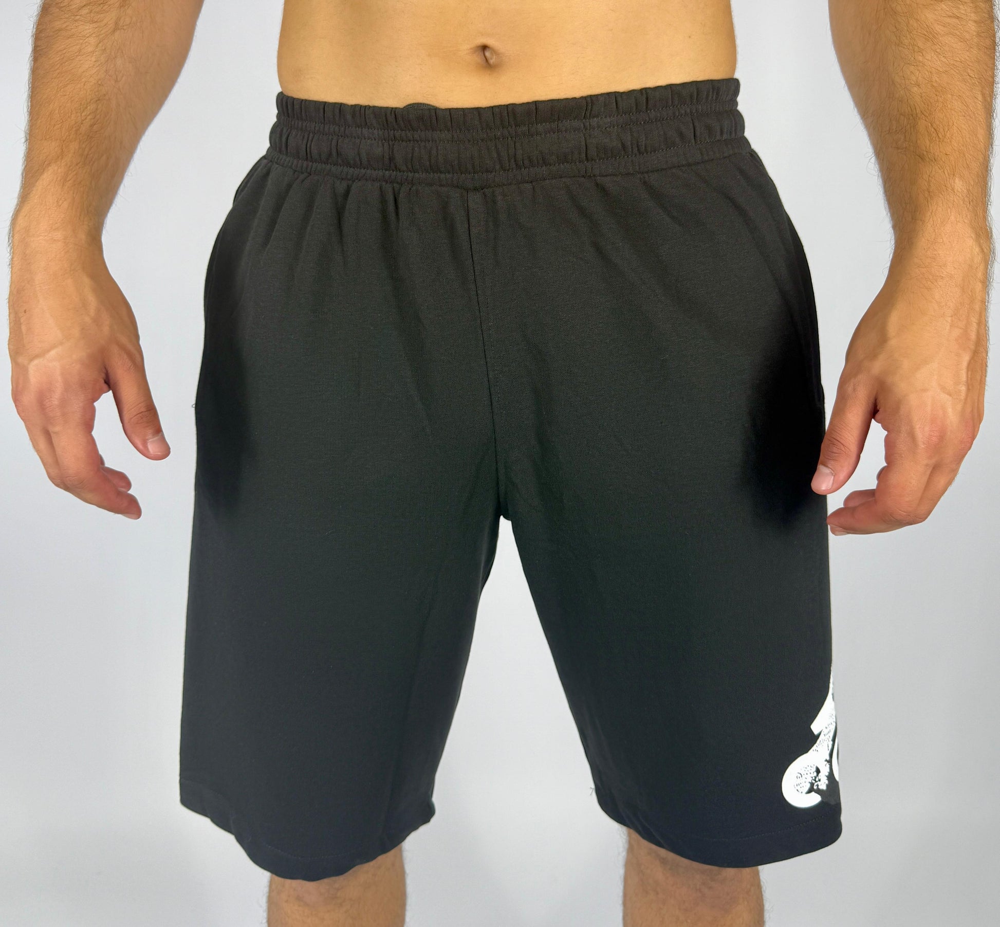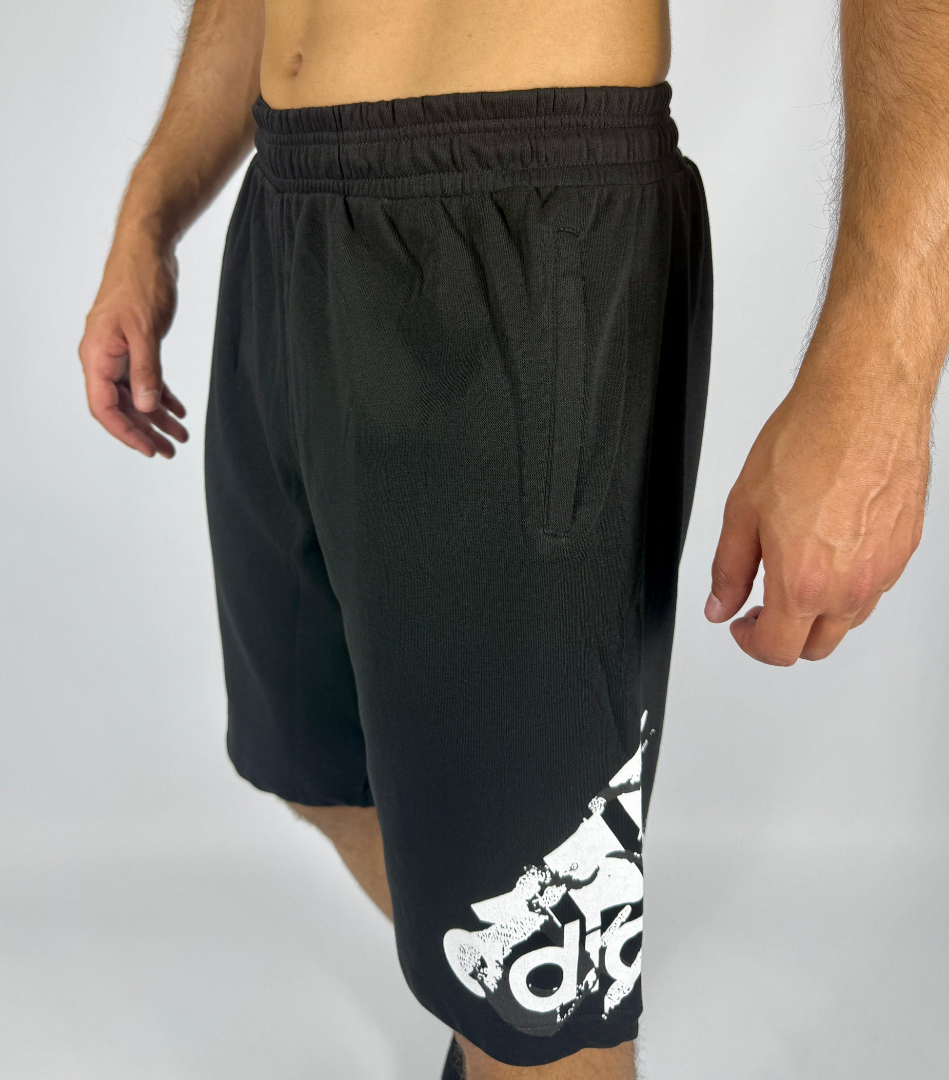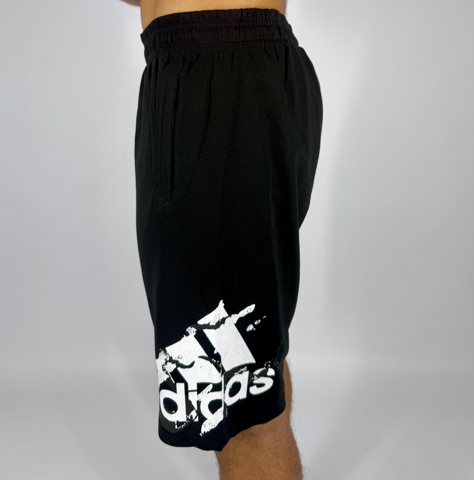 men's black sweat shorts with an elastic waistband, side pockets, and a large, distressed white Adidas logo (badge of sport) printed on the lower left leg. The material appears to be a comfortable fleece or cotton blend, suitable for casual wear, lounging, or light athletic activities.