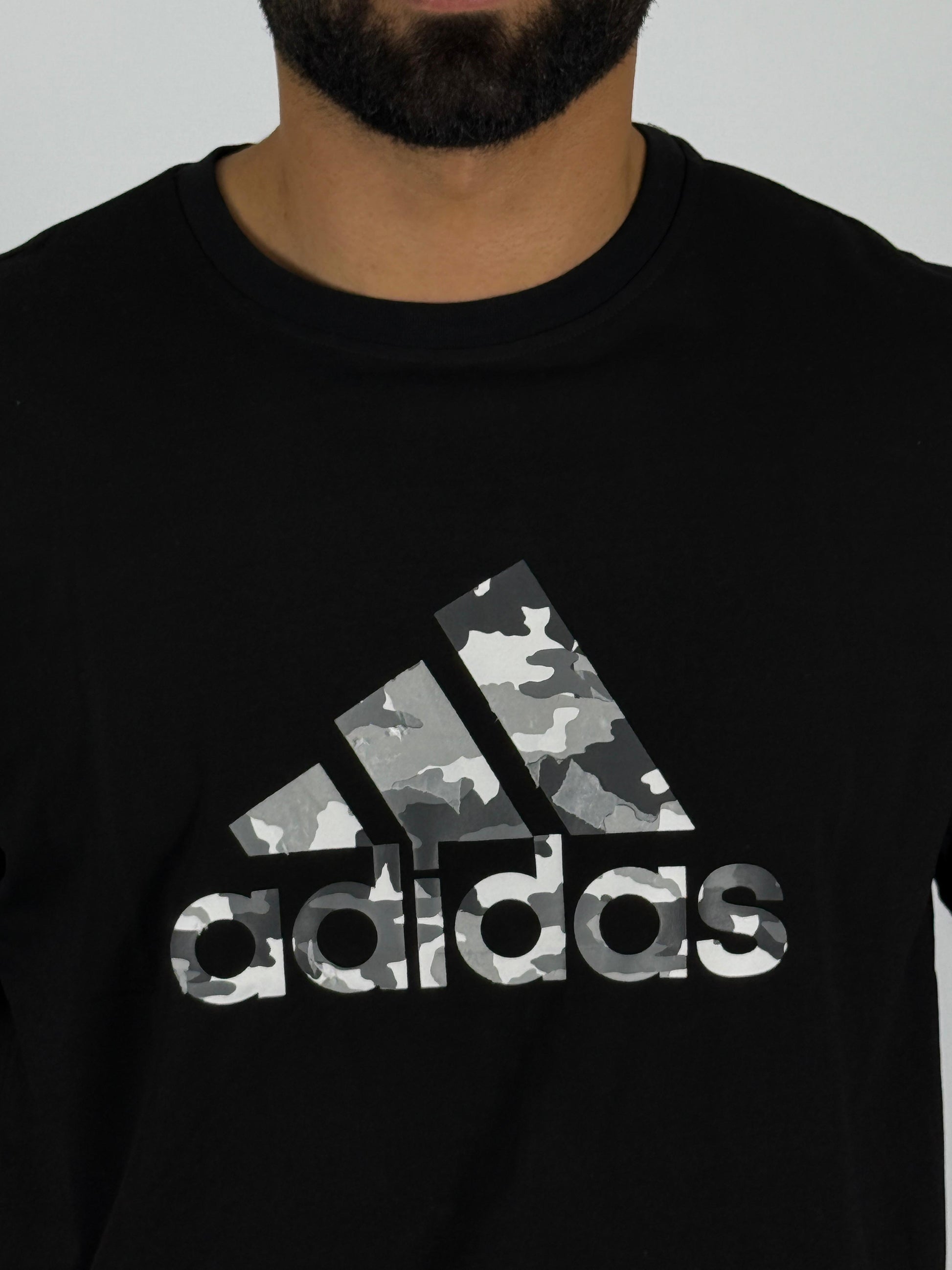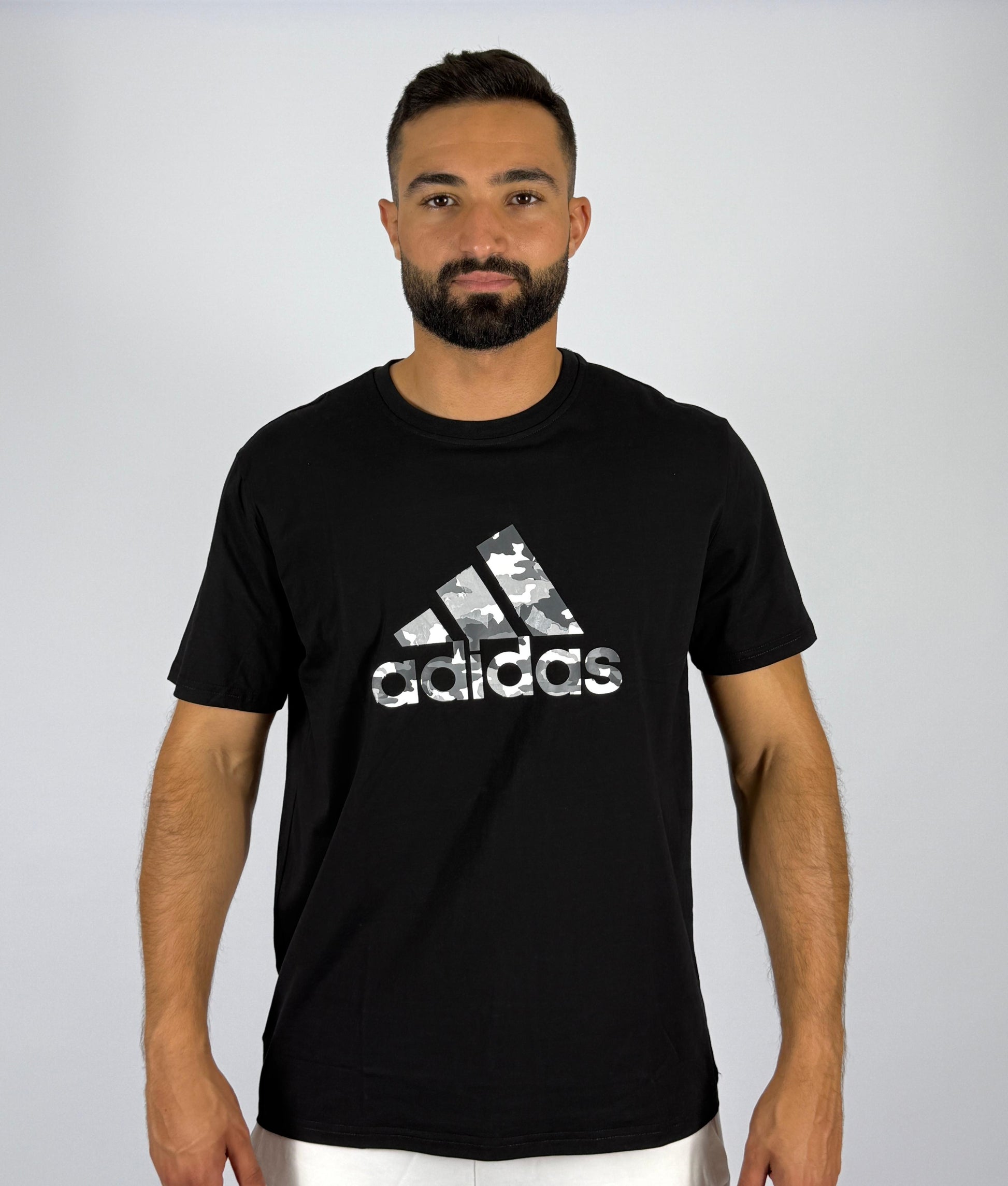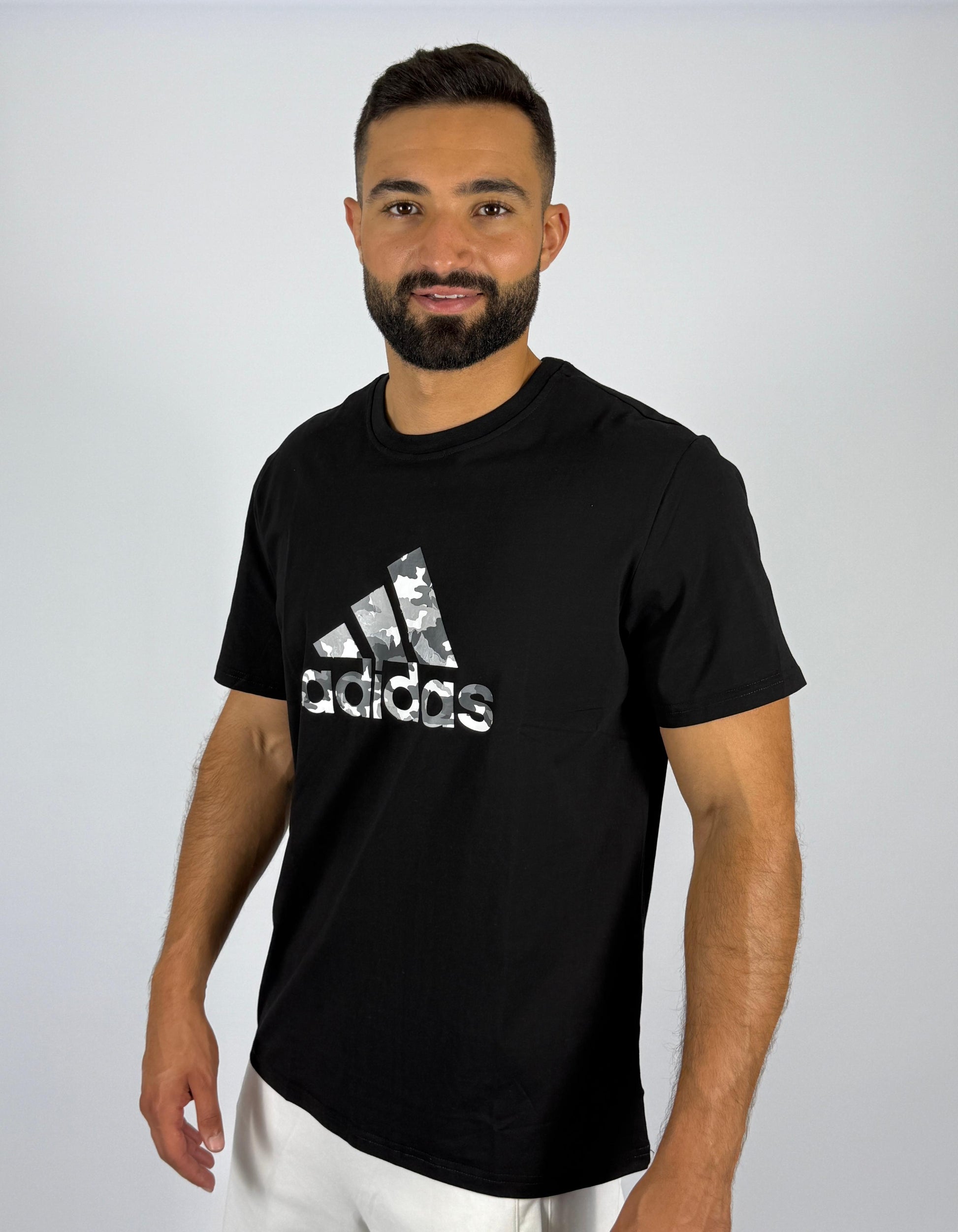 Men's Adidas Camouflage Badge of Sport Logo T-Shirt - Black with Grey Camo Print