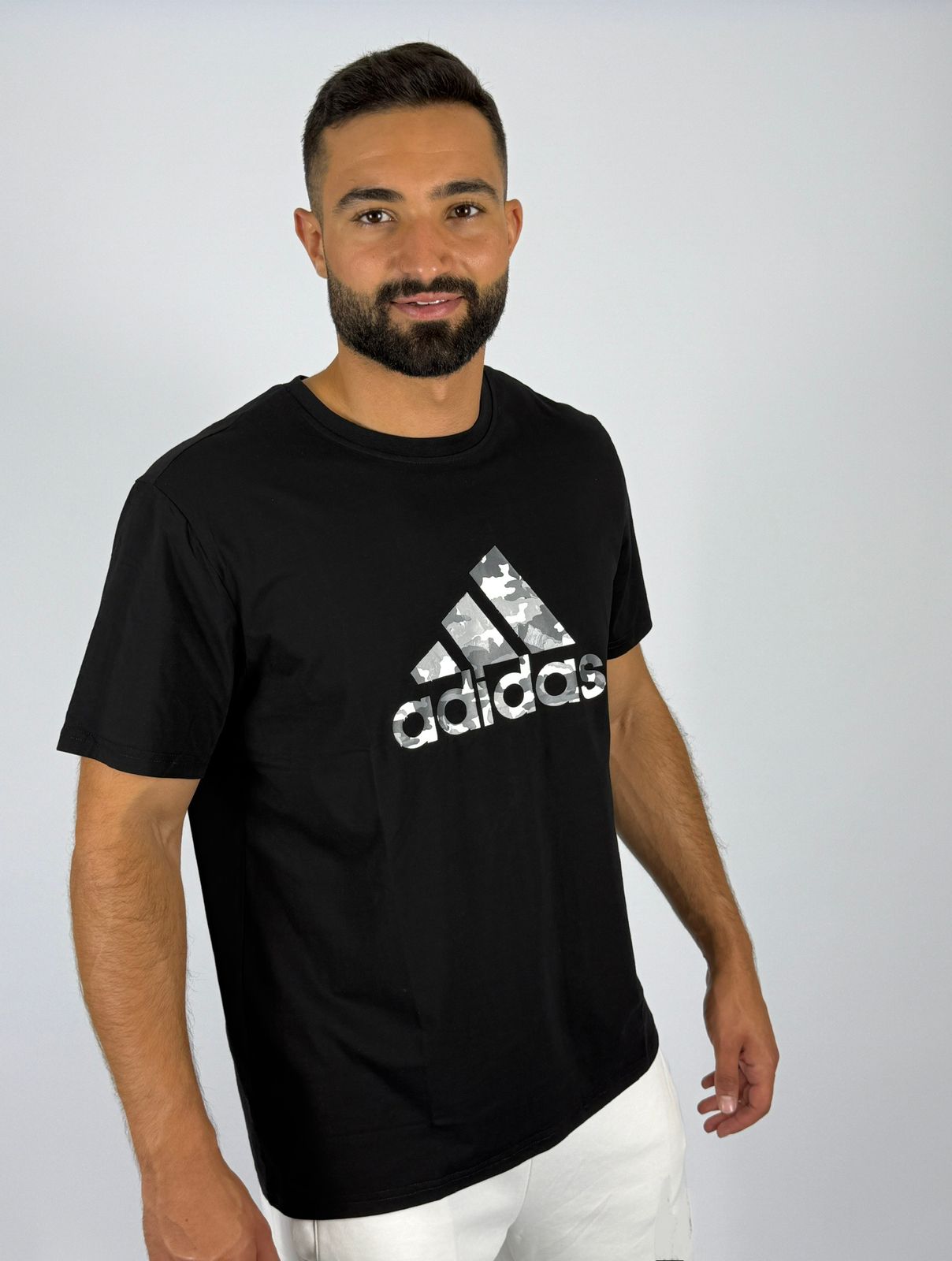 Merge classic Adidas style with a modern, edgy twist with the Men's Adidas Camouflage Badge of Sport Logo T-Shirt. This sleek black tee features the iconic Adidas Badge of Sport (Mountain) logo on the chest, filled with a cool and subtle grey camouflage pattern. This unique graphic offers a fresh take on classic branding, perfect for those who appreciate both athletic heritage and contemporary design.