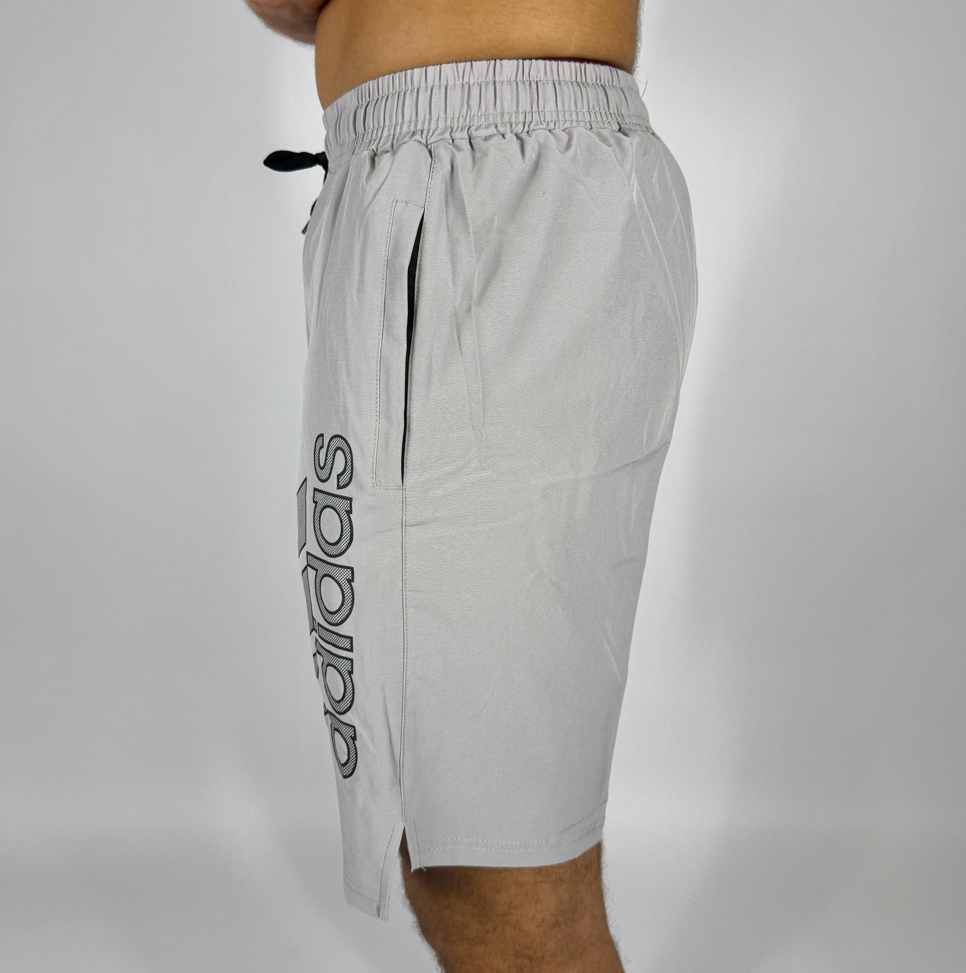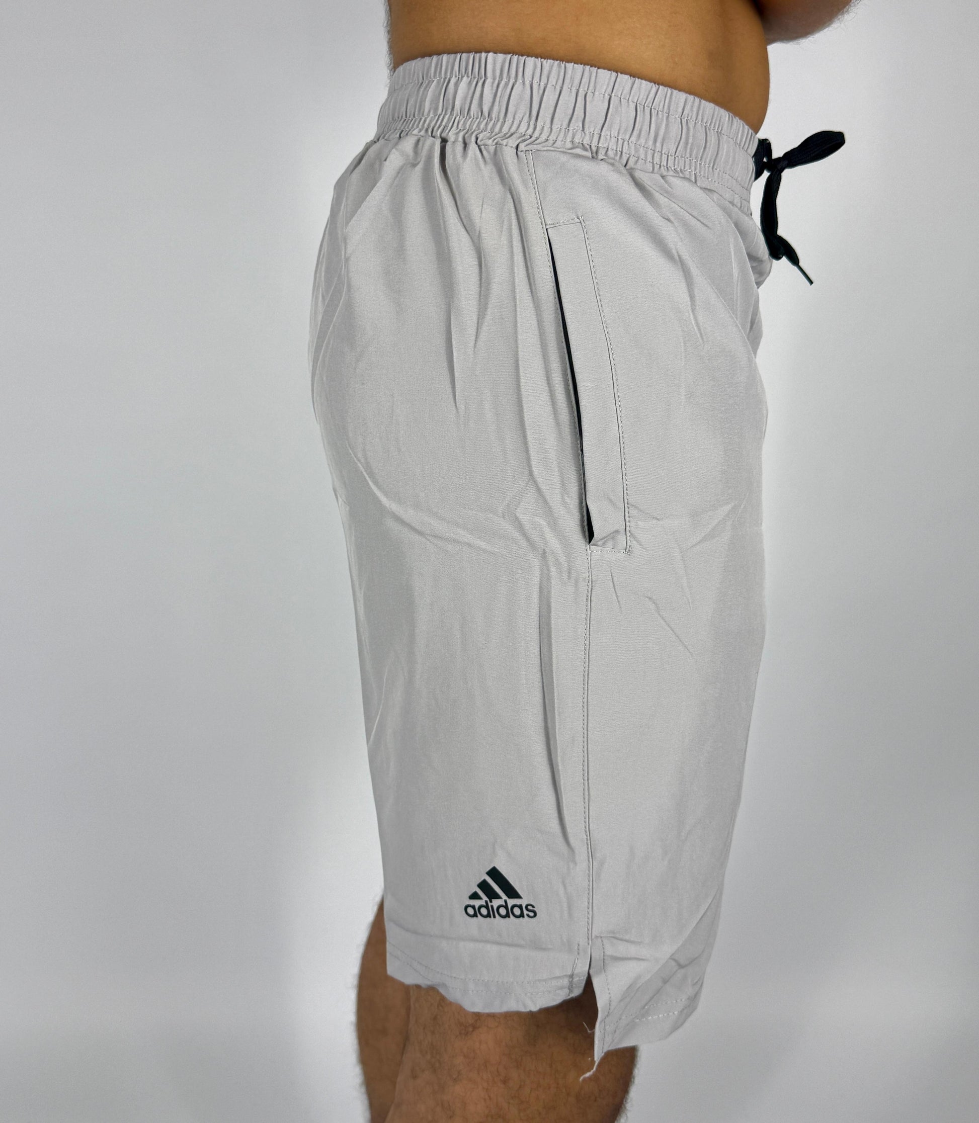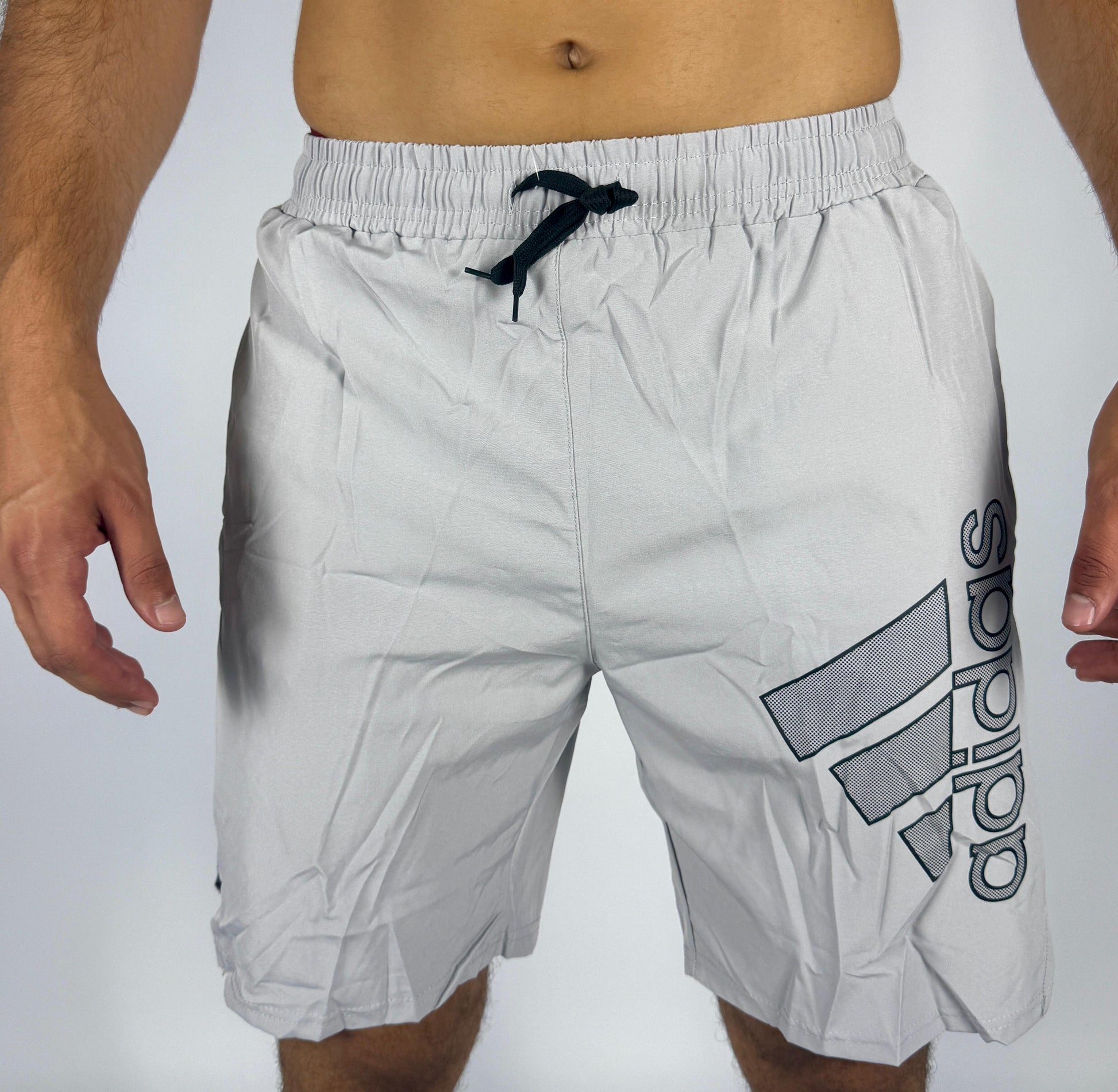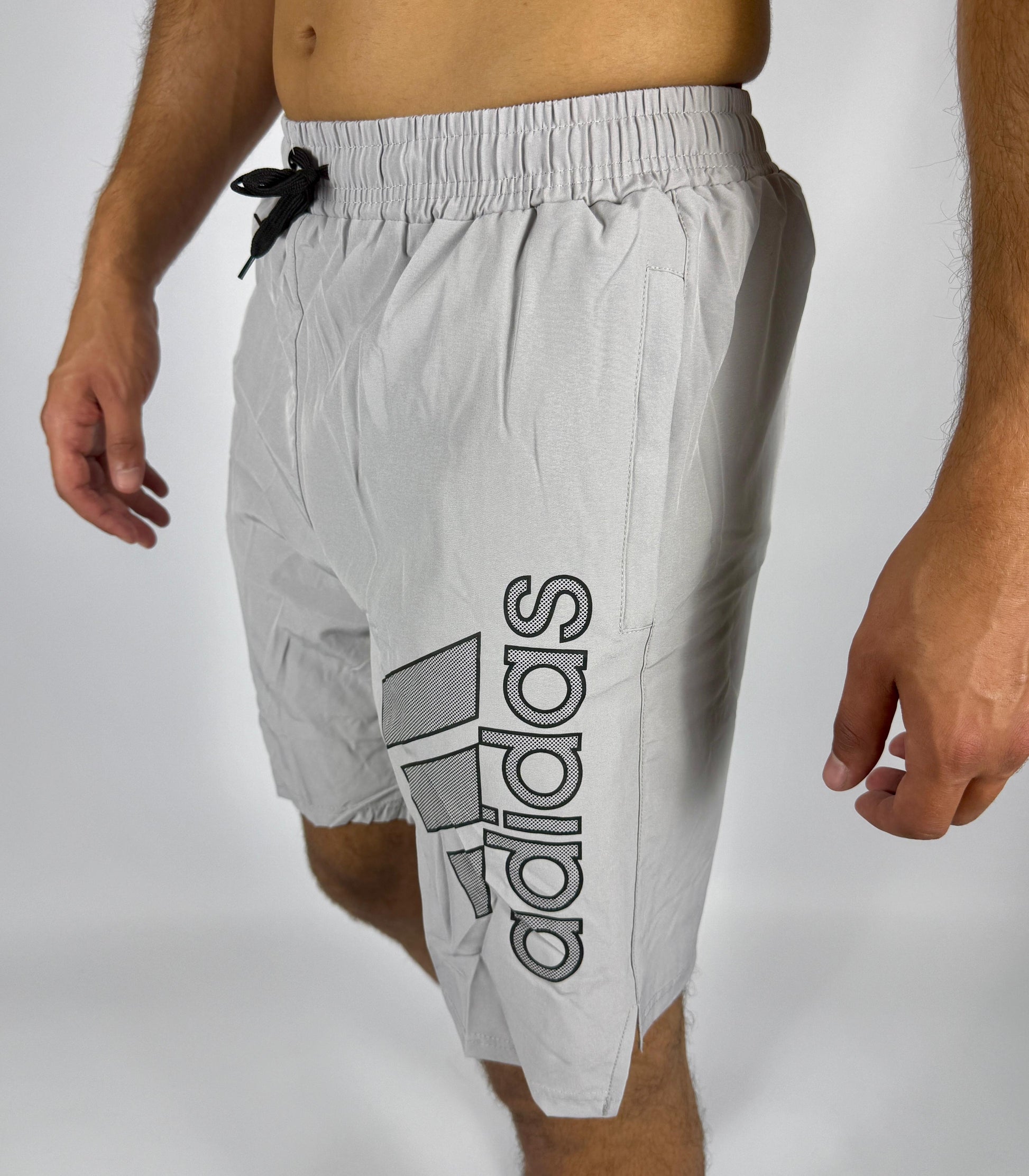 men's light gray athletic shorts featuring an elastic waistband with a black drawstring. A large, stylized dark gray Adidas logo is prominently displayed on the lower right leg, and there's a subtle dark fade effect on the left side of the shorts. Made from a lightweight fabric, they are suitable for sports, training, or casual wear.