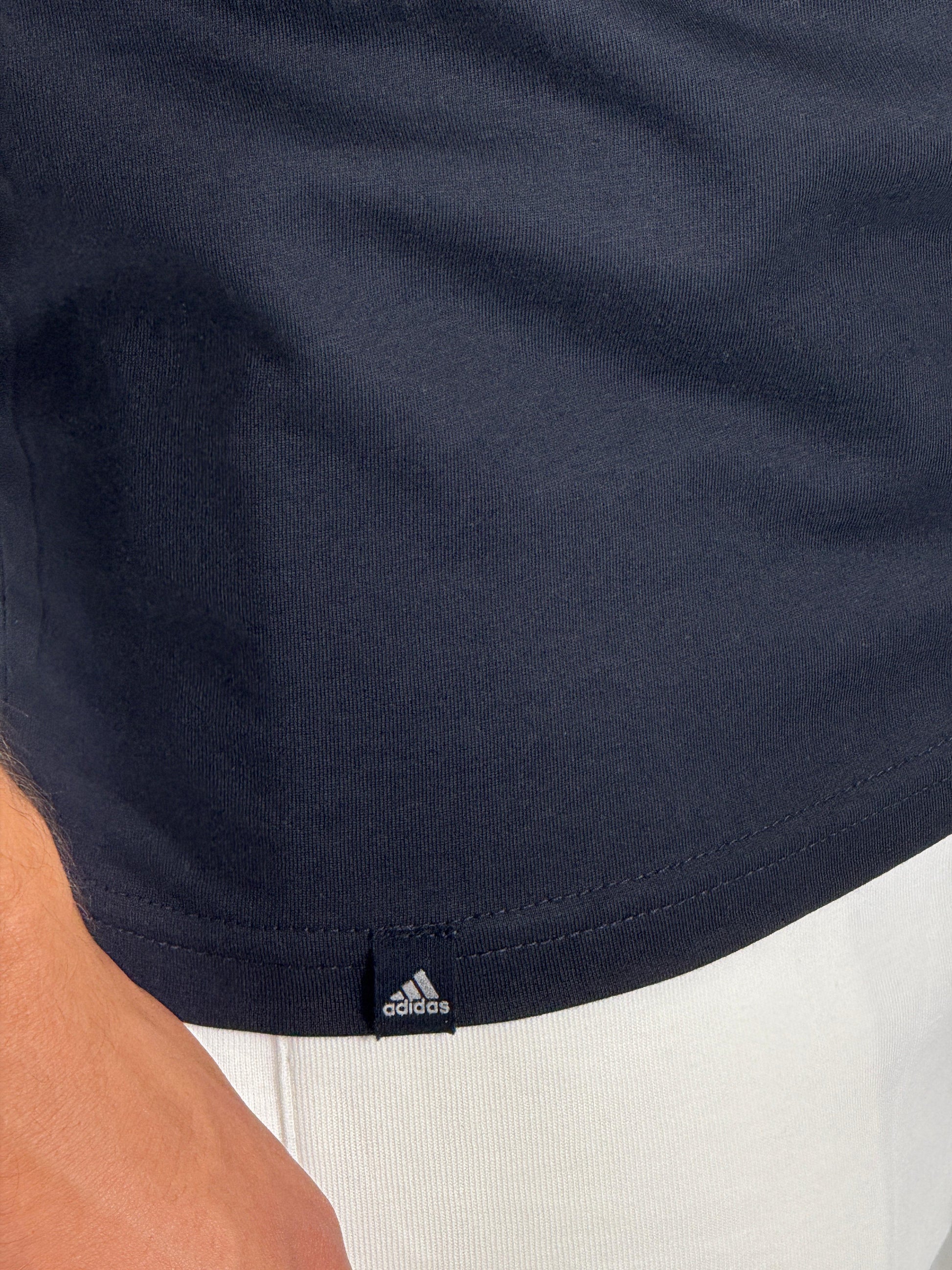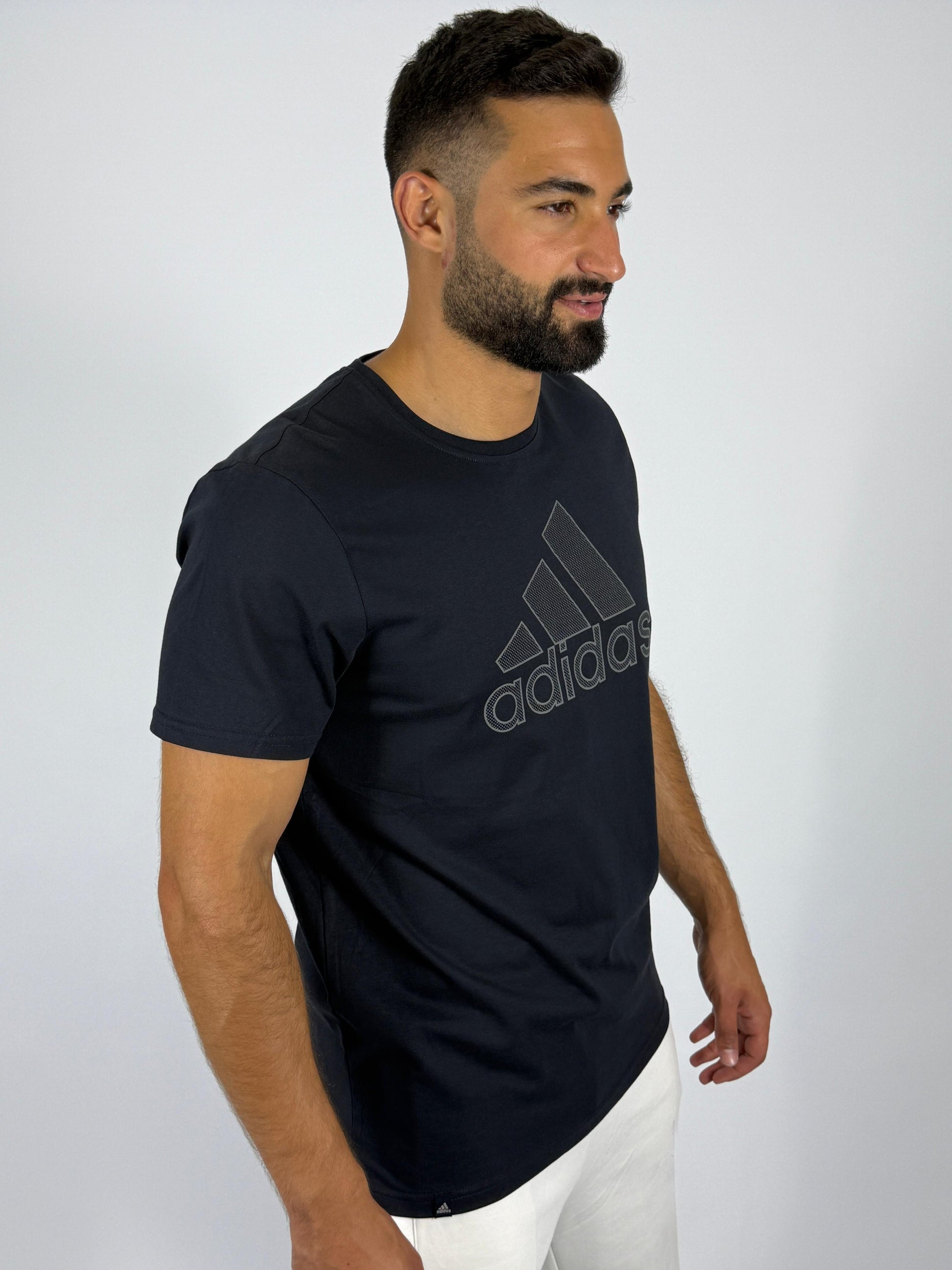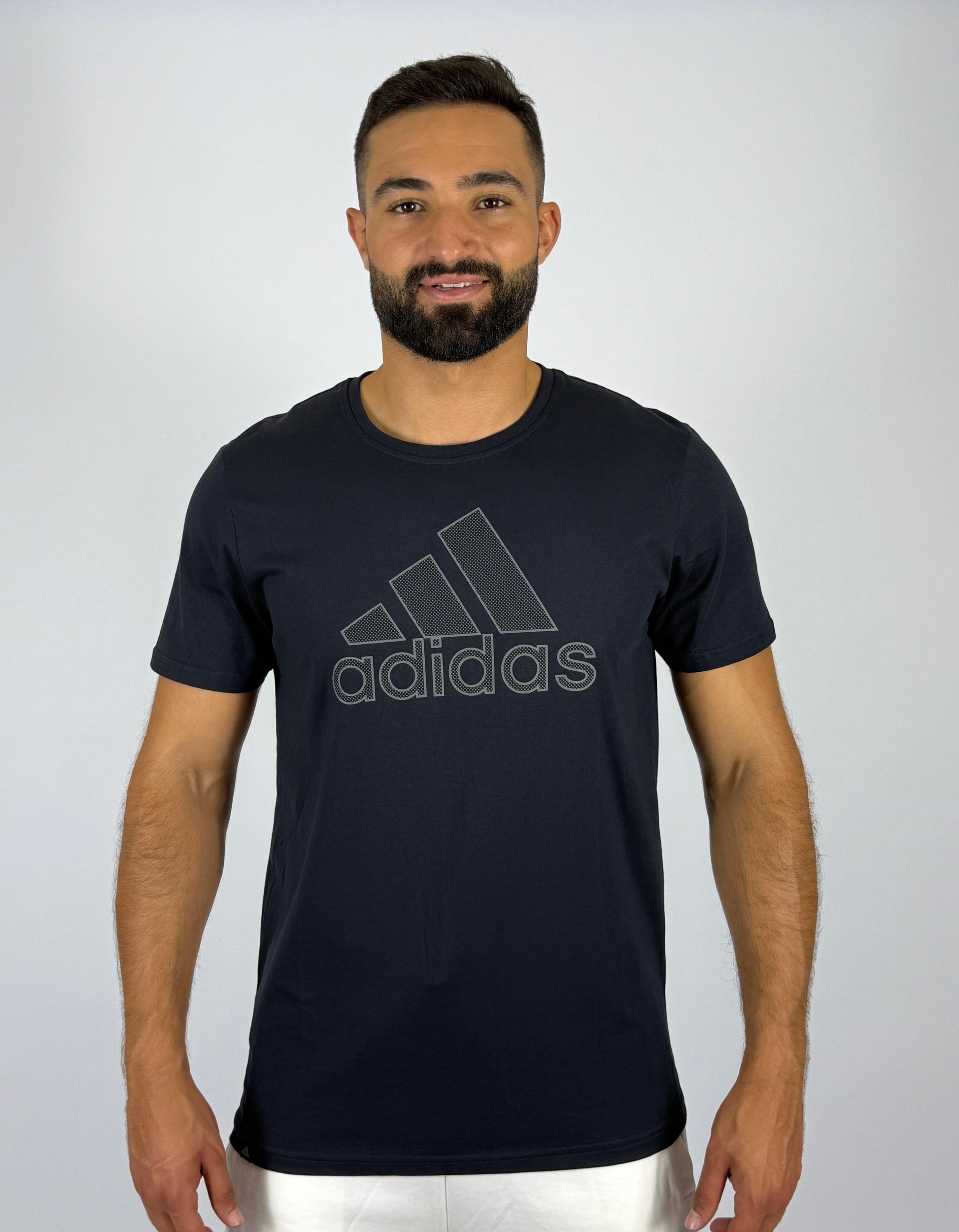 Elevate your everyday comfort with a minimalist touch in the Men's Adidas Outline Badge of Sport Logo T-Shirt. This sleek black tee features the iconic Adidas "Mountain" logo (Badge of Sport) on the chest, rendered not as a solid fill, but as a subtle outline or dotted pattern in a contrasting light grey or white. This understated design offers a sophisticated take on classic Adidas branding.