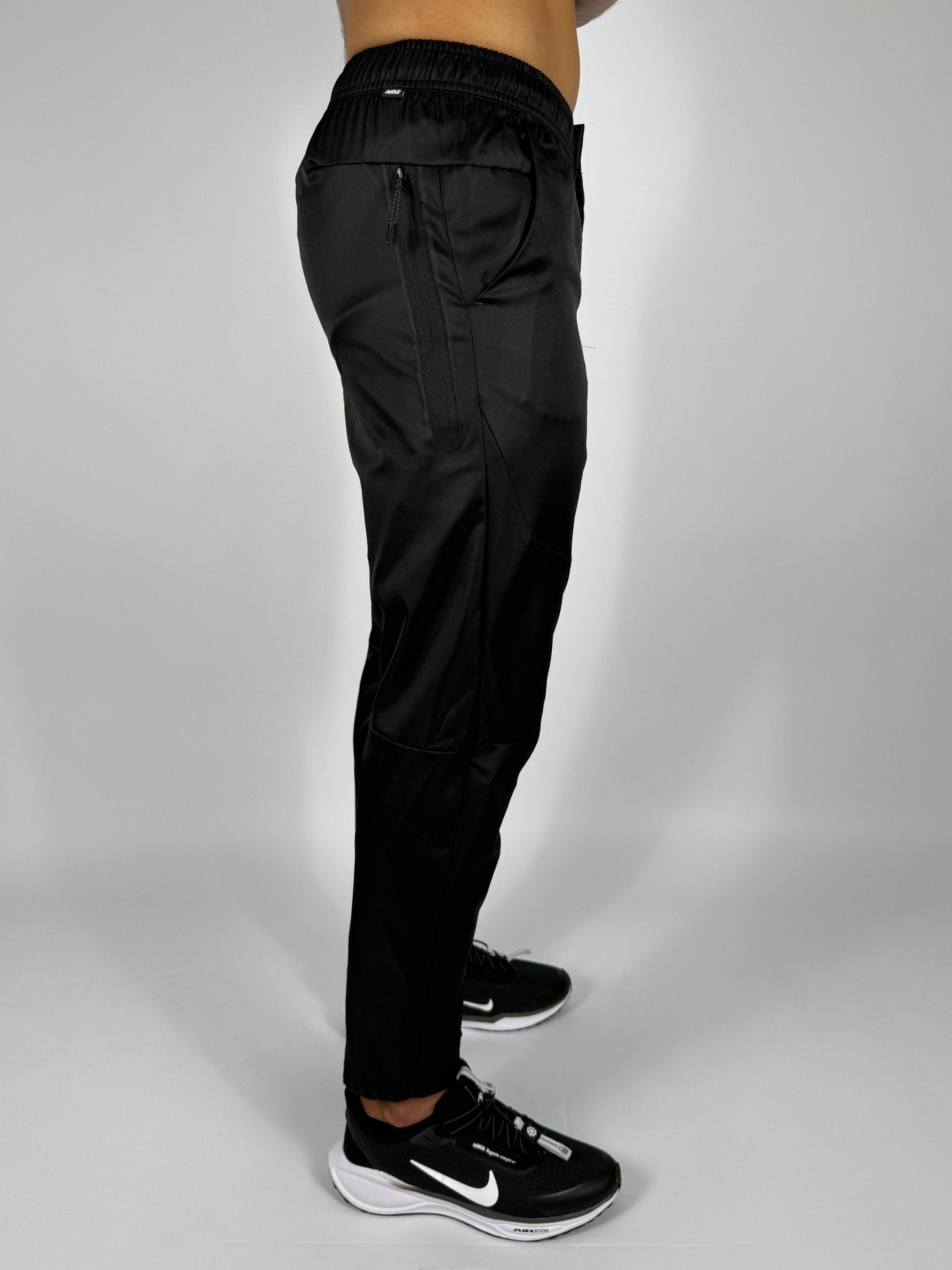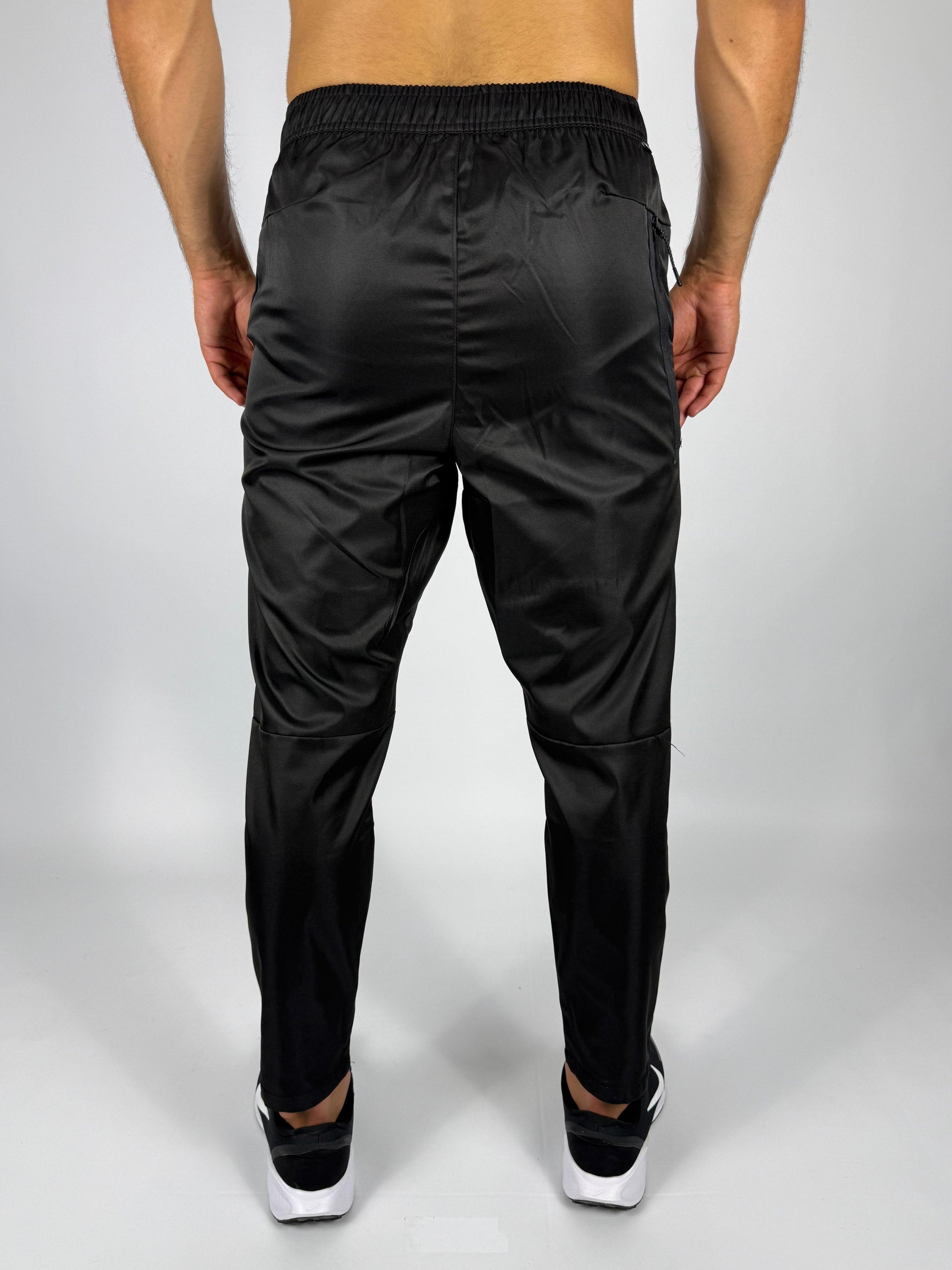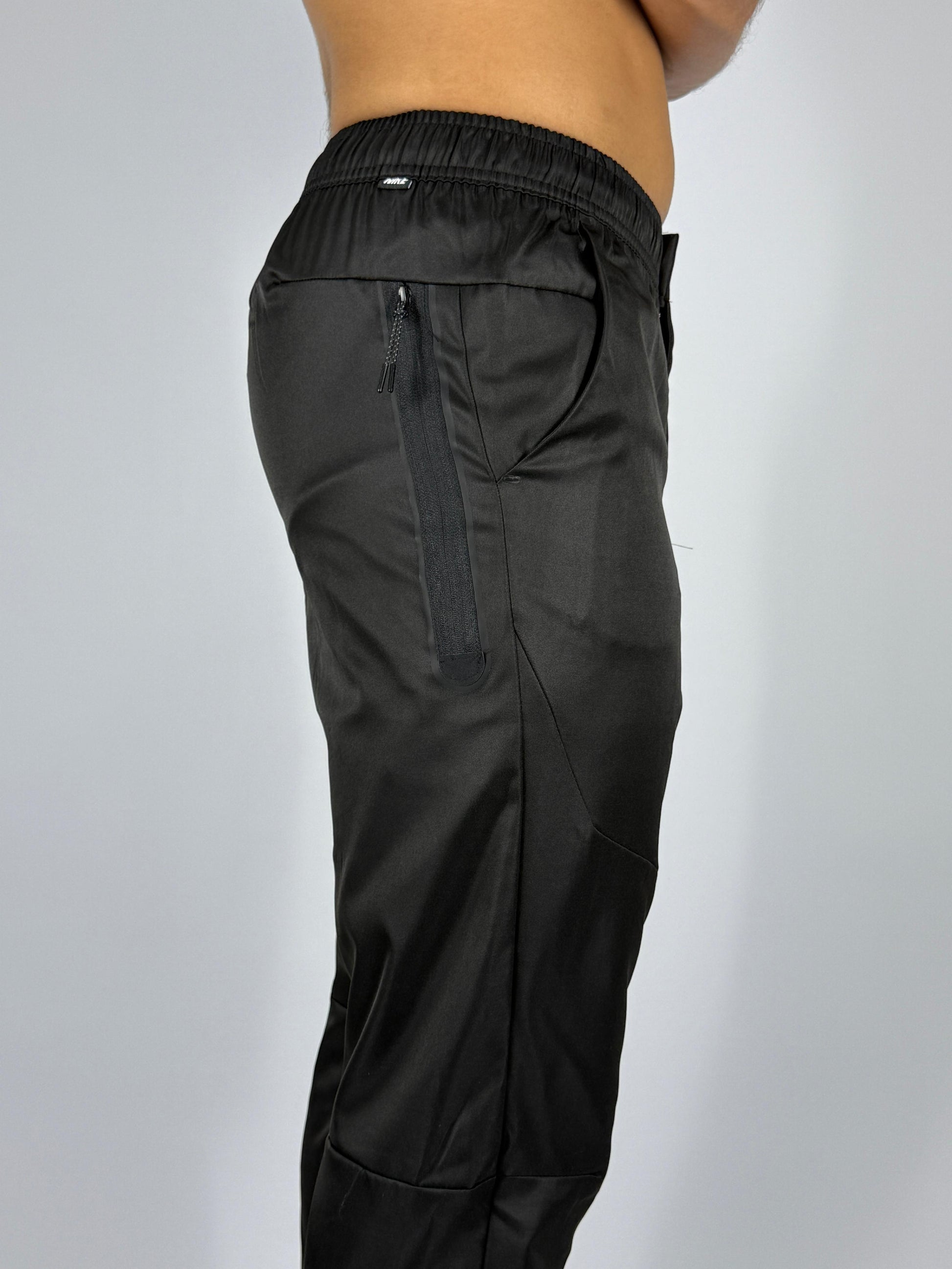 These are men's black track pants featuring an elasticated waistband, side pockets, and a distinctive zippered utility pocket on the upper left thigh. The material appears to be smooth and suitable for athletic or casual wear, offering both comfort and functionality.