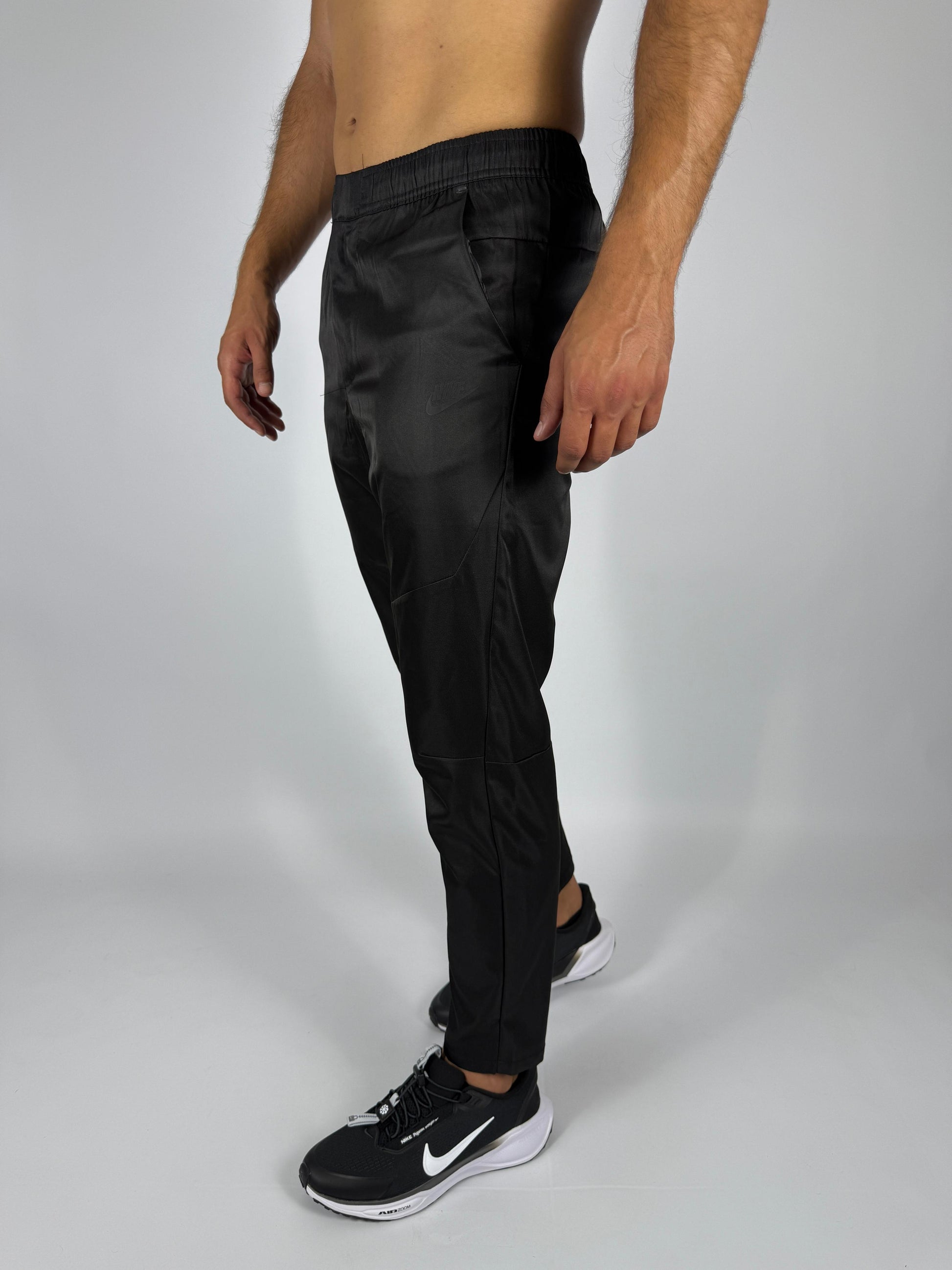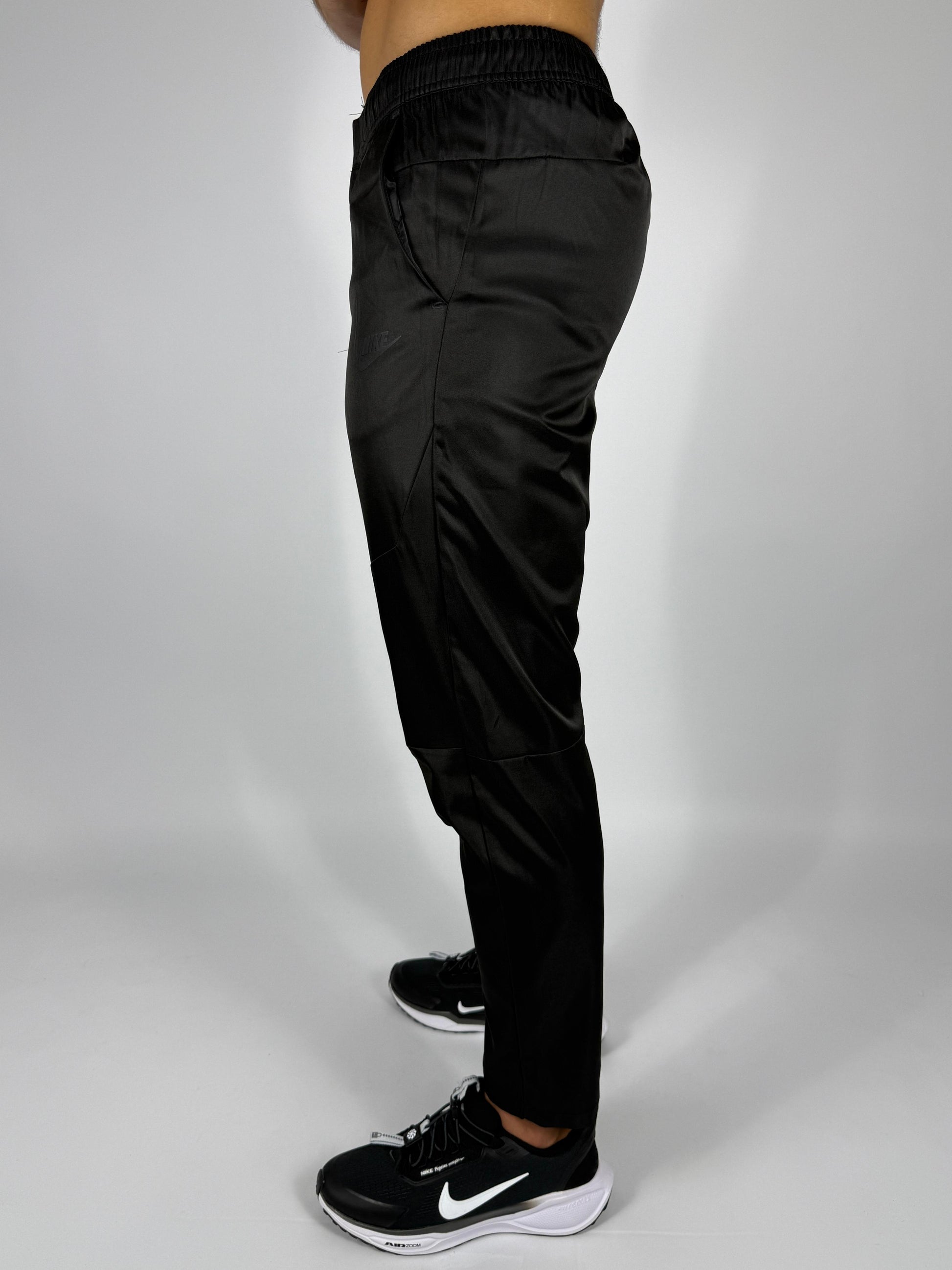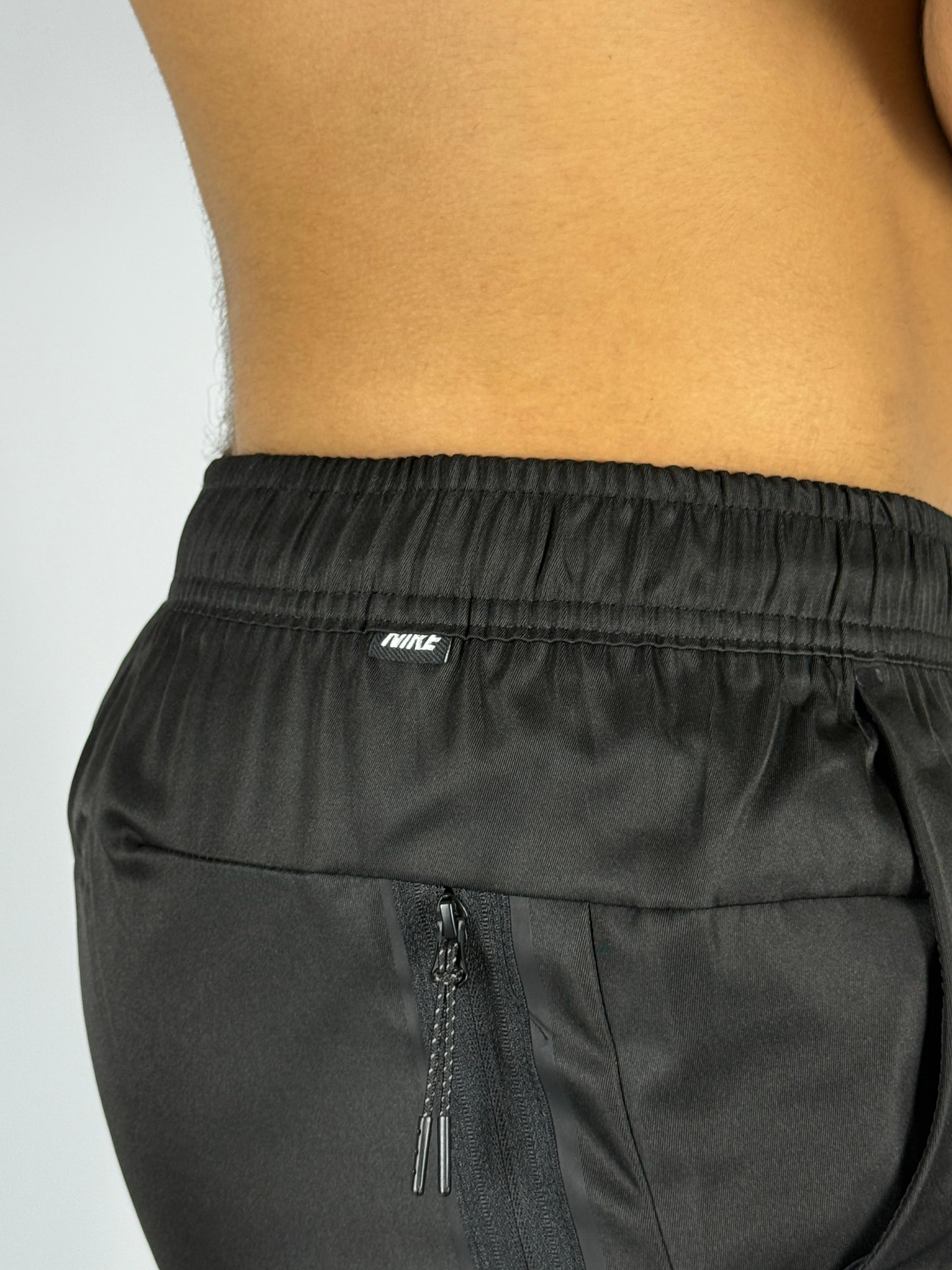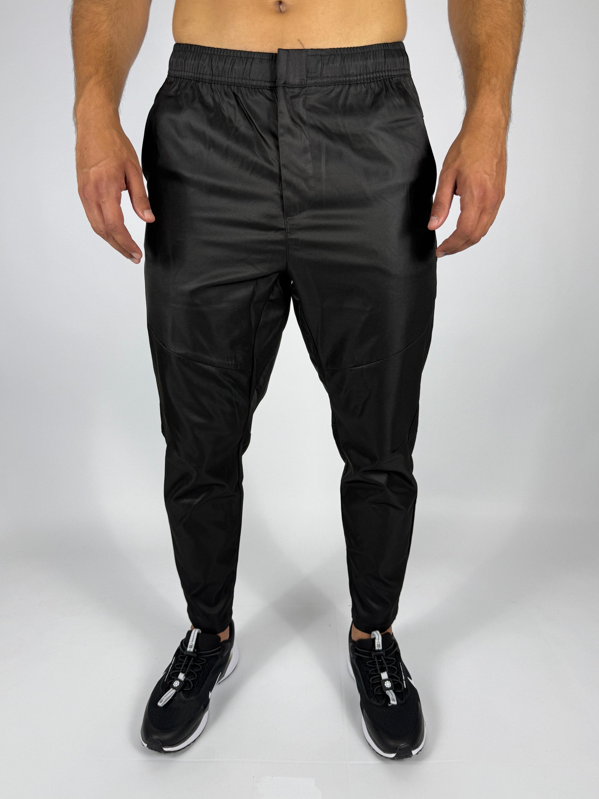 These are men's black track pants featuring an elasticated waistband, side pockets, and a distinctive zippered utility pocket on the upper left thigh. The material appears to be smooth and suitable for athletic or casual wear, offering both comfort and functionality.
