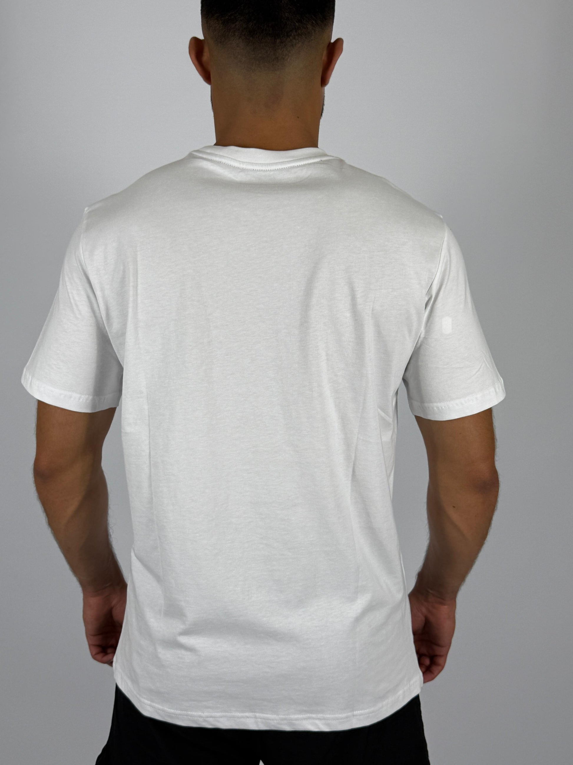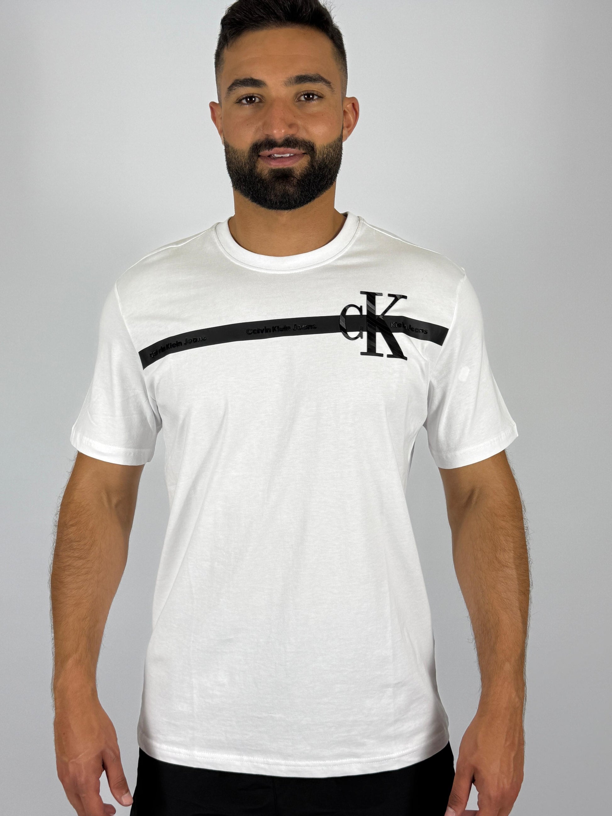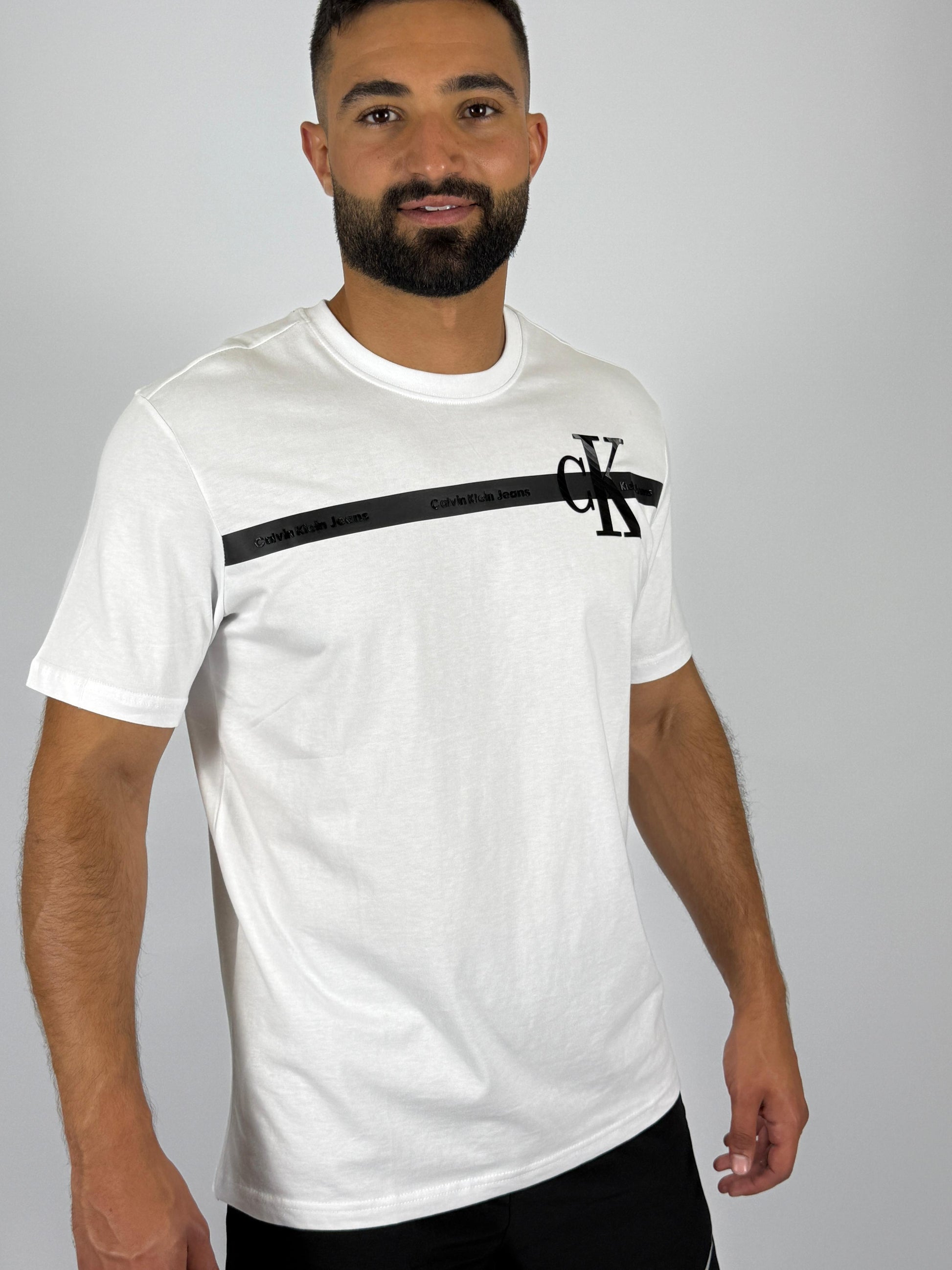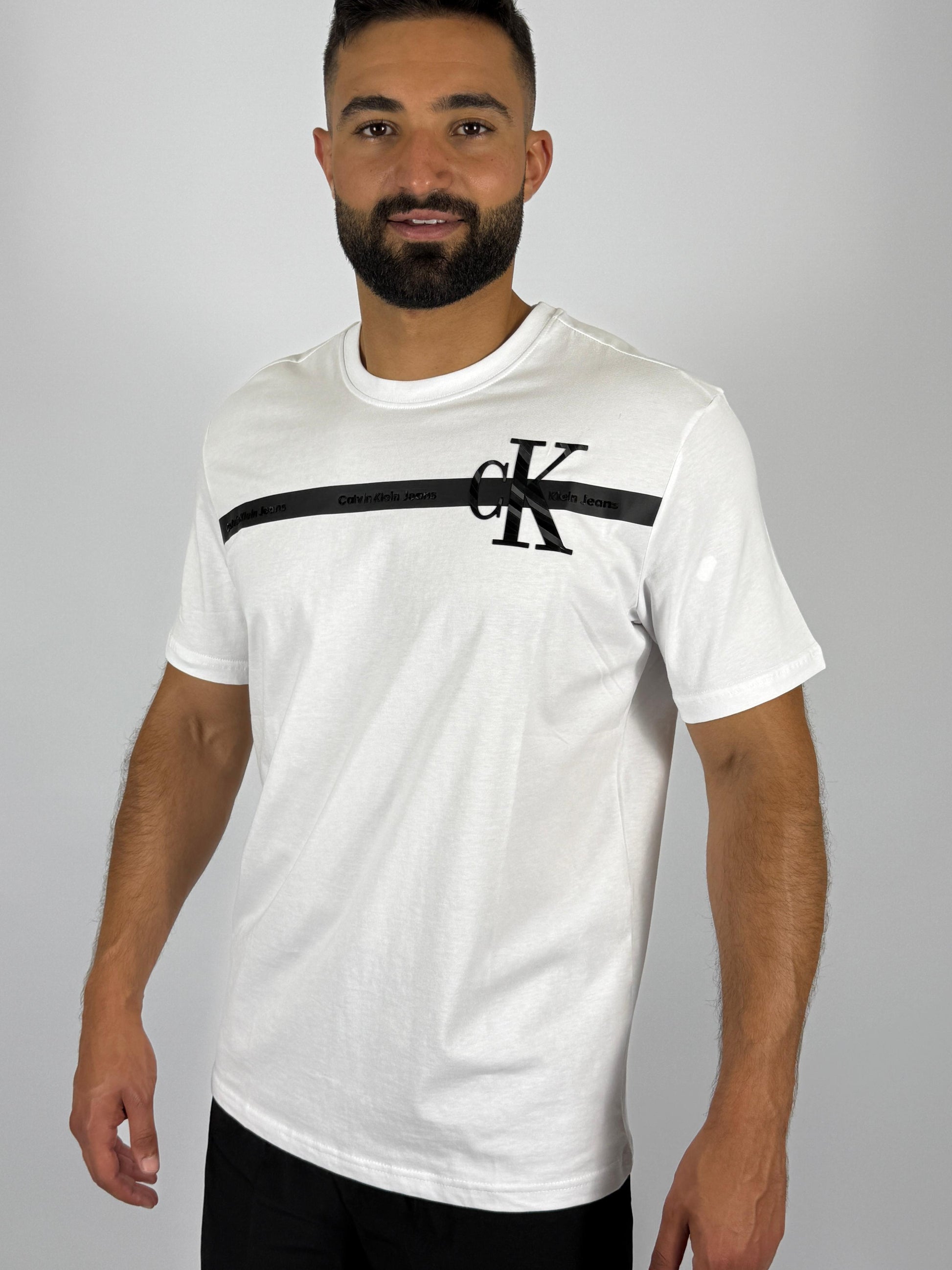 Elevate your casual wardrobe with this white Calvin Klein t-shirt. It features a bold horizontal black stripe across the chest, incorporating the iconic "CK" monogram logo. Crafted for comfort and modern style, this tee is a versatile addition to any look.
