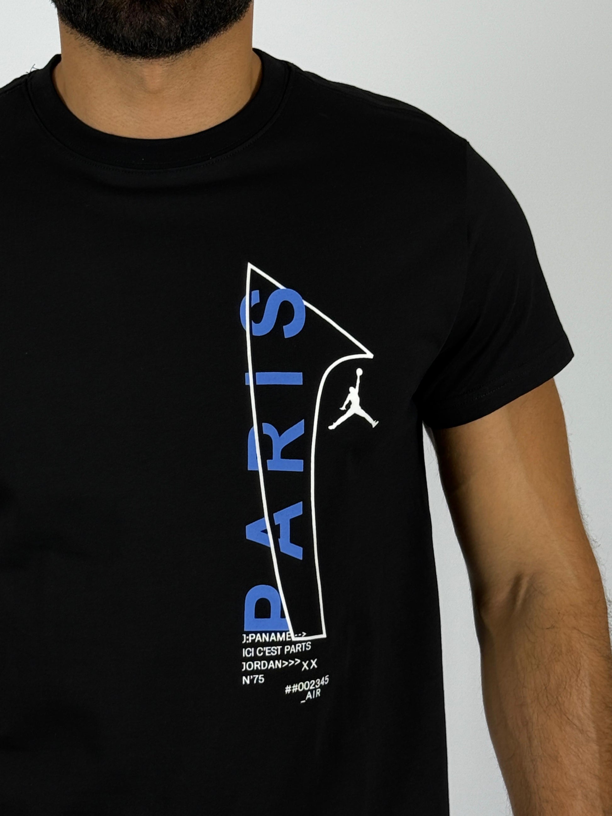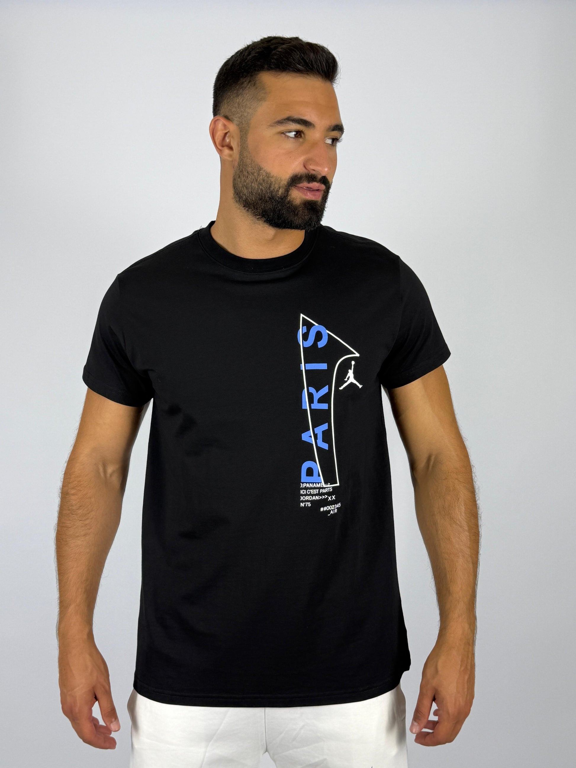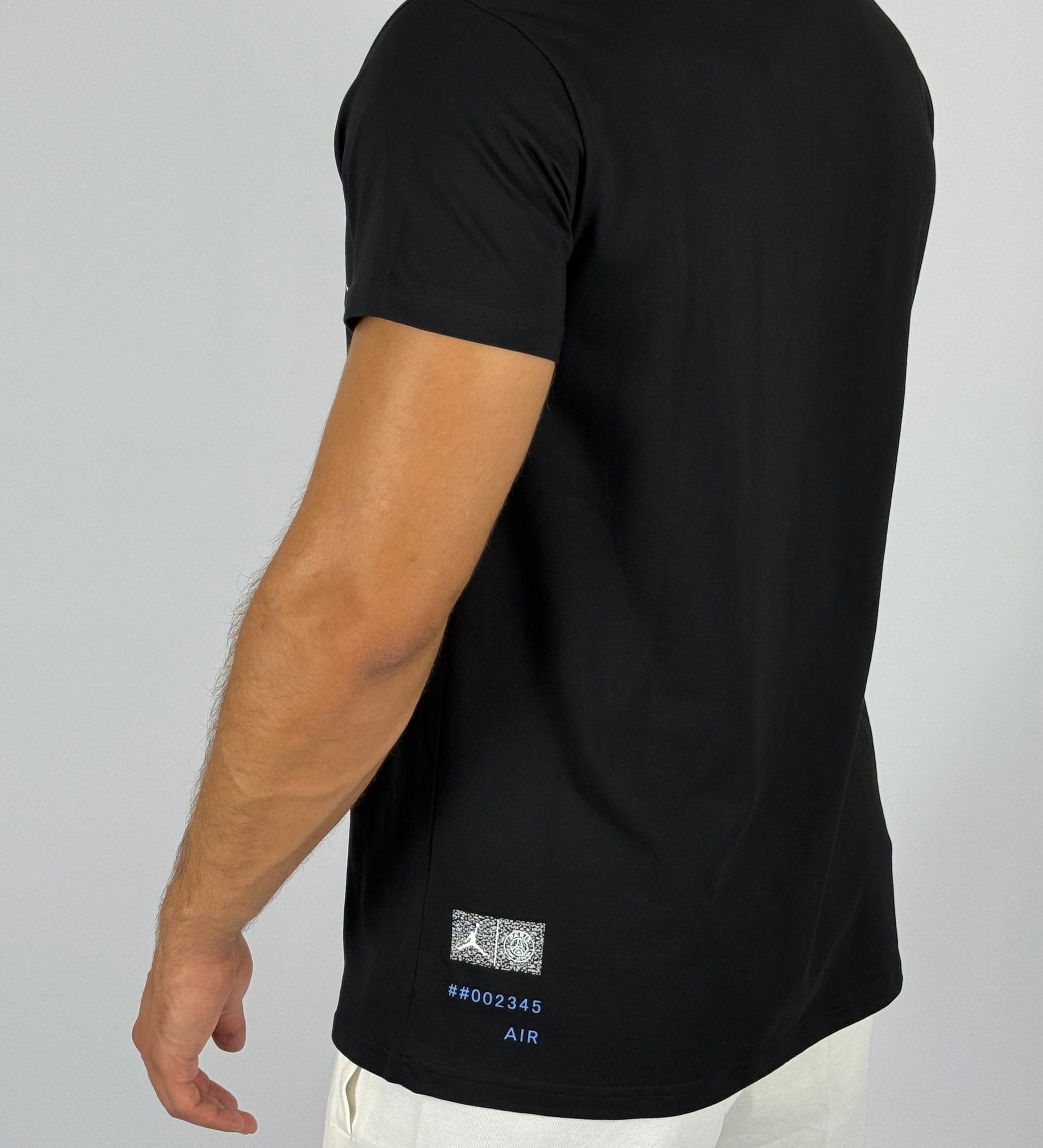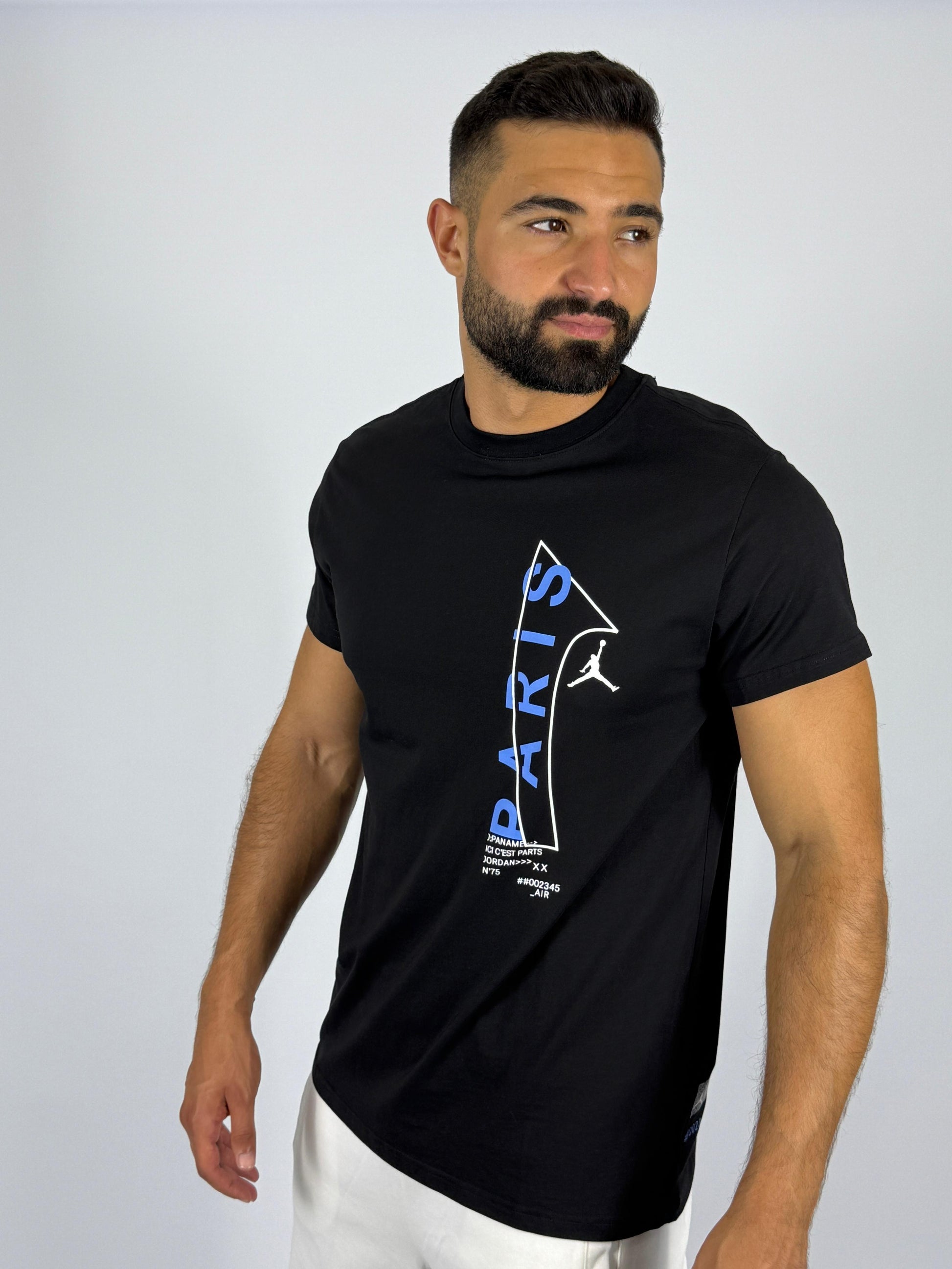 Unite the worlds of basketball and football with the exclusive Jordan x Paris Saint-Germain (PSG) Vertical Logo T-Shirt. This stylish black tee celebrates the iconic collaboration between the legendary Jordan brand and the Parisian football giants, offering a unique blend of streetwear cool and athletic heritage.