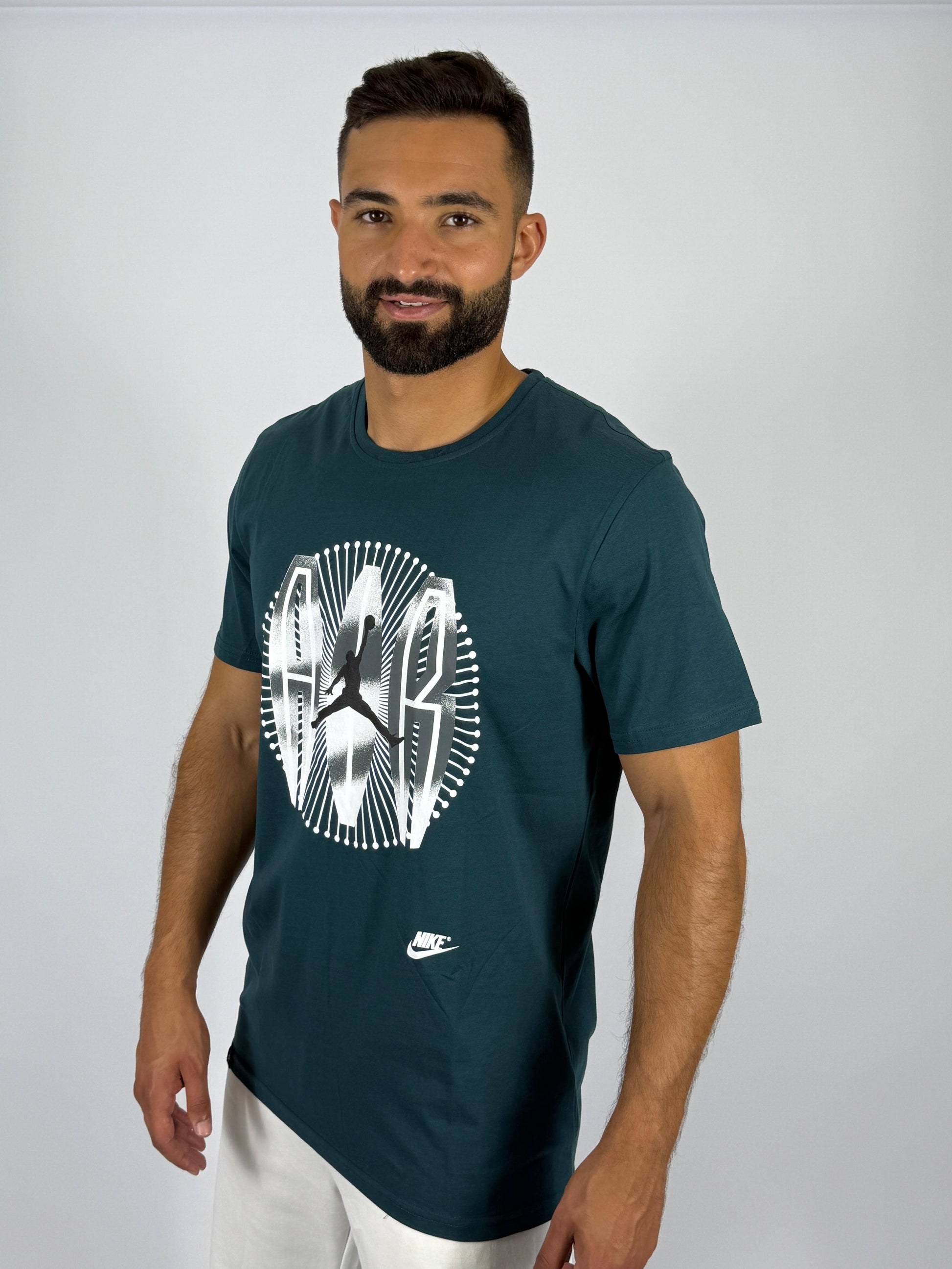 Elevate your street style with the striking Men's Nike Air Jordan Radial Graphic T-Shirt. This dark teal (or deep green-blue) tee features a bold, circular "AIR JORDAN" graphic on the chest. The design incorporates the iconic Jumpman logo at its center, surrounded by radial lines and stylized text, creating a dynamic and modern interpretation of the legendary brand.
