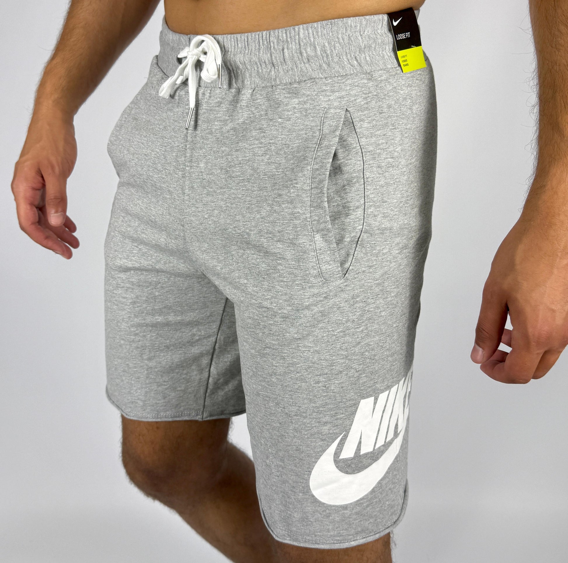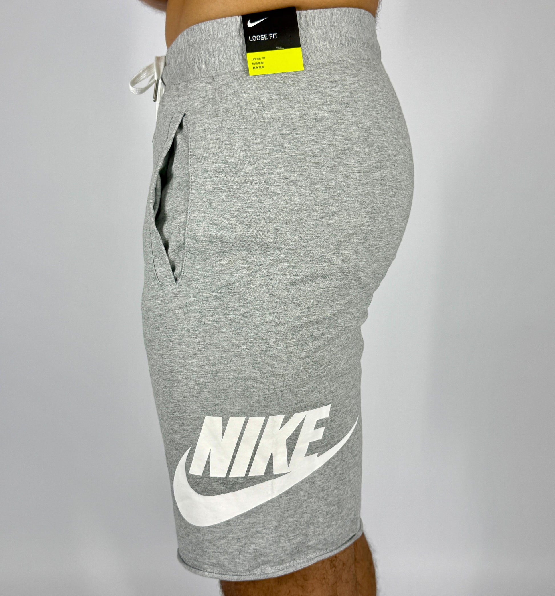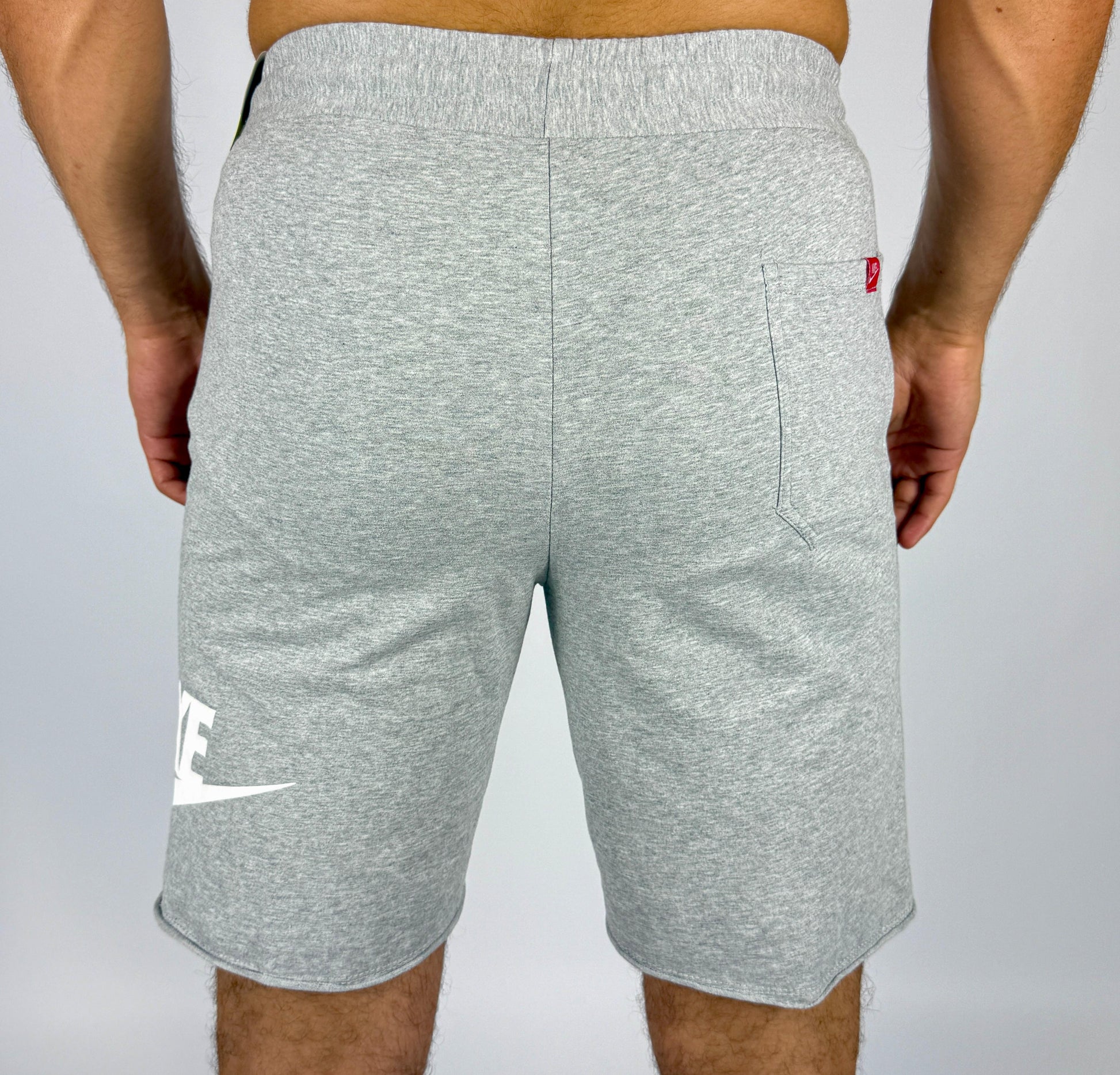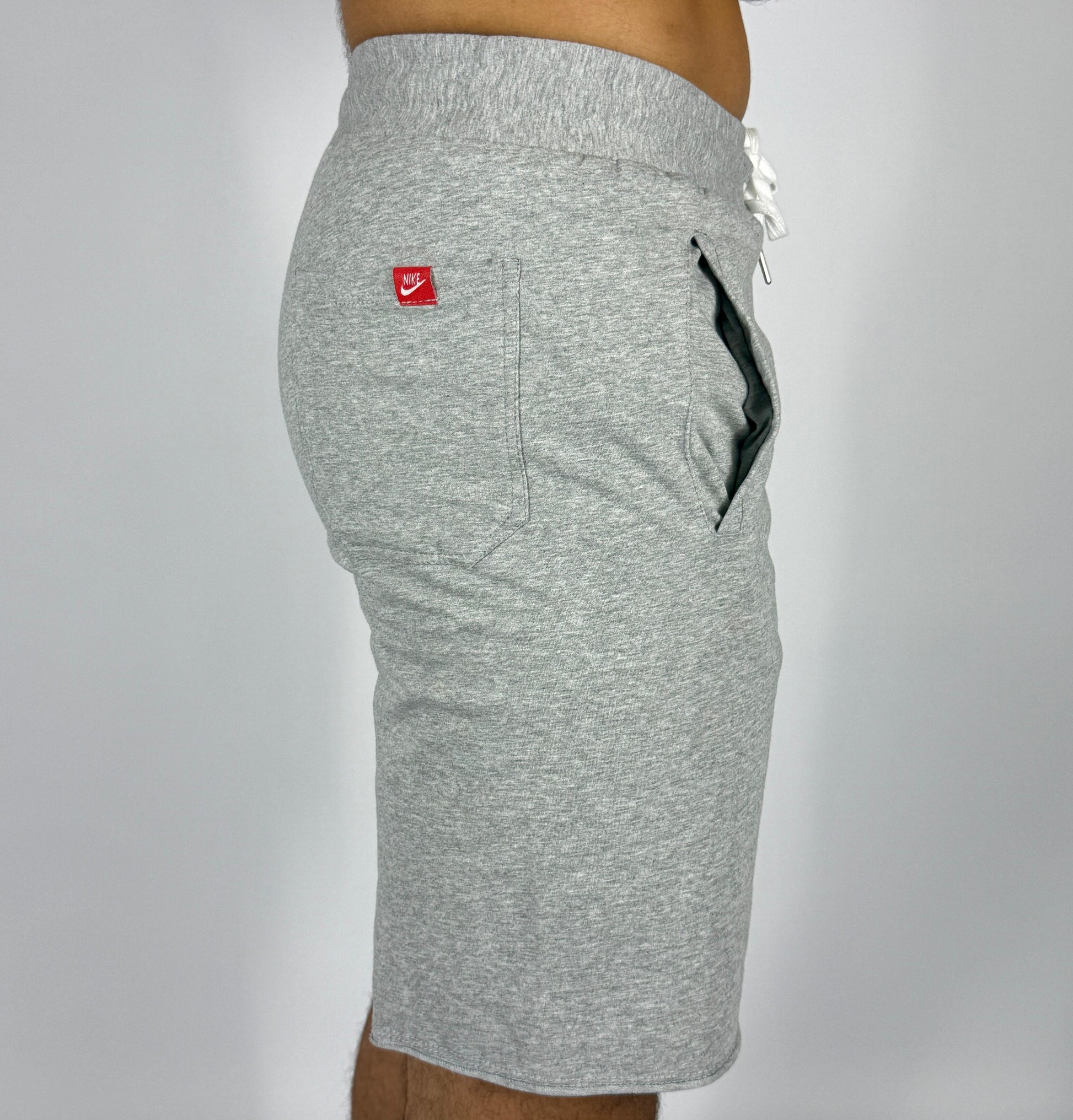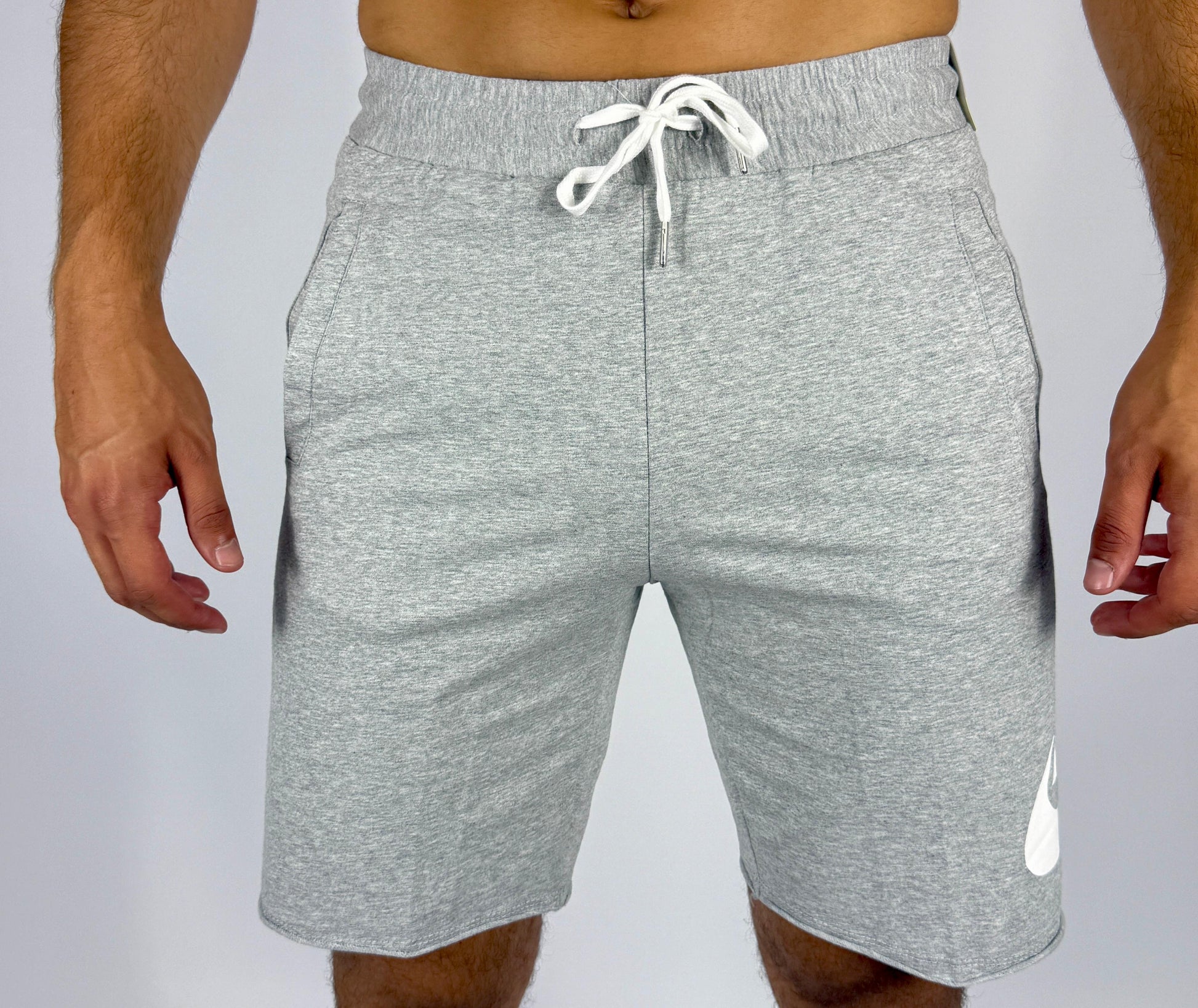 men's light grey marl fleece shorts featuring a comfortable elastic waistband with a white drawstring. They include side pockets and a large, prominent white Nike logo on the lower left leg. The soft, breathable fabric is suitable for athletic activities, casual wear, or lounging.