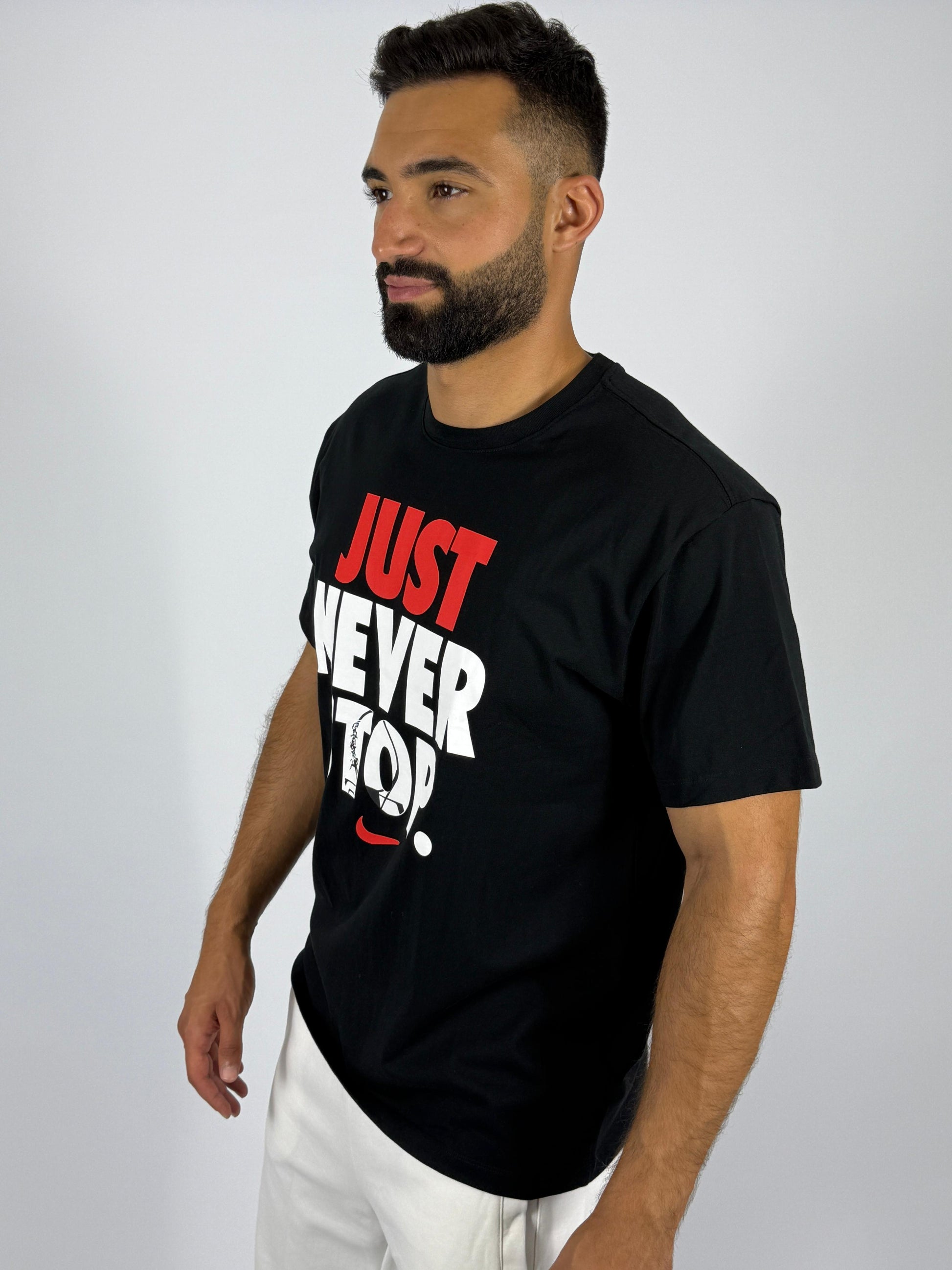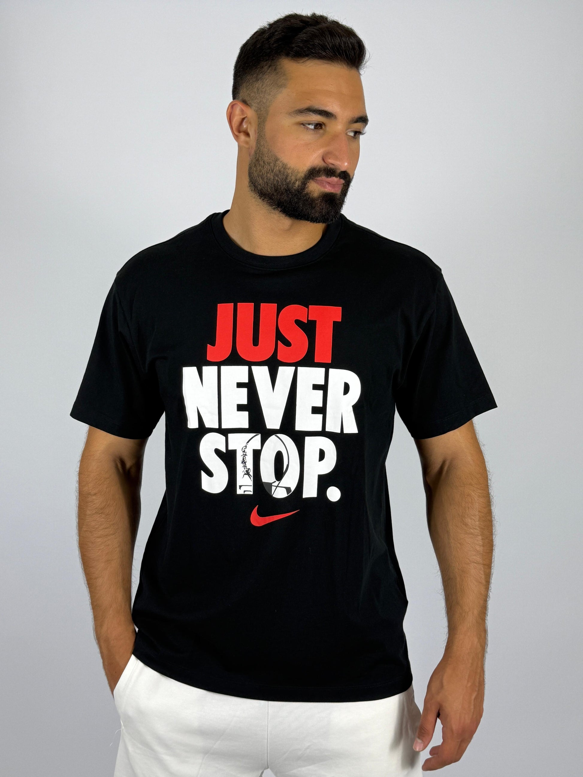 Fuel your drive and showcase your relentless spirit with the Nike "Just Never Stop." Graphic T-Shirt. This essential black tee is designed for those who live life on the go, whether you're hitting the gym, the track, or simply embracing an active lifestyle.