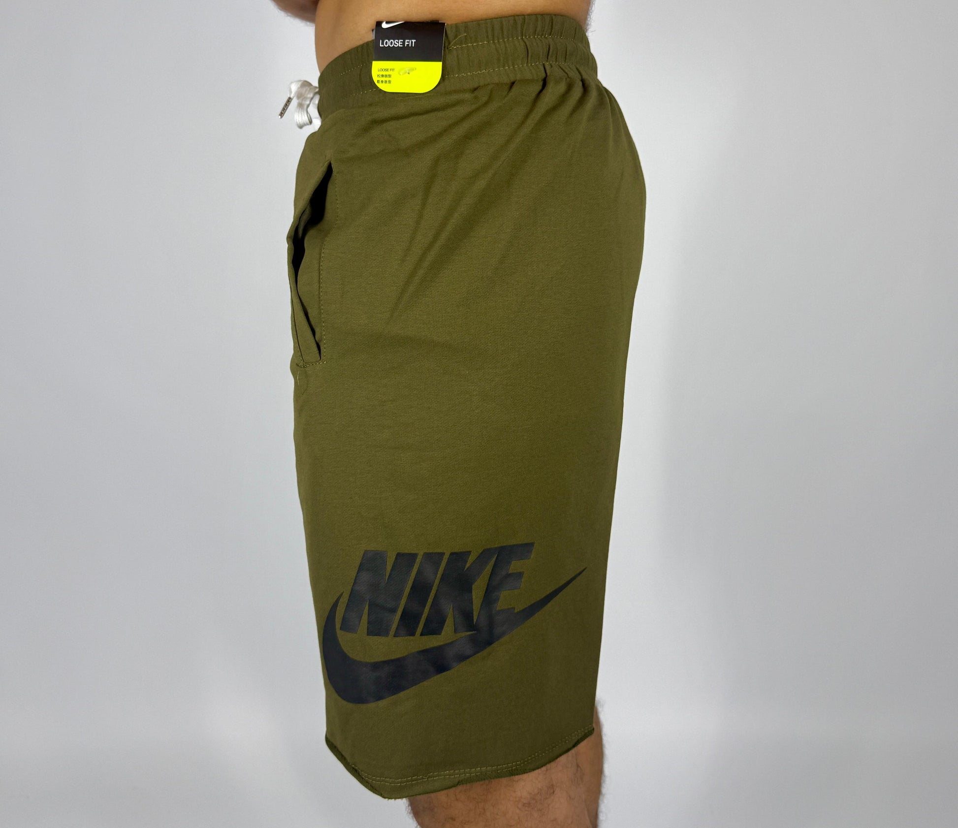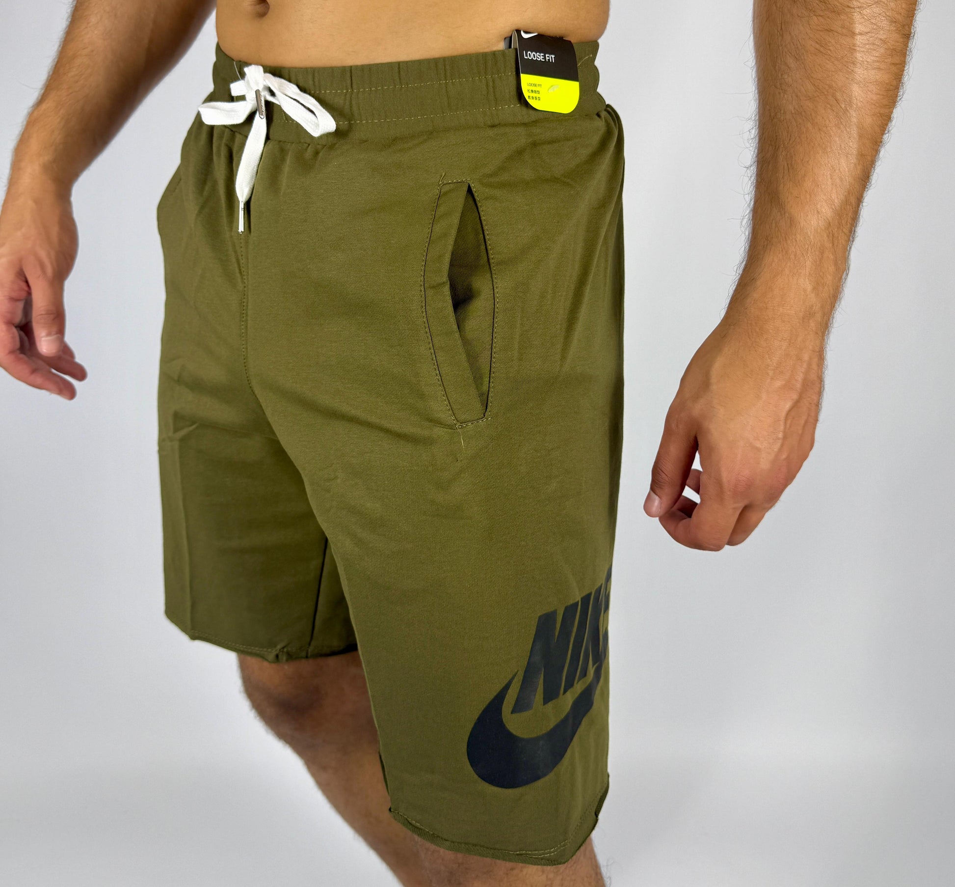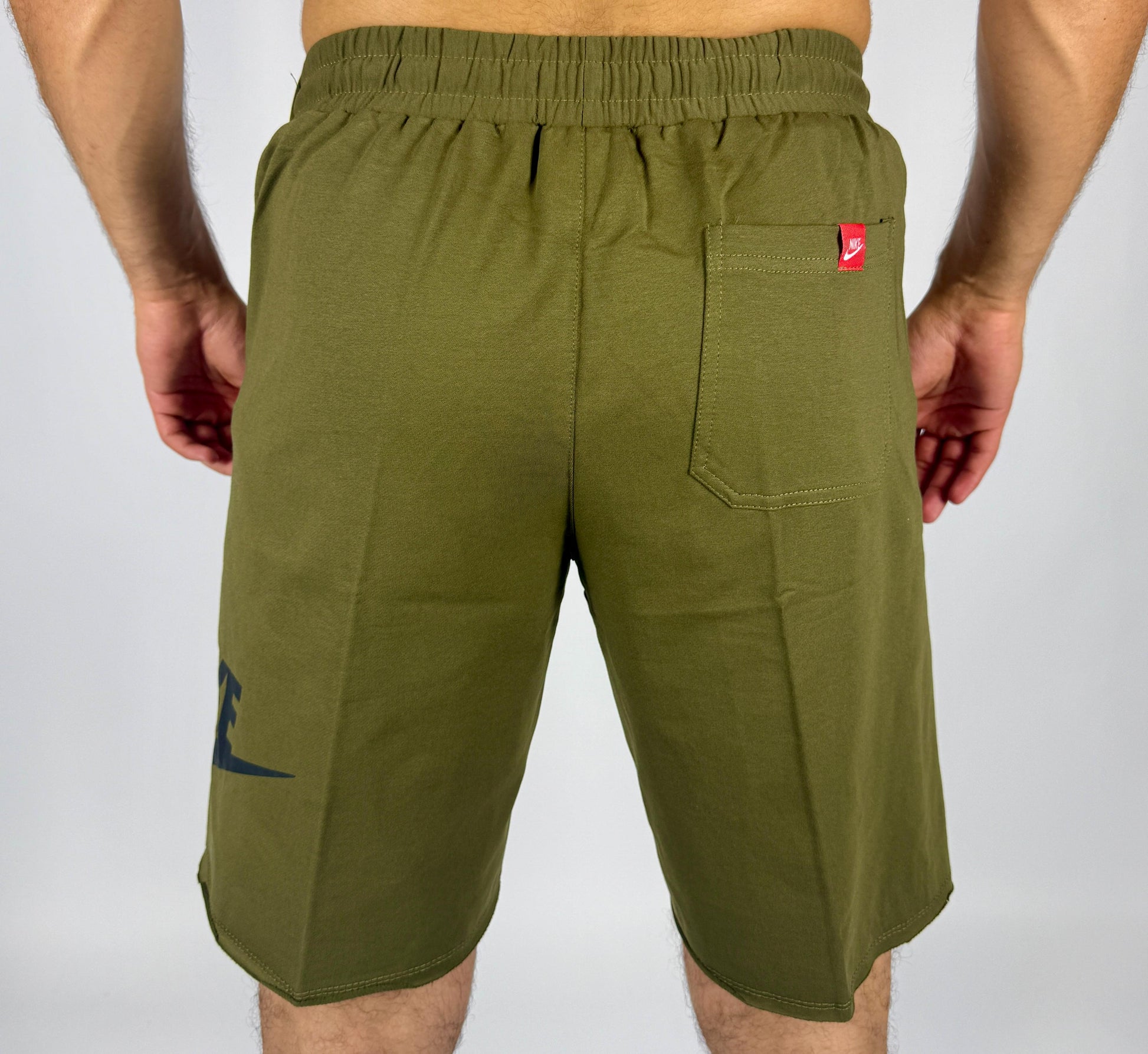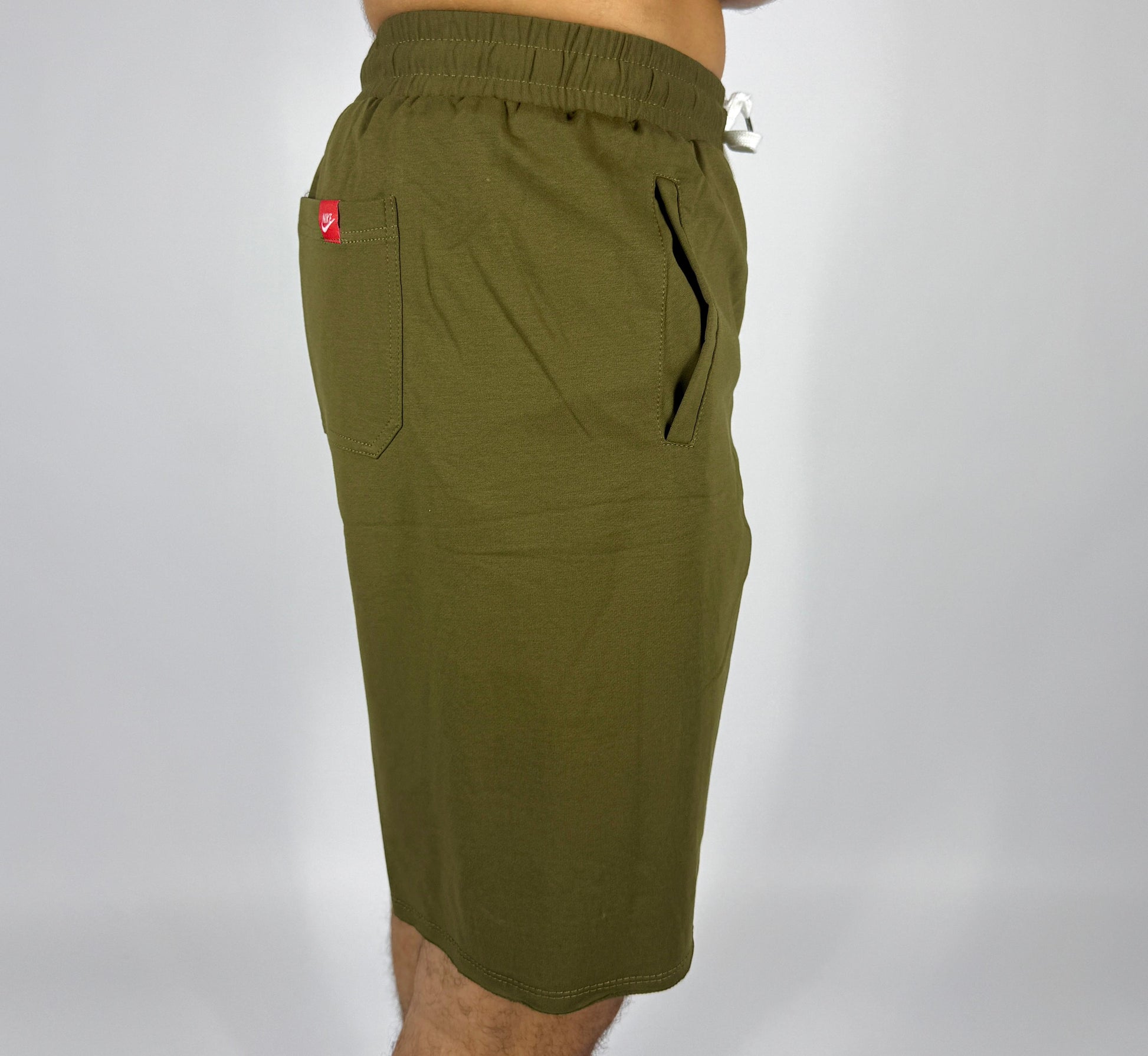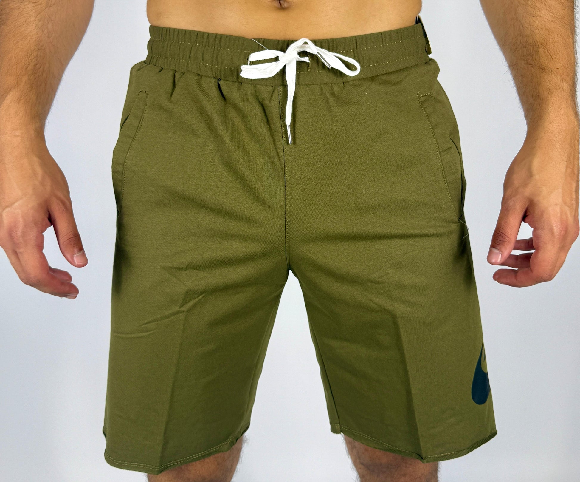men's olive green athletic shorts with an elastic waistband and a white drawstring. They feature side pockets and a subtle dark Nike "swoosh" logo on the lower left leg. The material appears lightweight and practical for sportswear or casual summer wear.