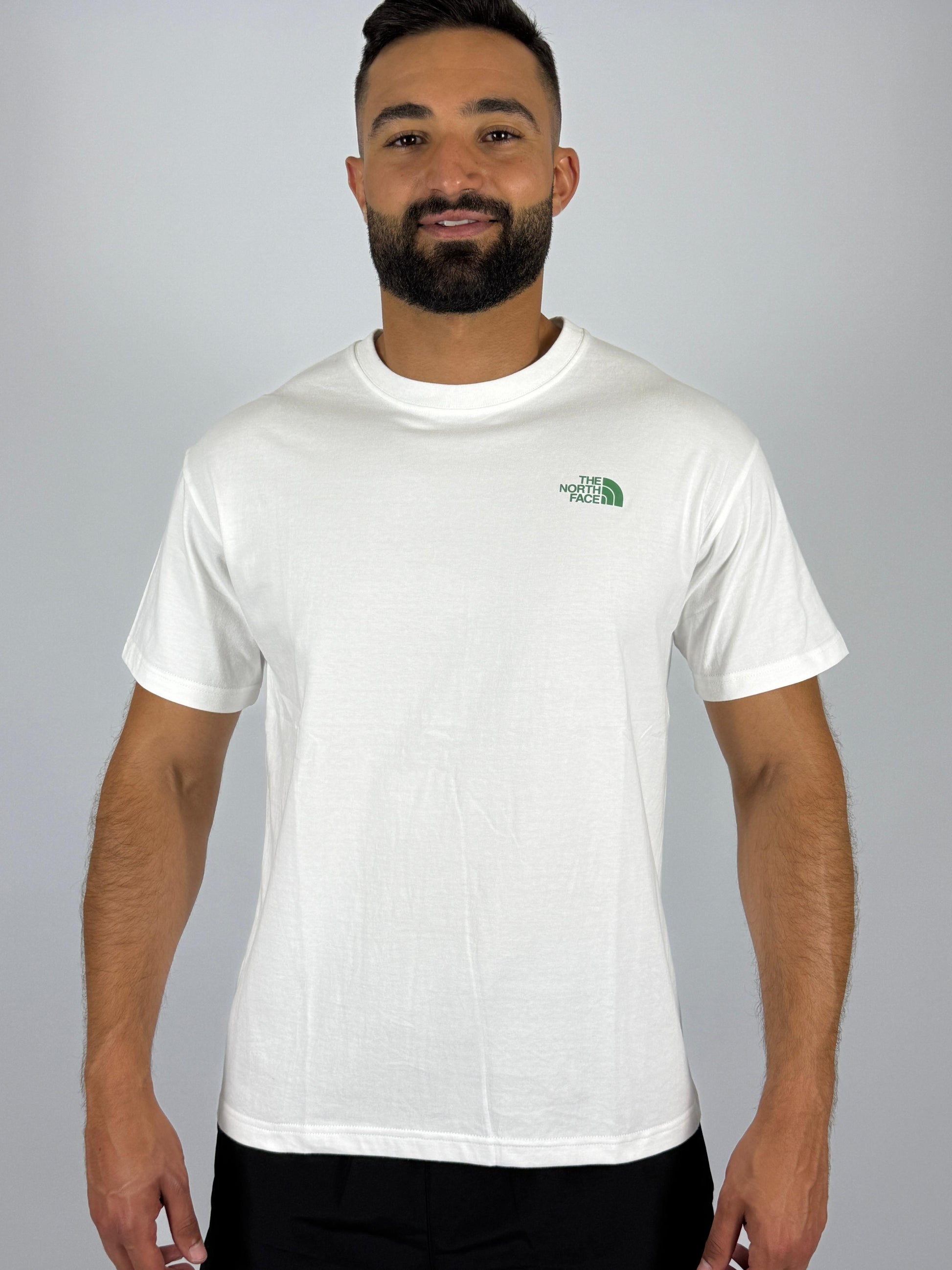 Embrace the outdoors in this white The North Face t-shirt. It features a small, subtle The North Face logo in green on the front chest. The back showcases a unique green graphic of two figures and a tent under the sun, accompanied by the brand's iconic motto, "NEVER STOP EXPLORING." Crafted for comfort and everyday adventure.