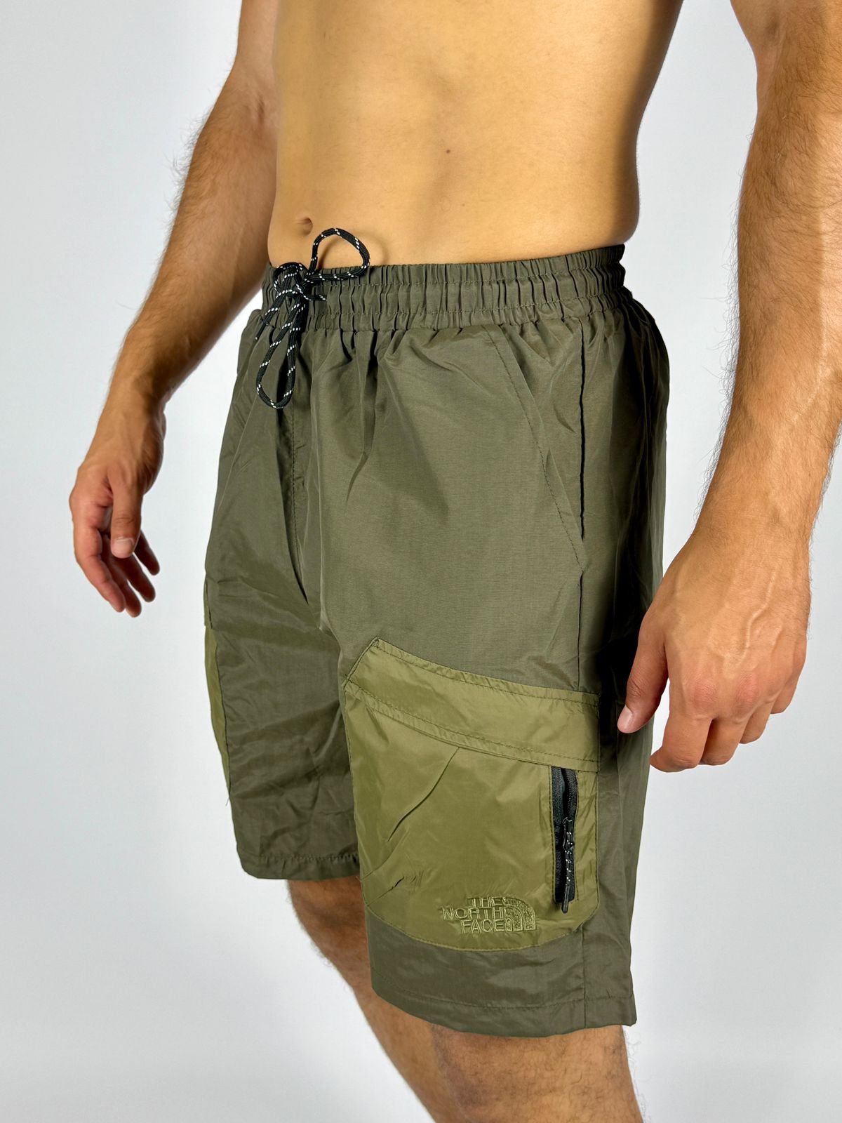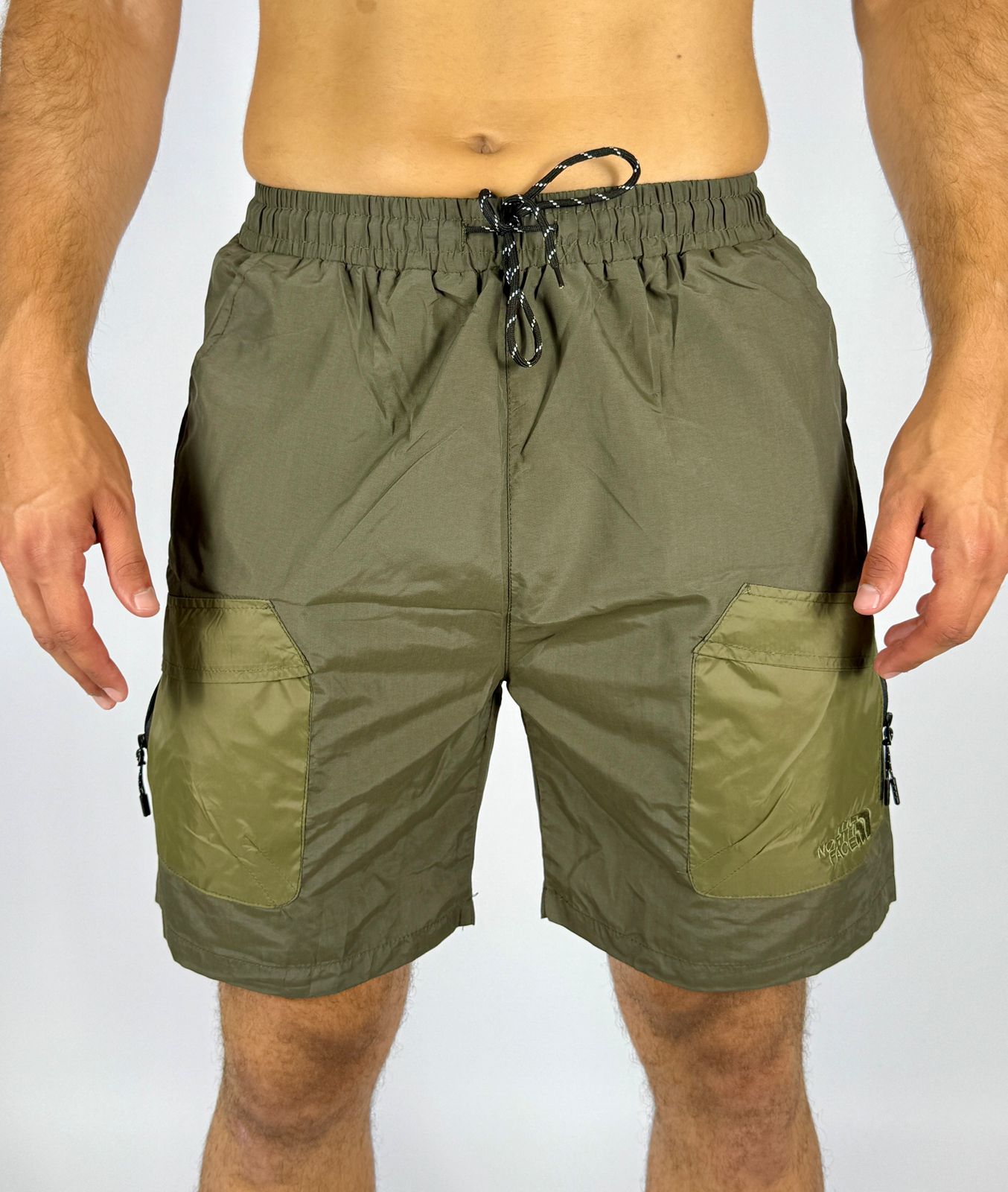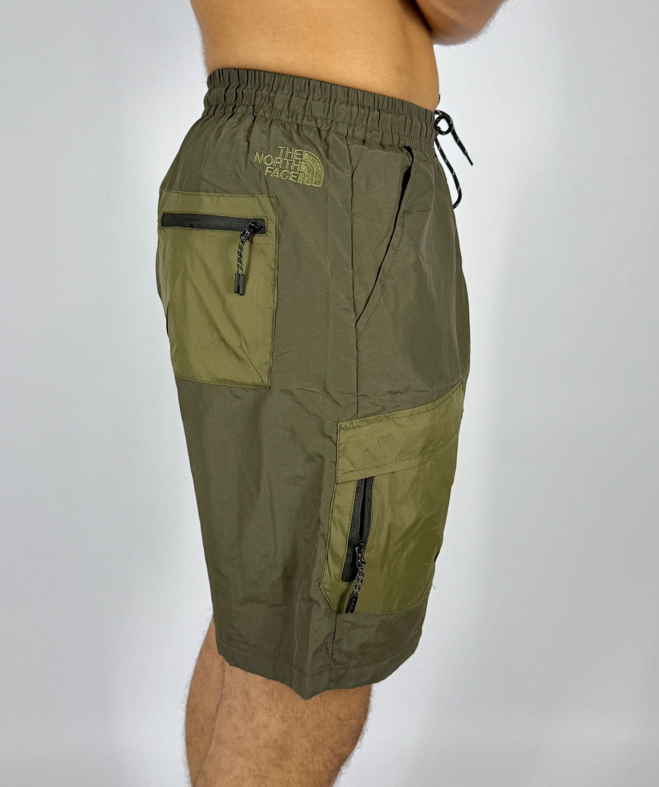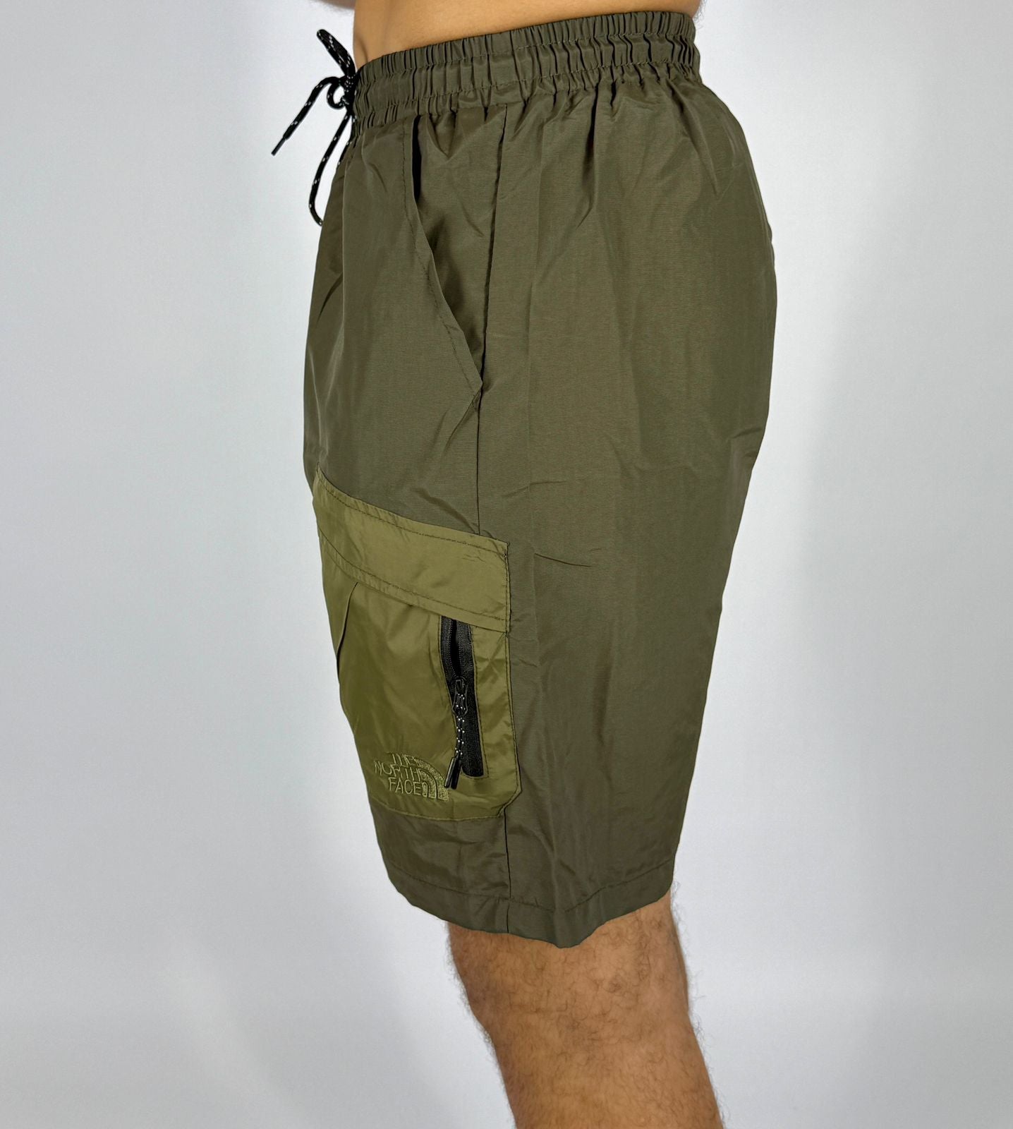 men's olive green cargo shorts with a comfortable elastic waistband and a patterned drawstring. They feature contrasting lighter green cargo pockets on the front of each thigh, one of which has a visible zipper and the subtle The North Face logo. The design is practical for outdoor activities or casual summer wear.