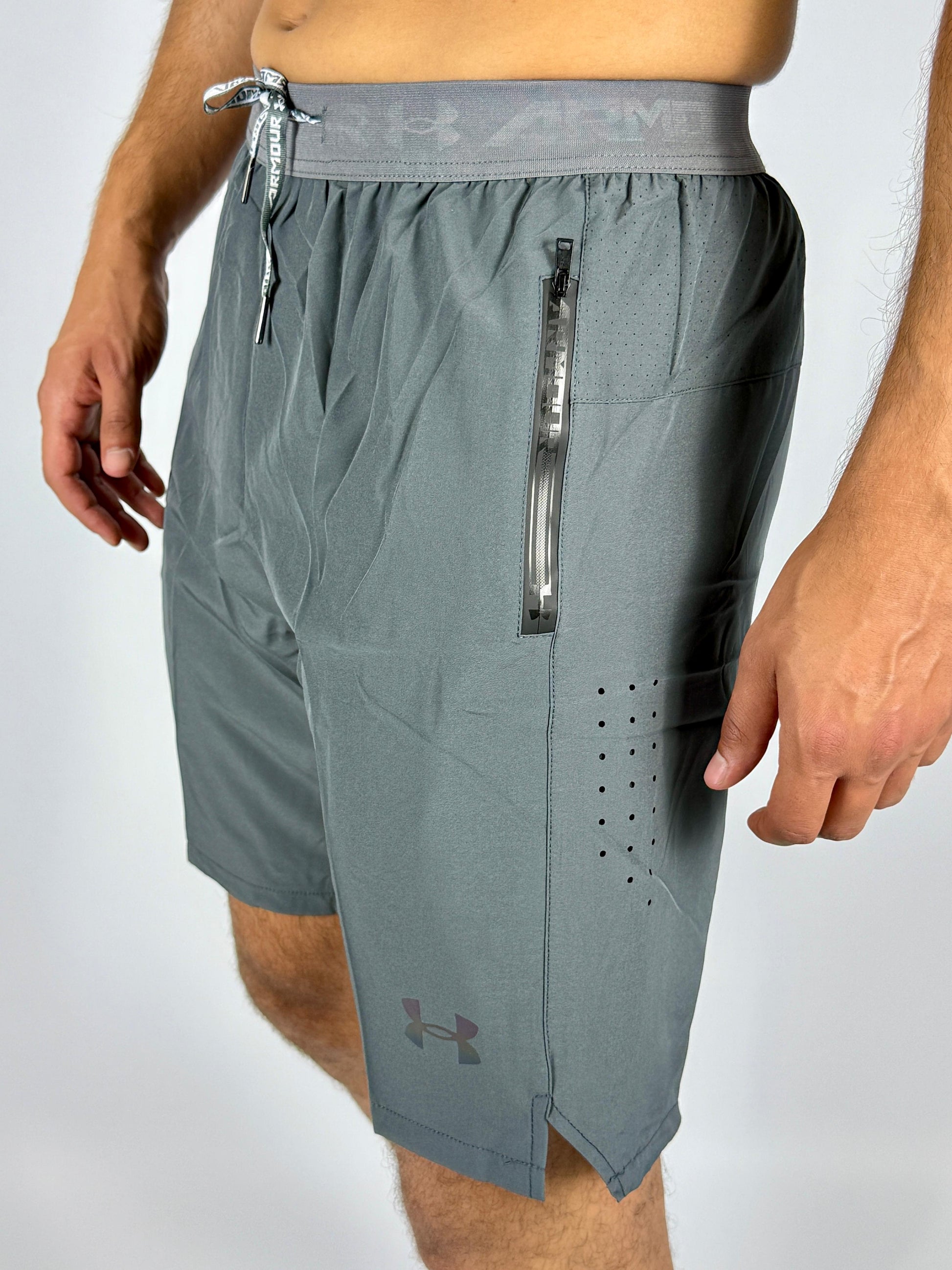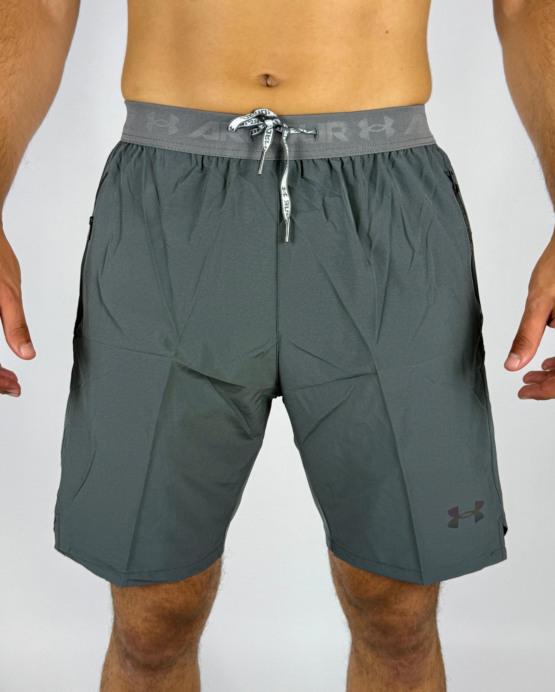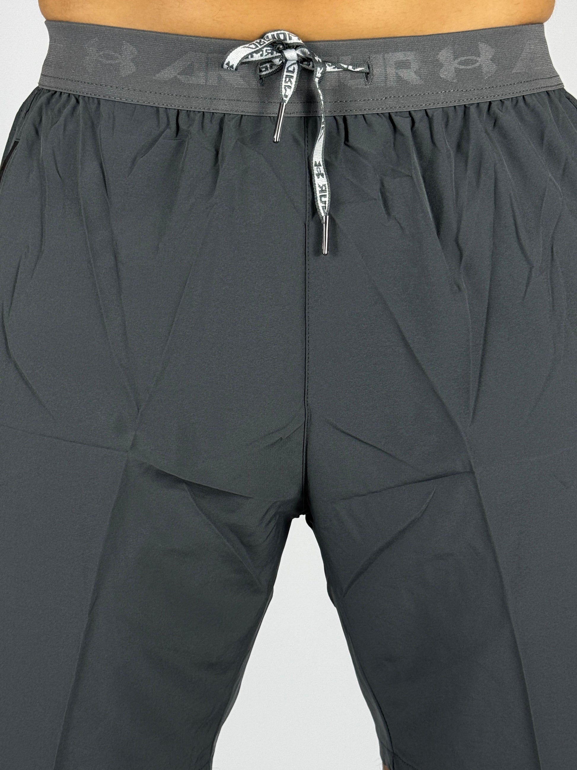 men's dark gray athletic shorts with an elastic waistband featuring "UNDER ARMOUR" branding and a contrasting drawstring. They include side pockets and the Under Armour logo on the lower right leg. The fabric appears lightweight and suitable for training, running, or general sports activities.