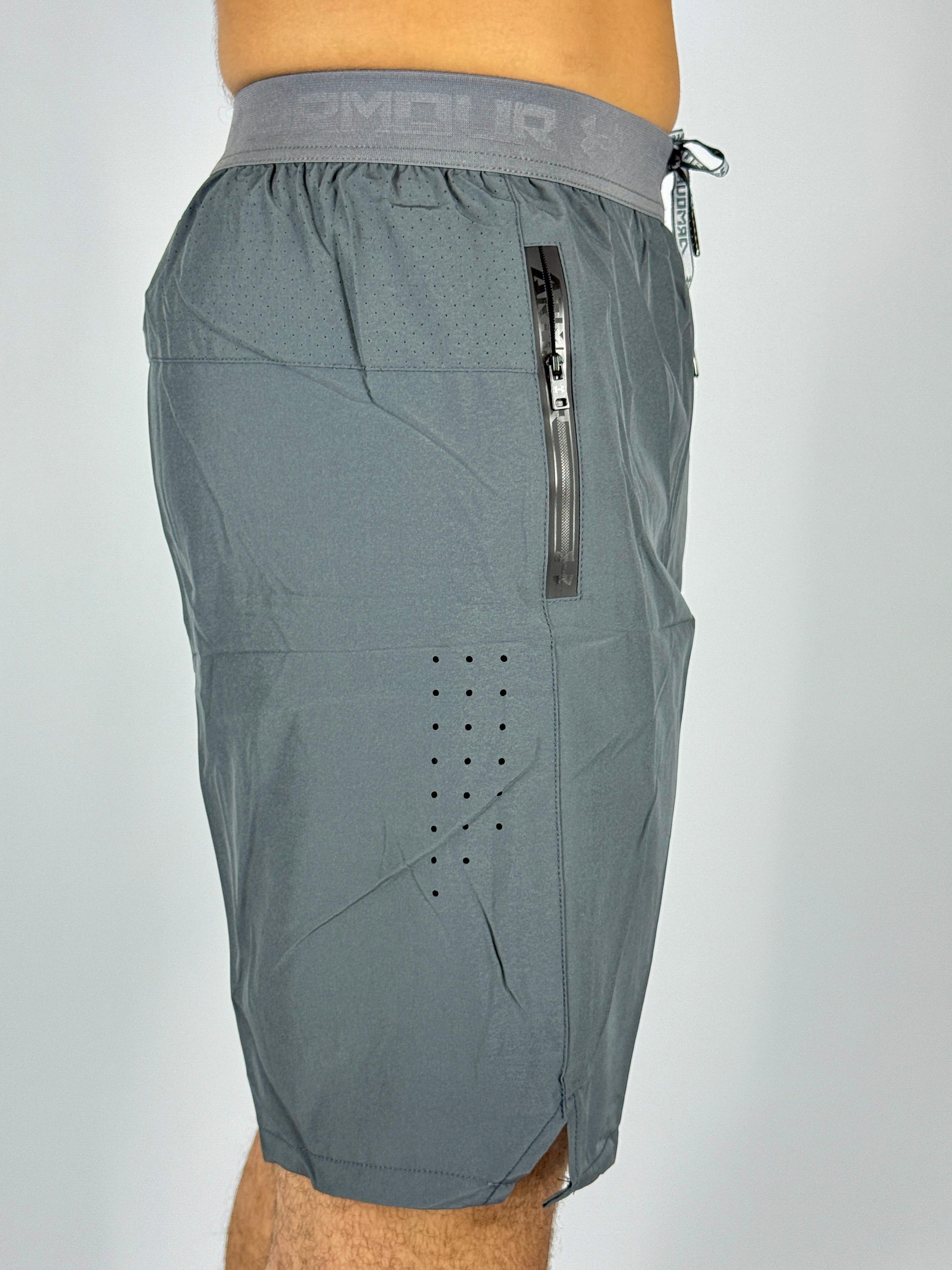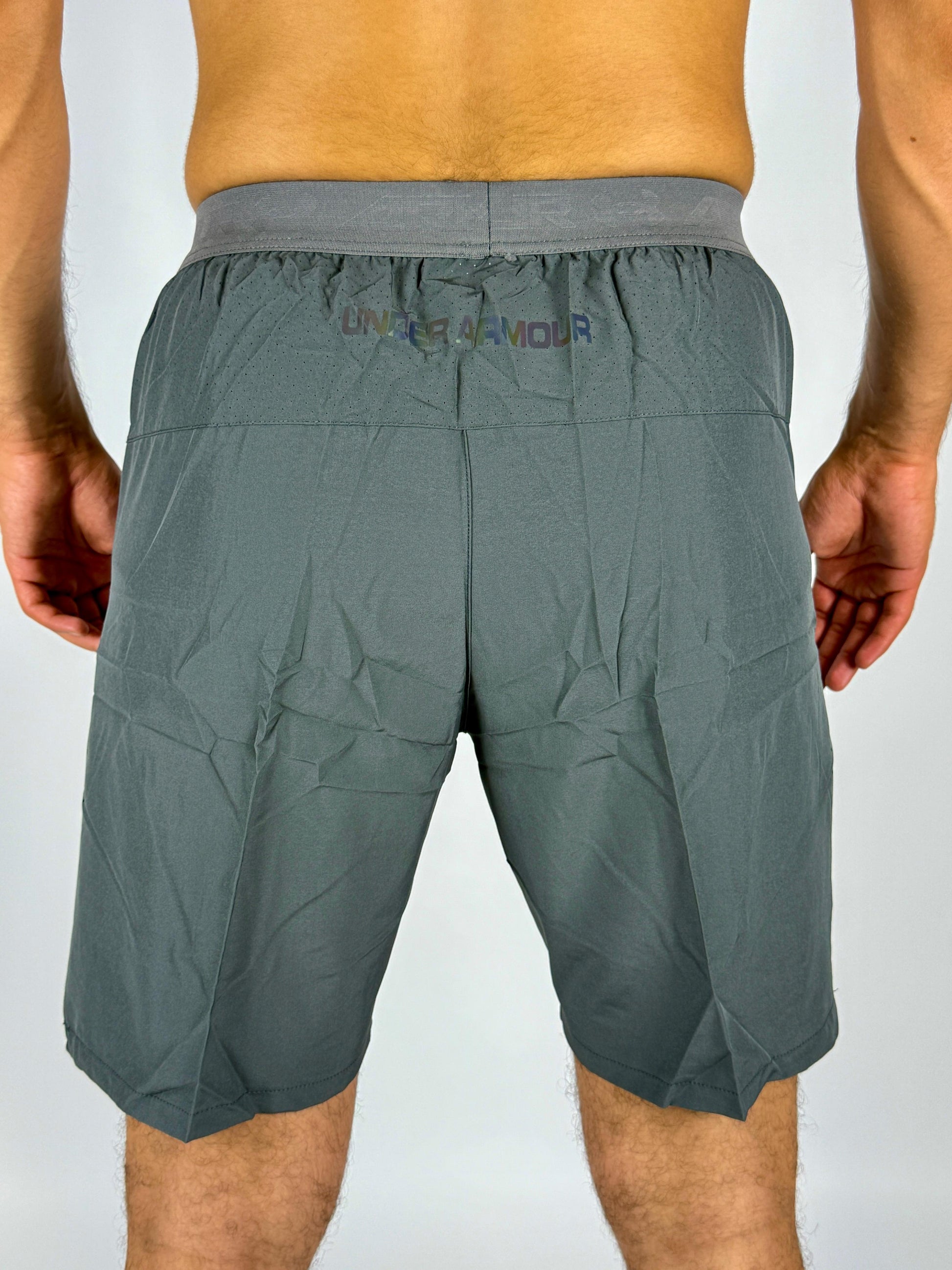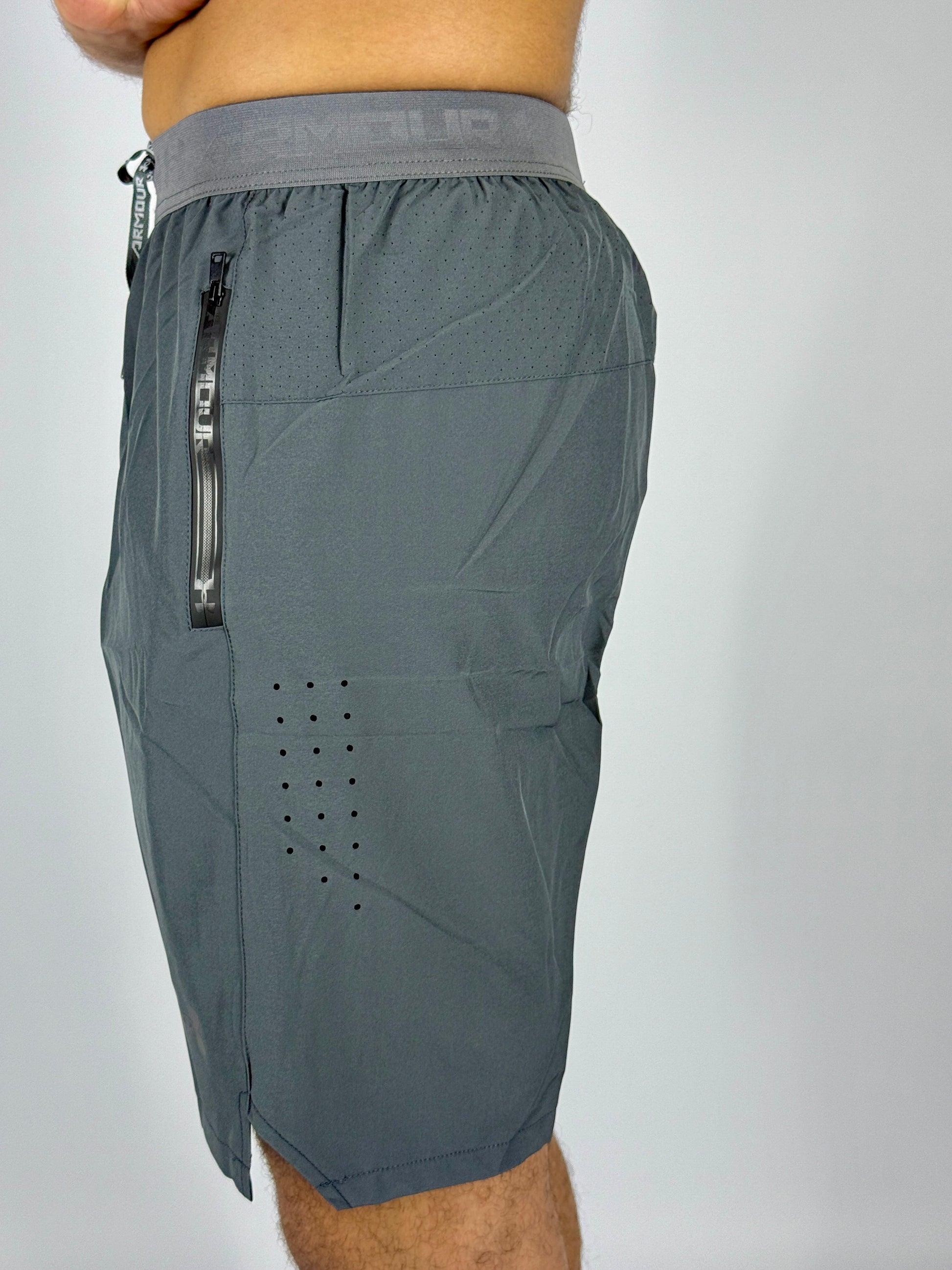 men's dark gray athletic shorts with an elastic waistband featuring "UNDER ARMOUR" branding and a contrasting drawstring. They include side pockets and the Under Armour logo on the lower right leg. The fabric appears lightweight and suitable for training, running, or general sports activities.