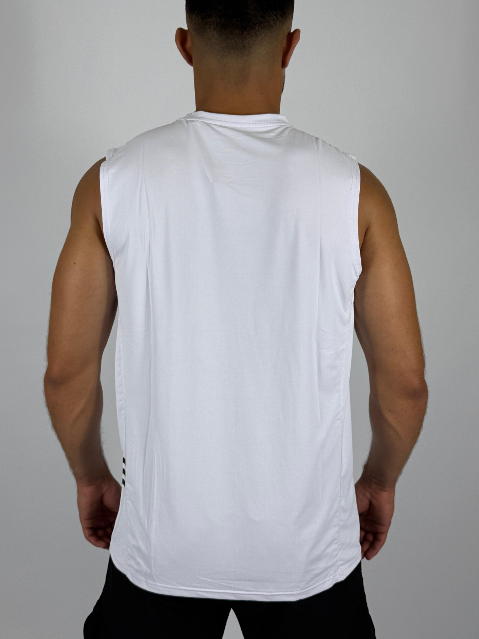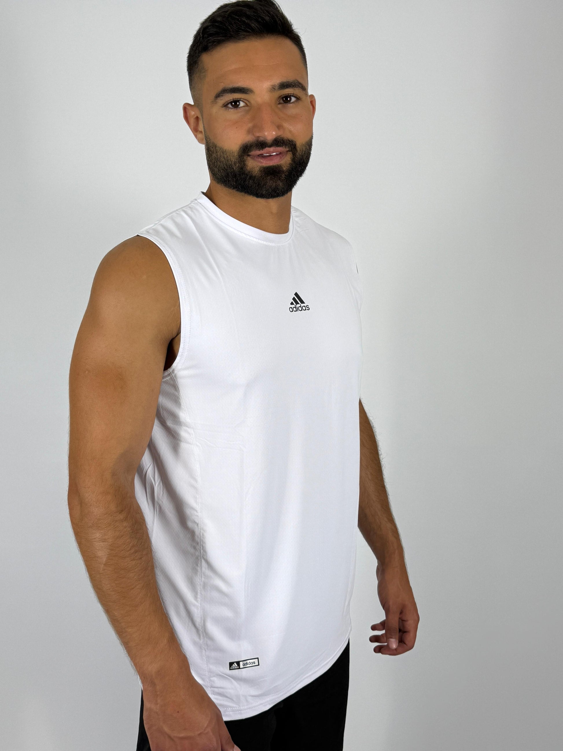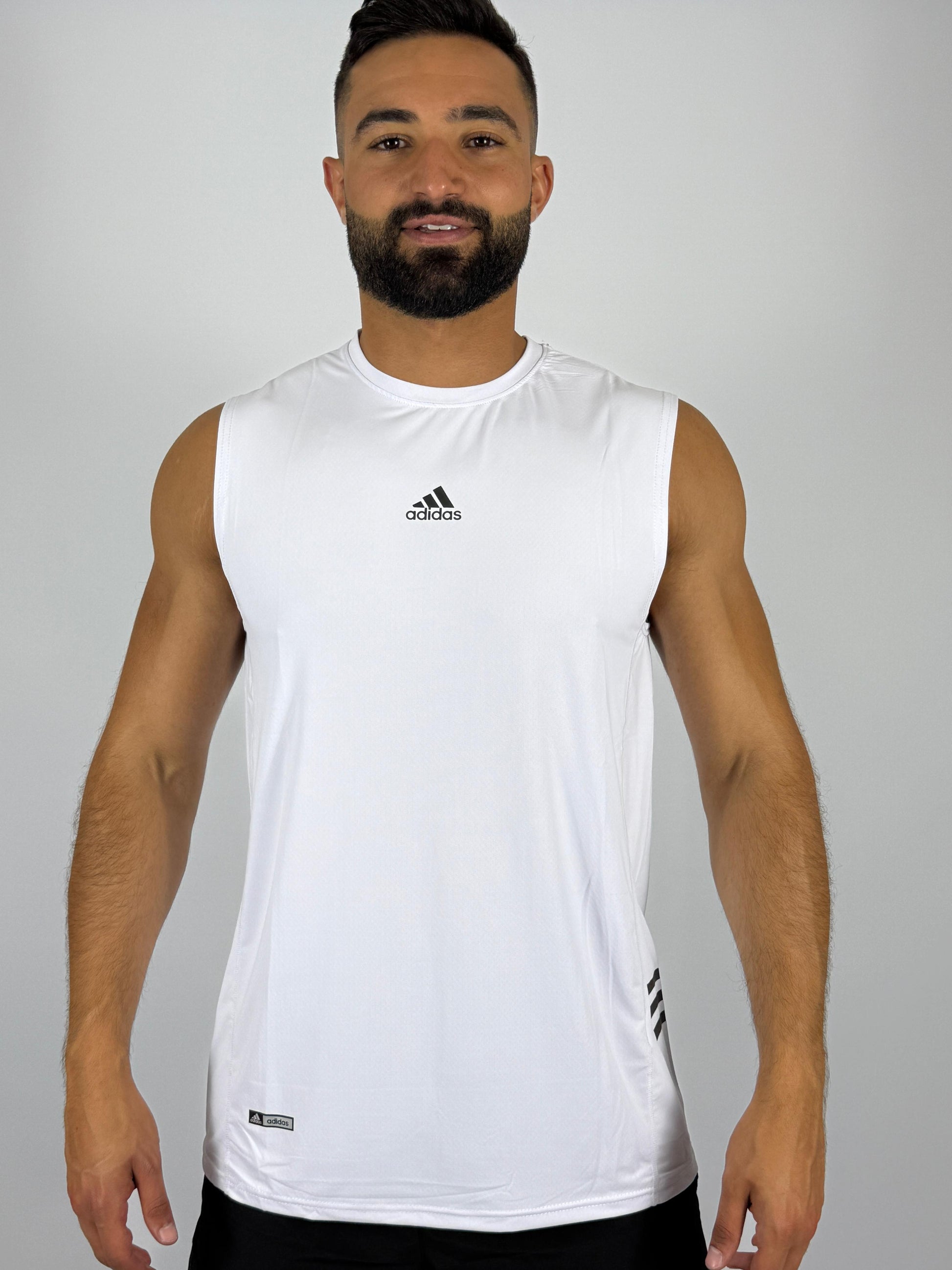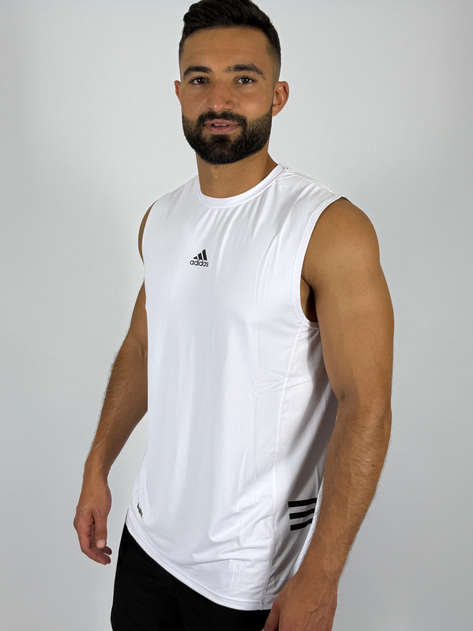 Dominate your workout in this white Adidas sleeveless training tee. Crafted from lightweight, breathable fabric, it features the Adidas logo on the chest and signature 3-stripes on the side. Ideal for maximum mobility and comfort during any activity.