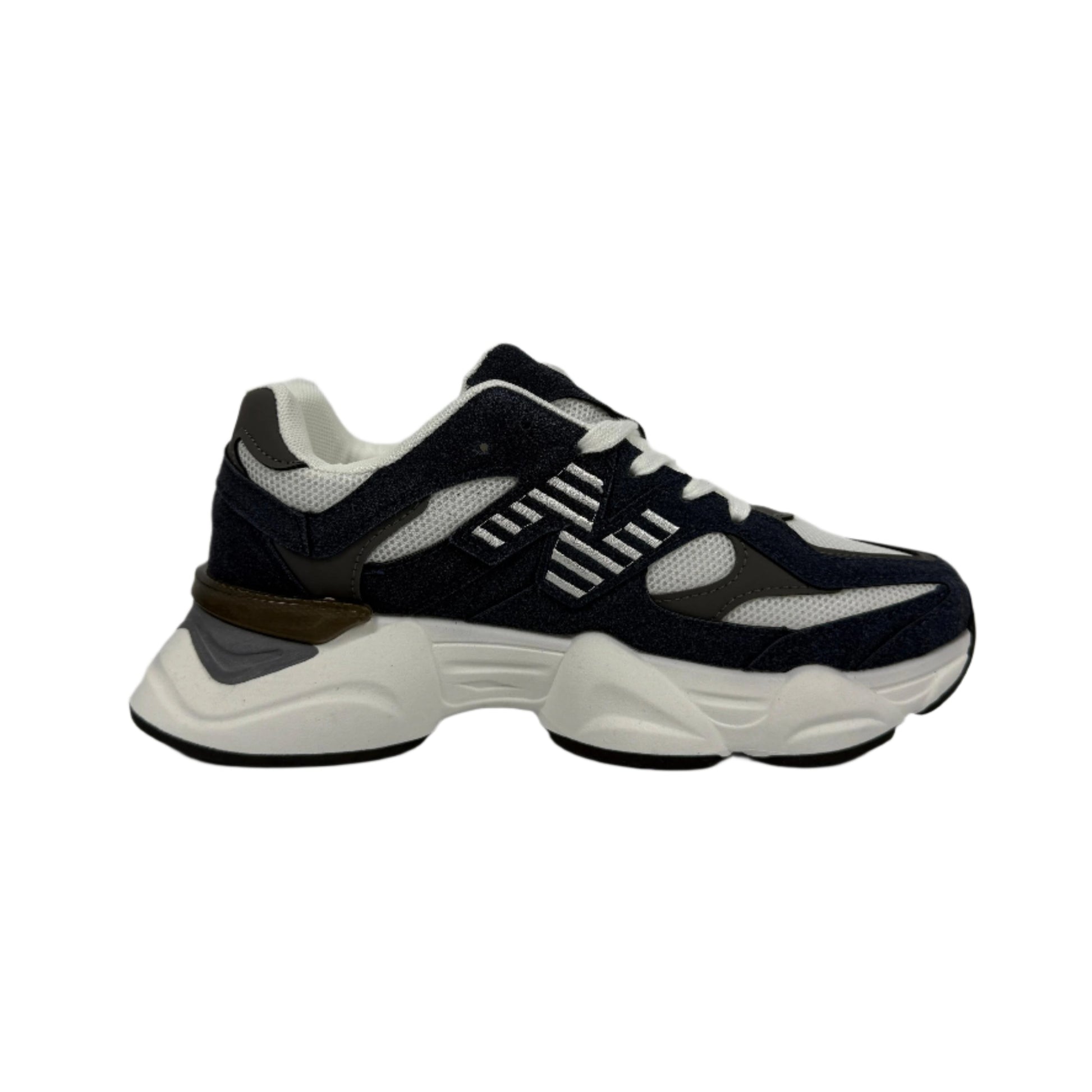 These lifestyle sneakers feature a distinctive chunky sole and a multi-material upper, combining elements of navy, white, and grey for a modern, athletic-inspired look. The design includes mesh for breathability and various overlays that add texture and support.