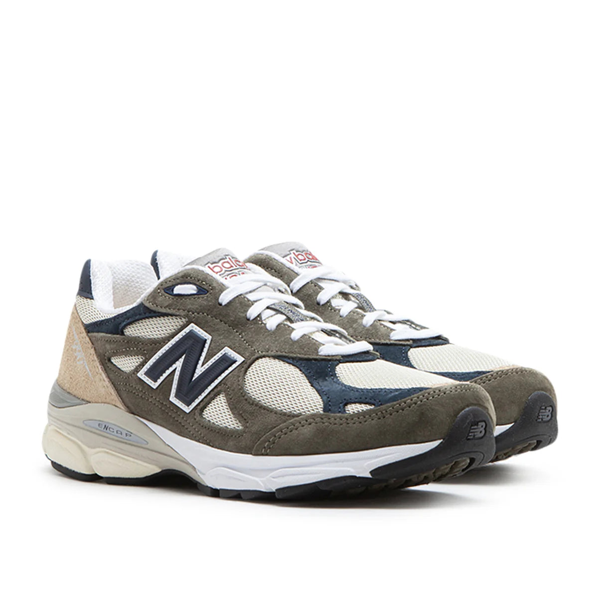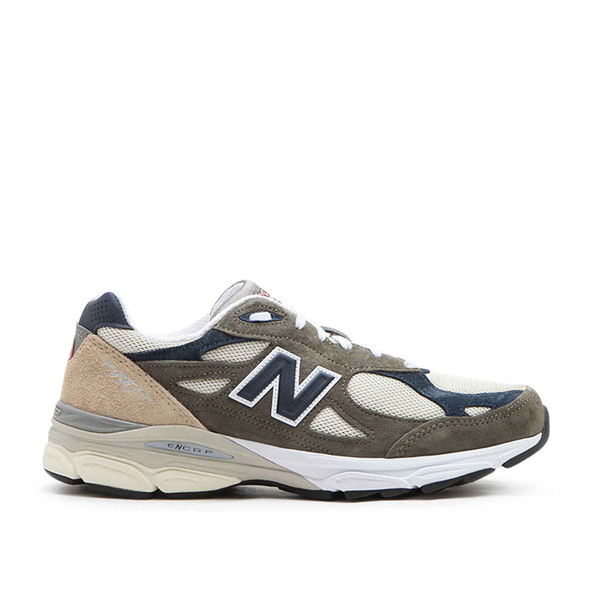 New Balances 990 was first launched in 1982 and was the benchmark for runners and trendsetters alike. This model has a premium upper in various shades of grey and beige and an Encap midsole.