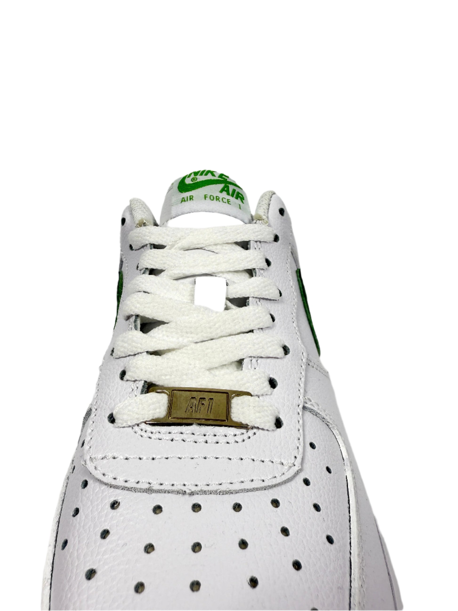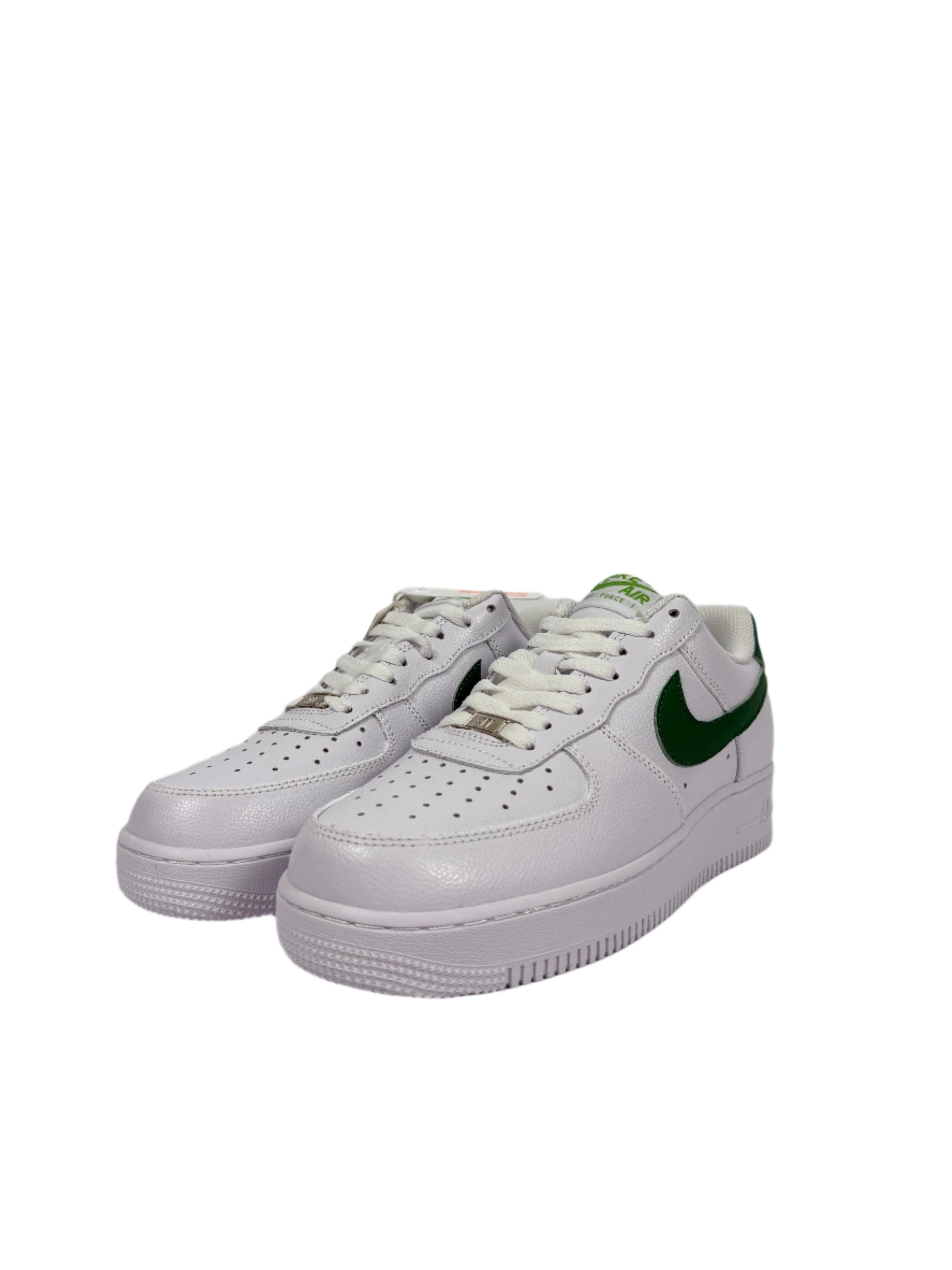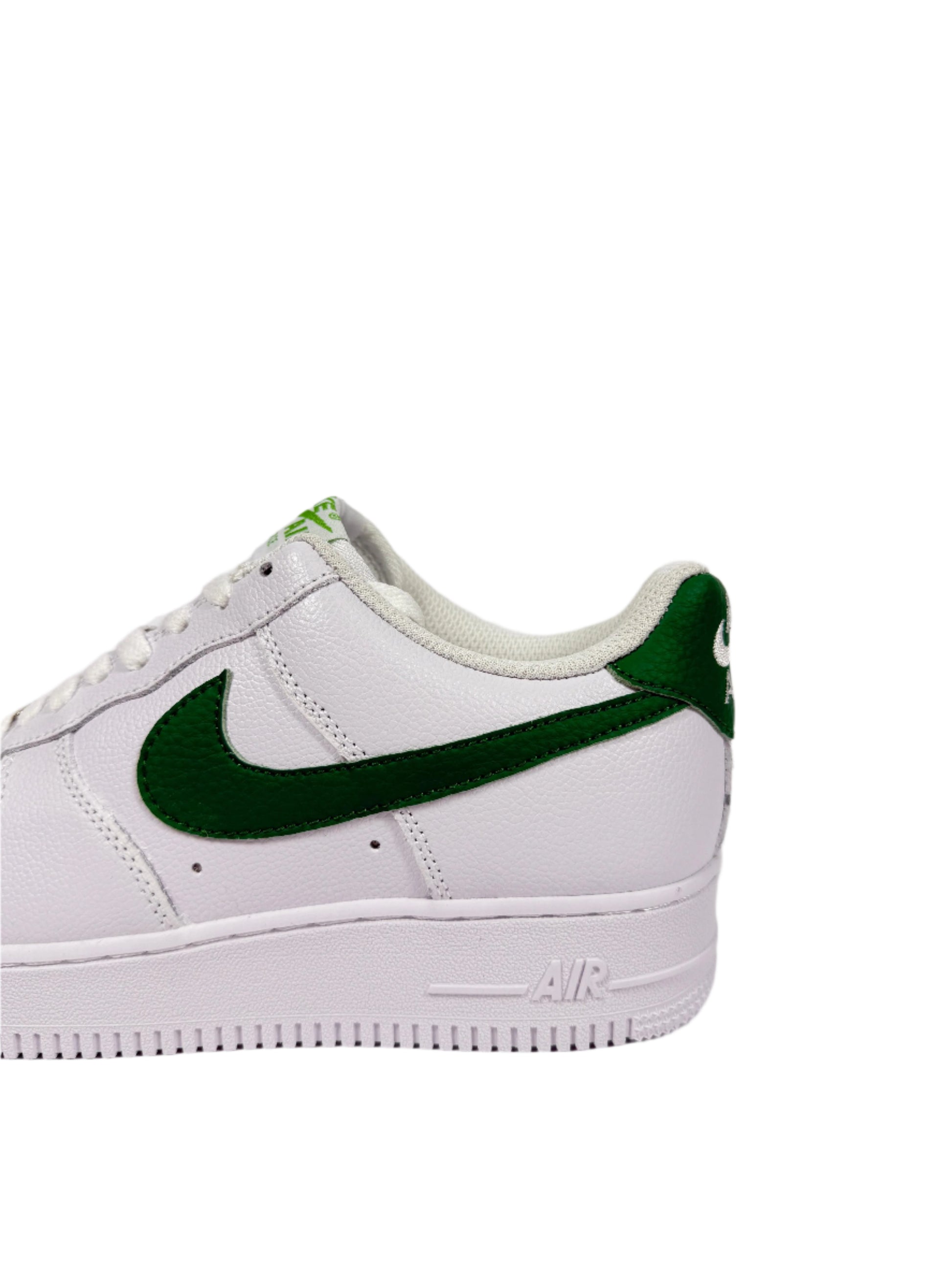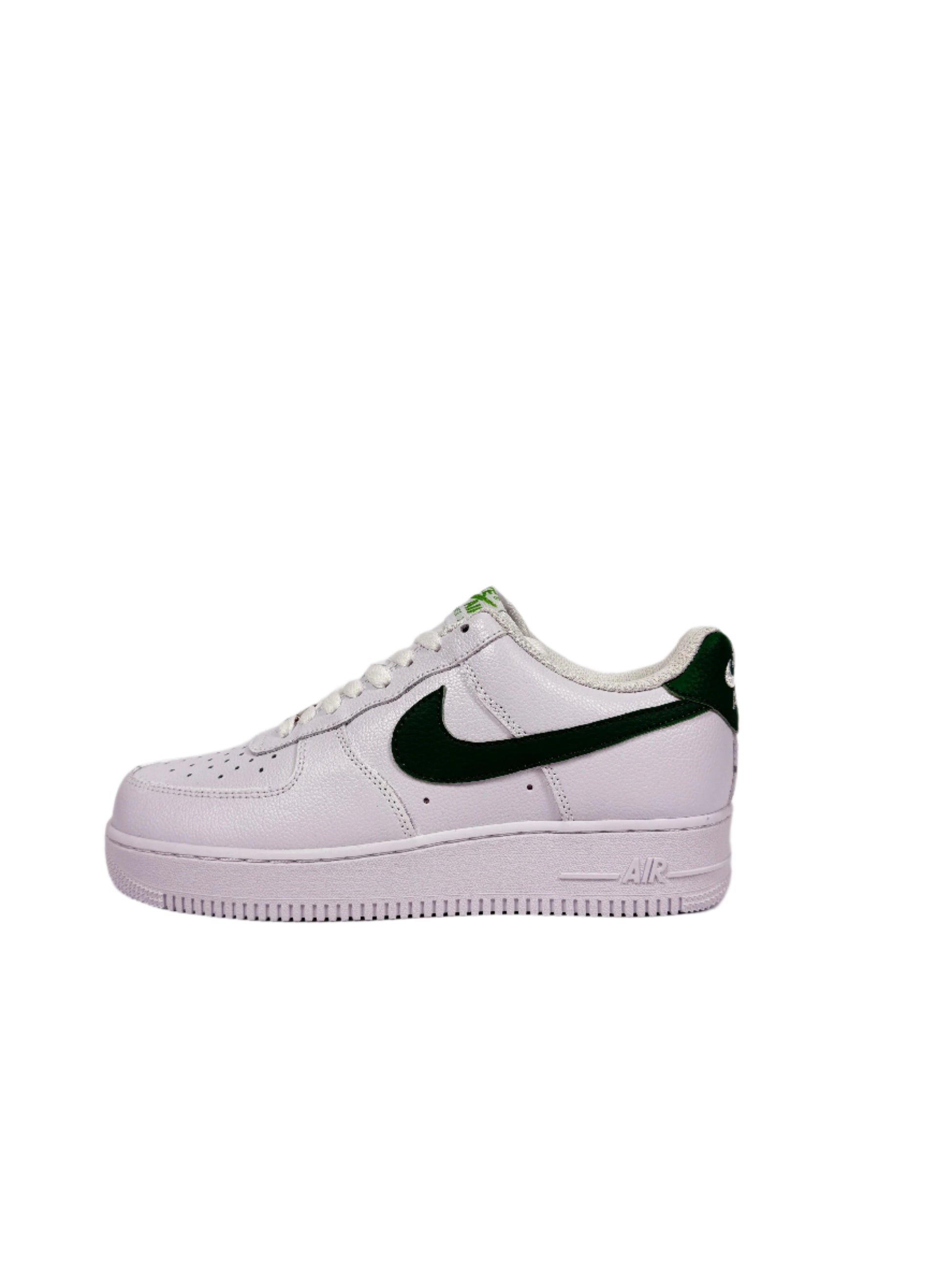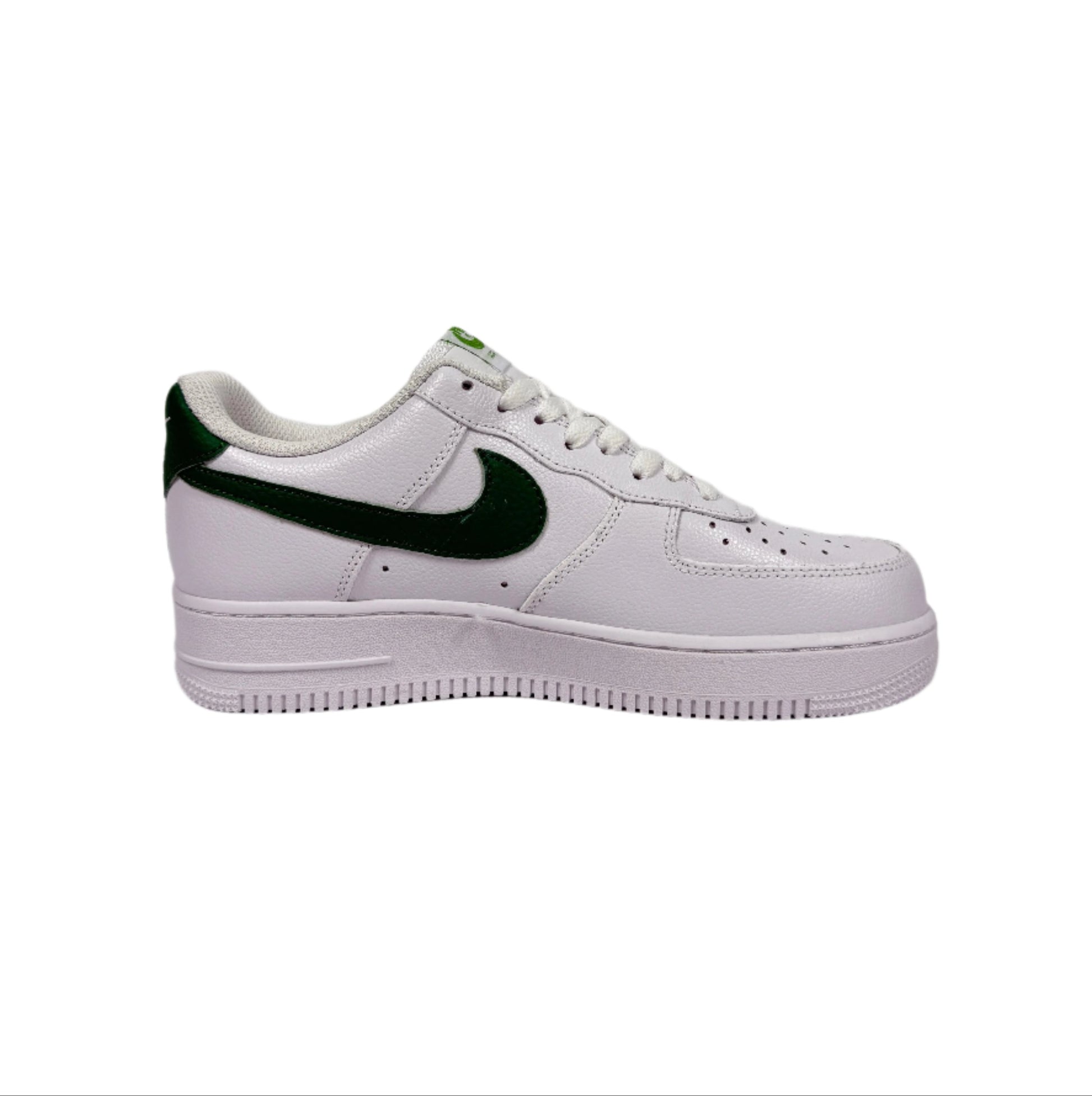 iconic Nike Air Force 1 Low sneakers, presented in a crisp white leather upper with striking dark green accents. The classic silhouette features the signature perforated toe box for breathability and a padded collar for comfort. The prominent dark green Nike Swoosh sweeps across the side panel, extending to a matching dark green heel tab.