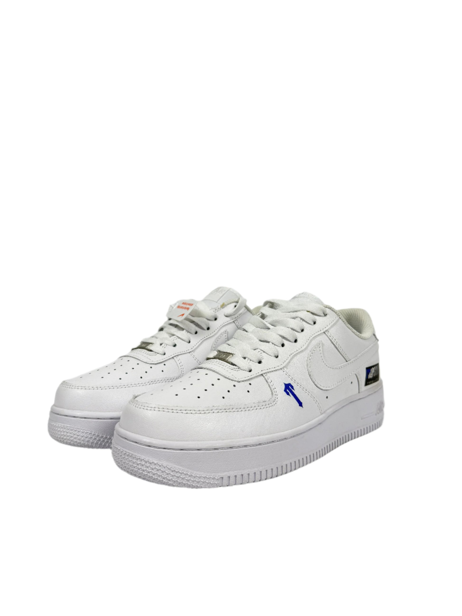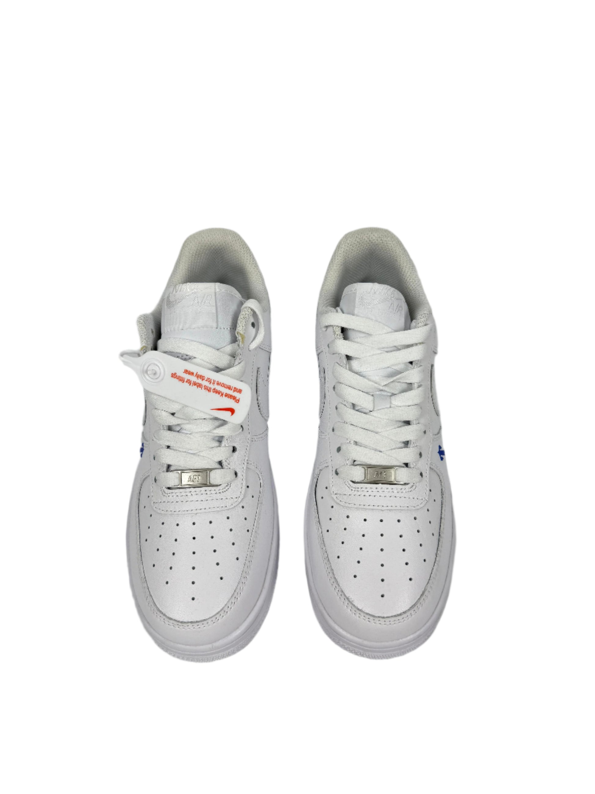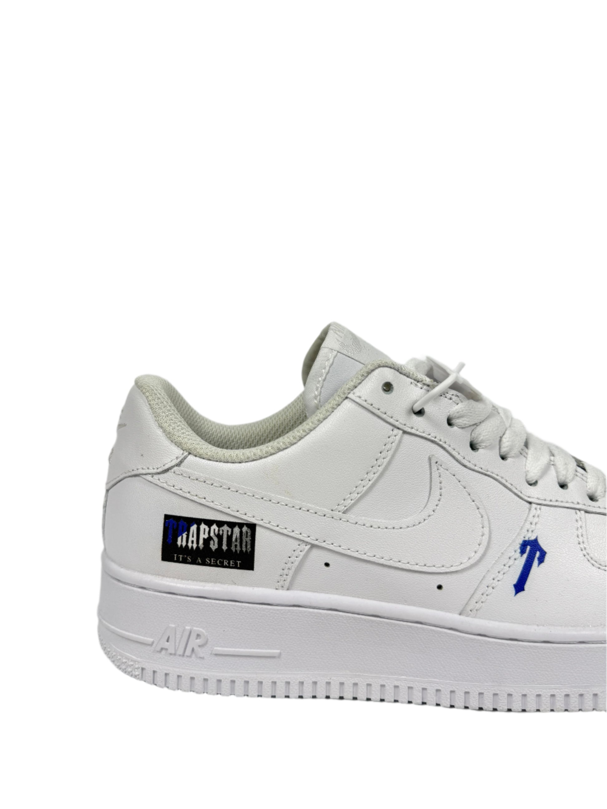 unique edition of the Nike Air Force 1 Low sneakers, featuring a clean white leather upper and distinctive branding. The shoe maintains the classic Air Force 1 silhouette with its signature perforated toe box and sturdy construction. A blue rectangular patch with "MAPSTAR" written in white lettering is prominently featured on the side panel, below the white Nike Swoosh. Additionally, a smaller blue graphic, possibly a stylized star or arrow, is present towards the front of the side panel.