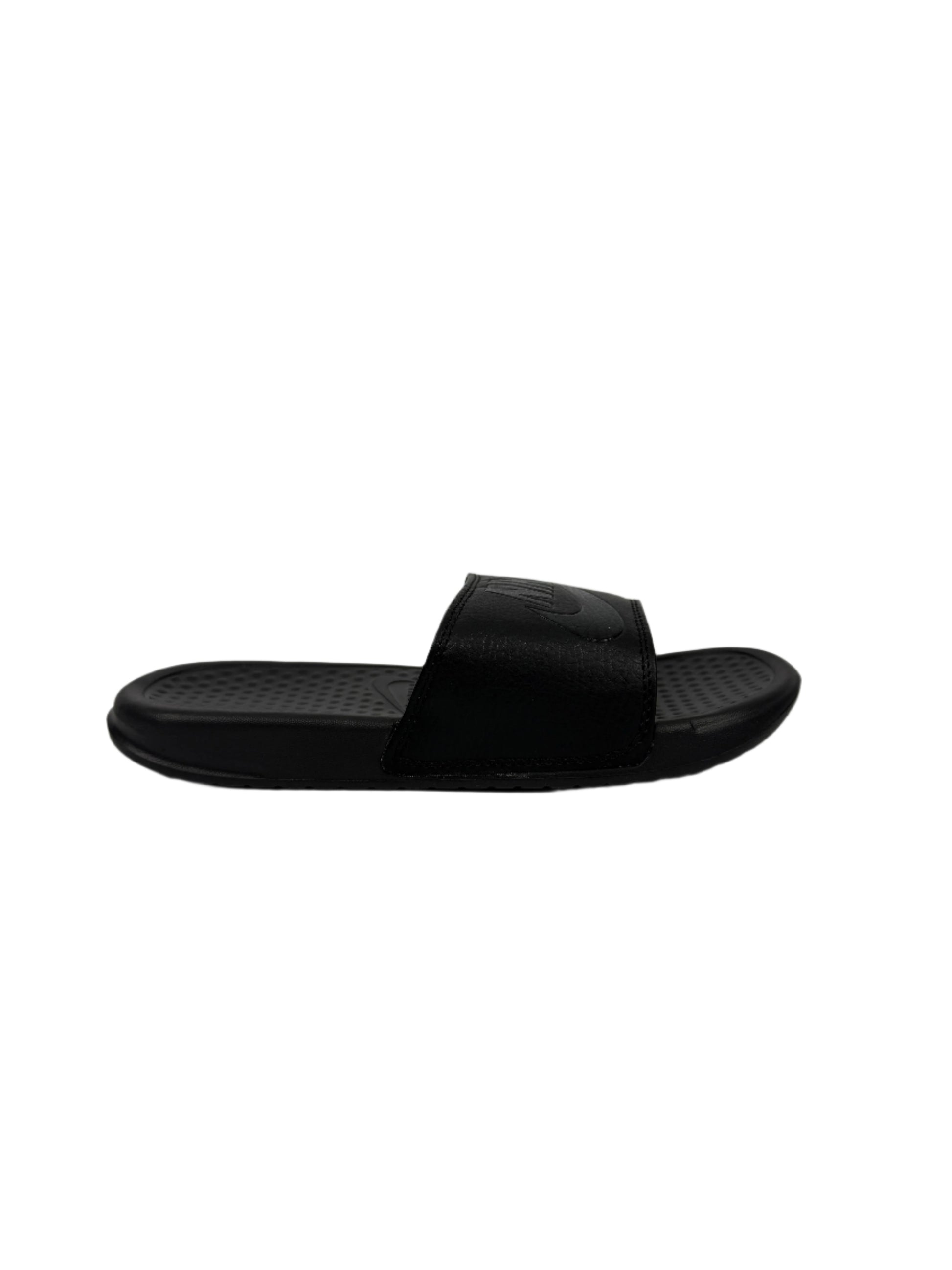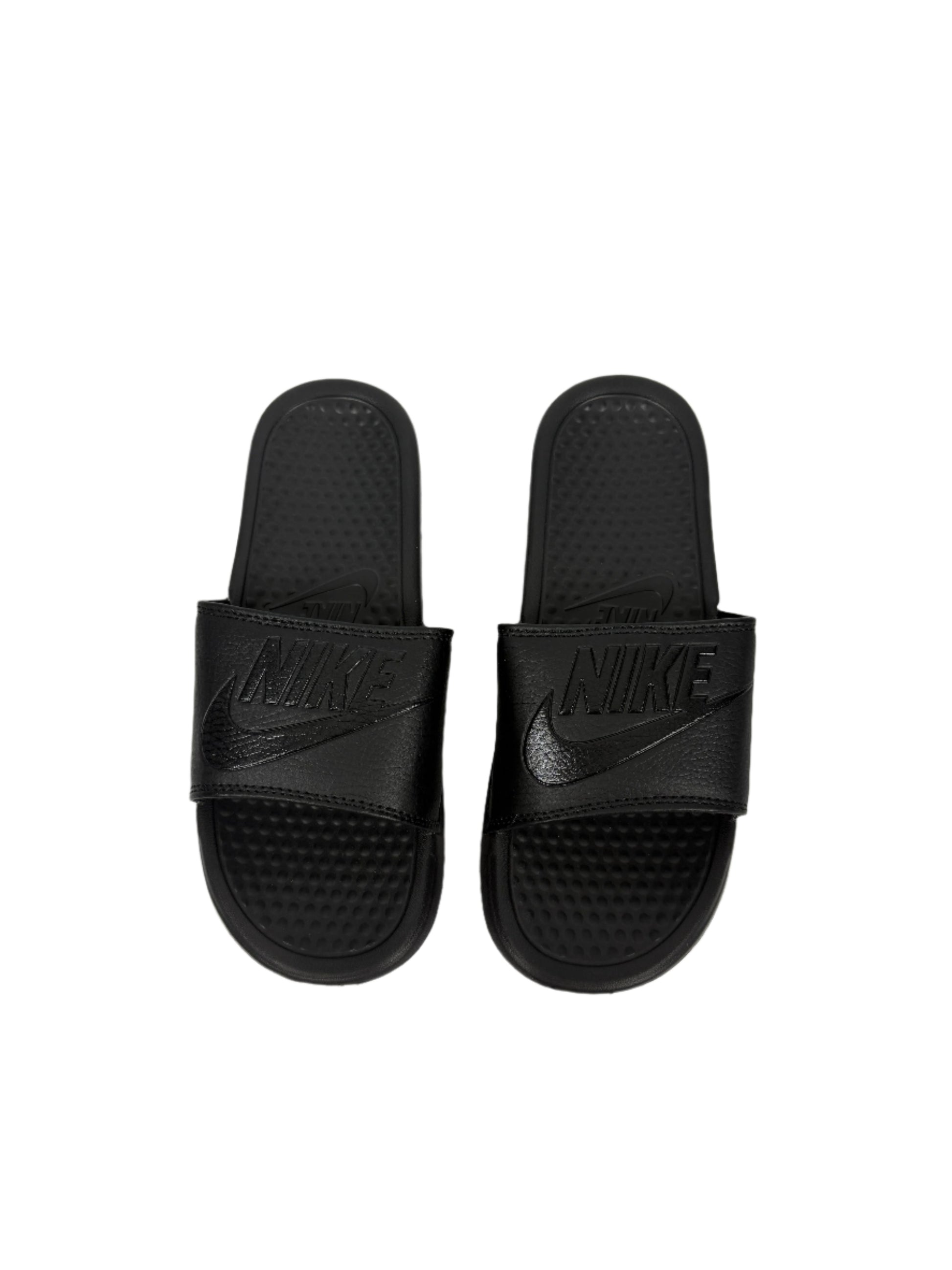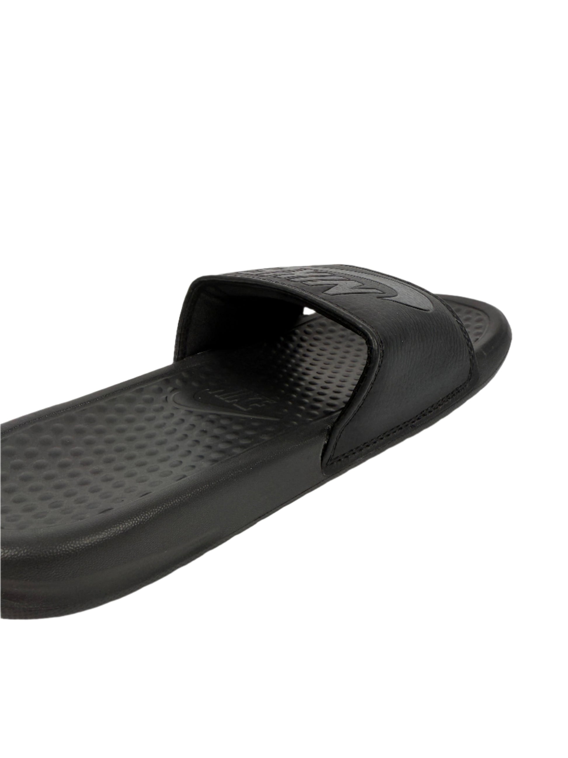Nike Benassi Just Do It (JDI) slides in an all-black color scheme. Both the wide synthetic leather strap and the footbed are entirely black. The strap features a debossed black Nike "NIKE" wordmark and Swoosh logo, creating a subtle, tonal branding effect. The footbed has a textured surface designed for comfort and grip. These monochromatic slides offer a sleek and versatile option for various casual settings, from post-gym comfort to everyday wear.