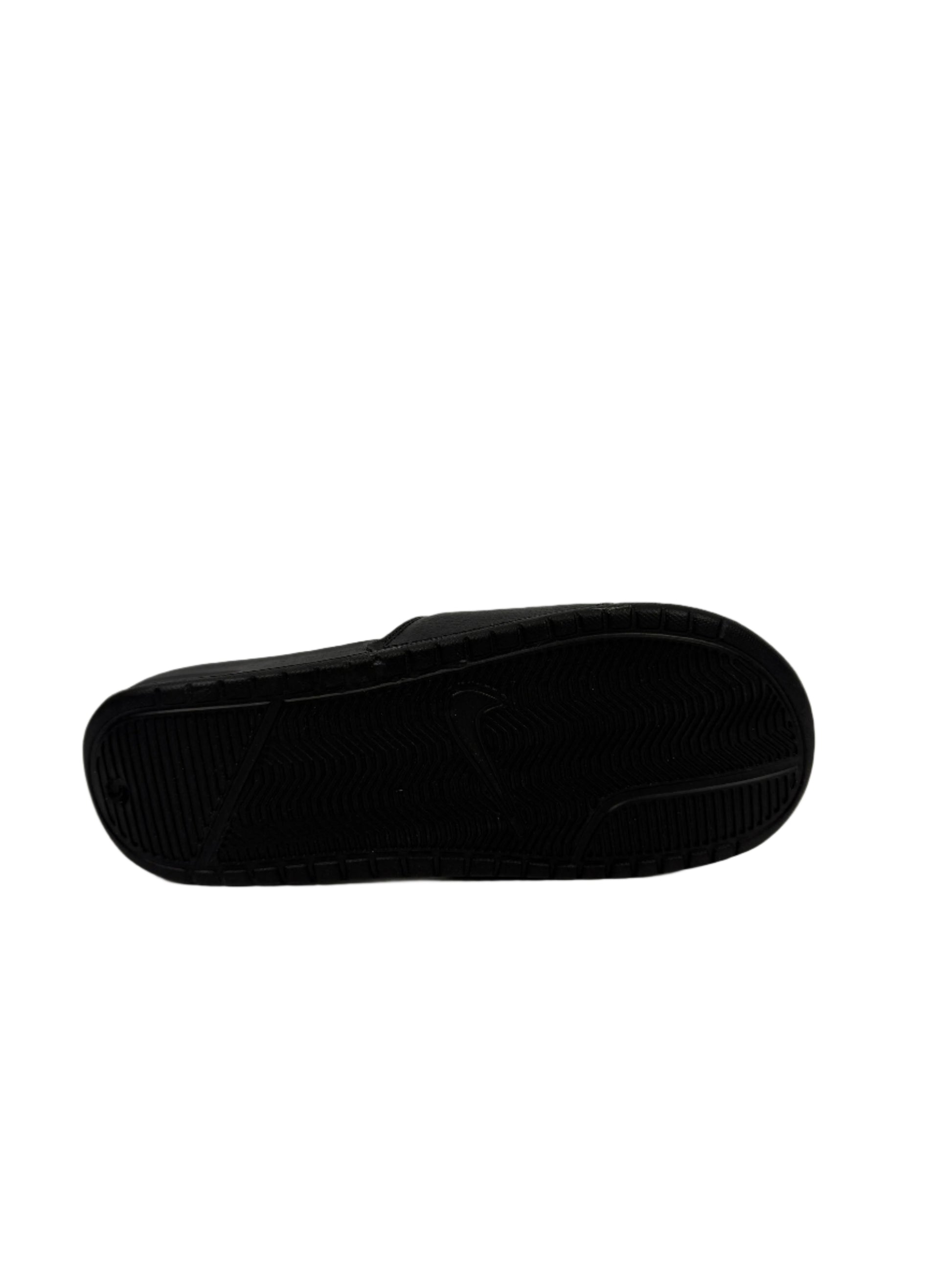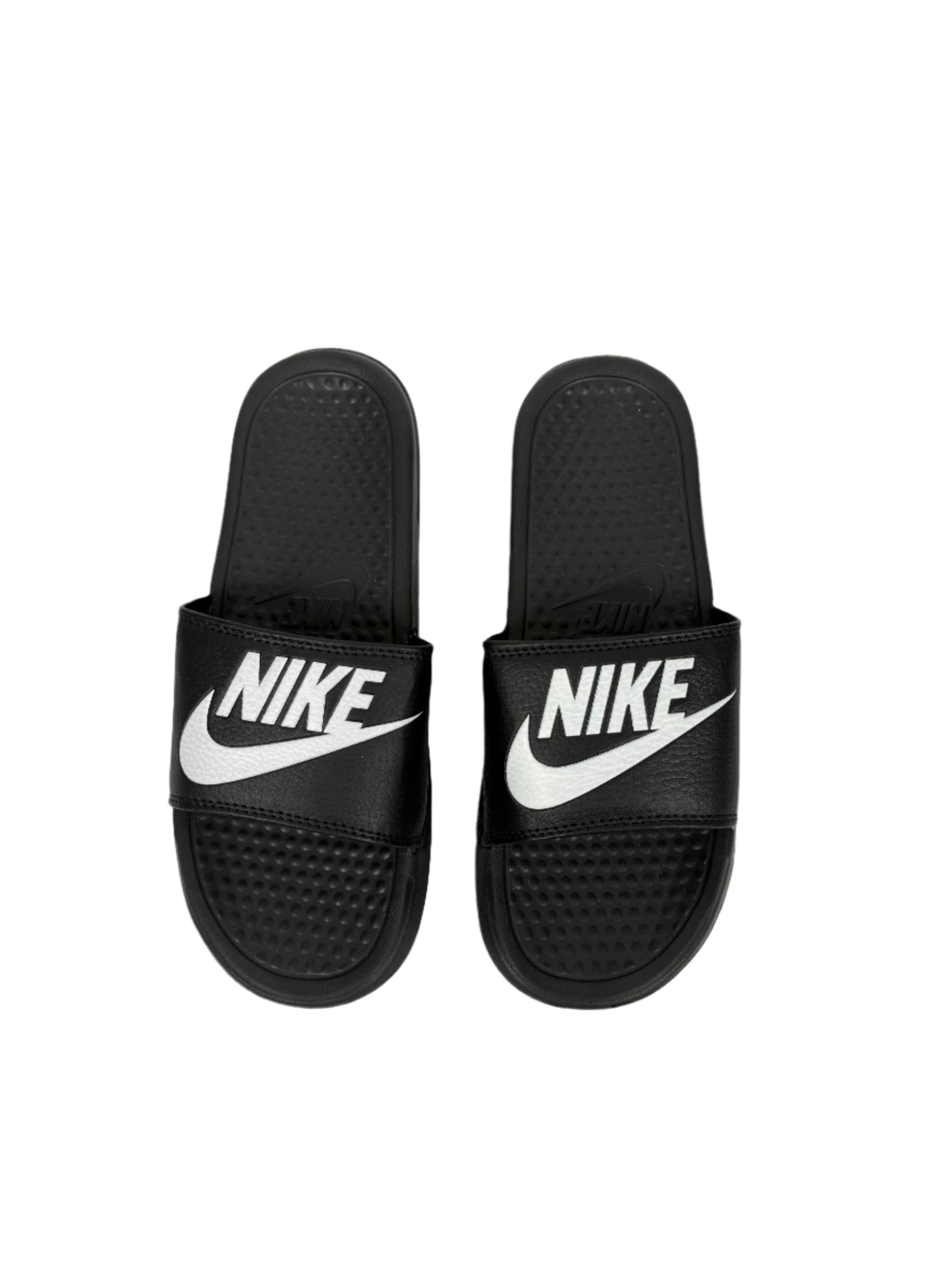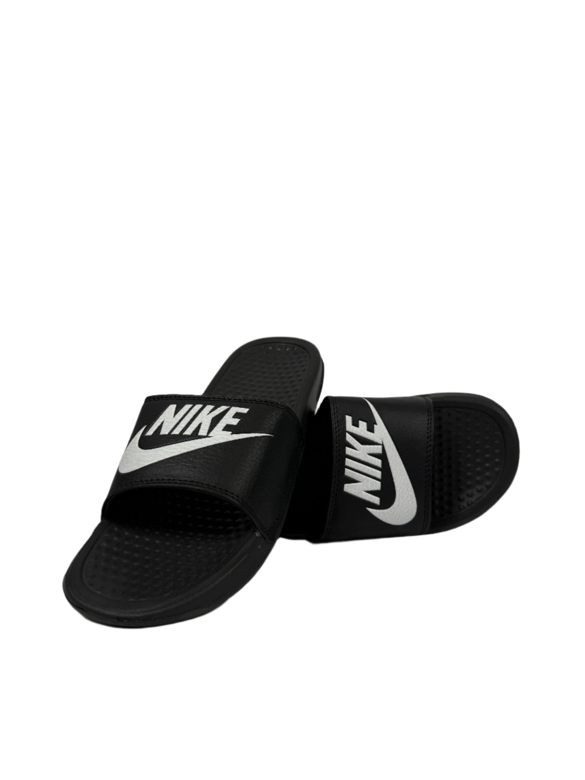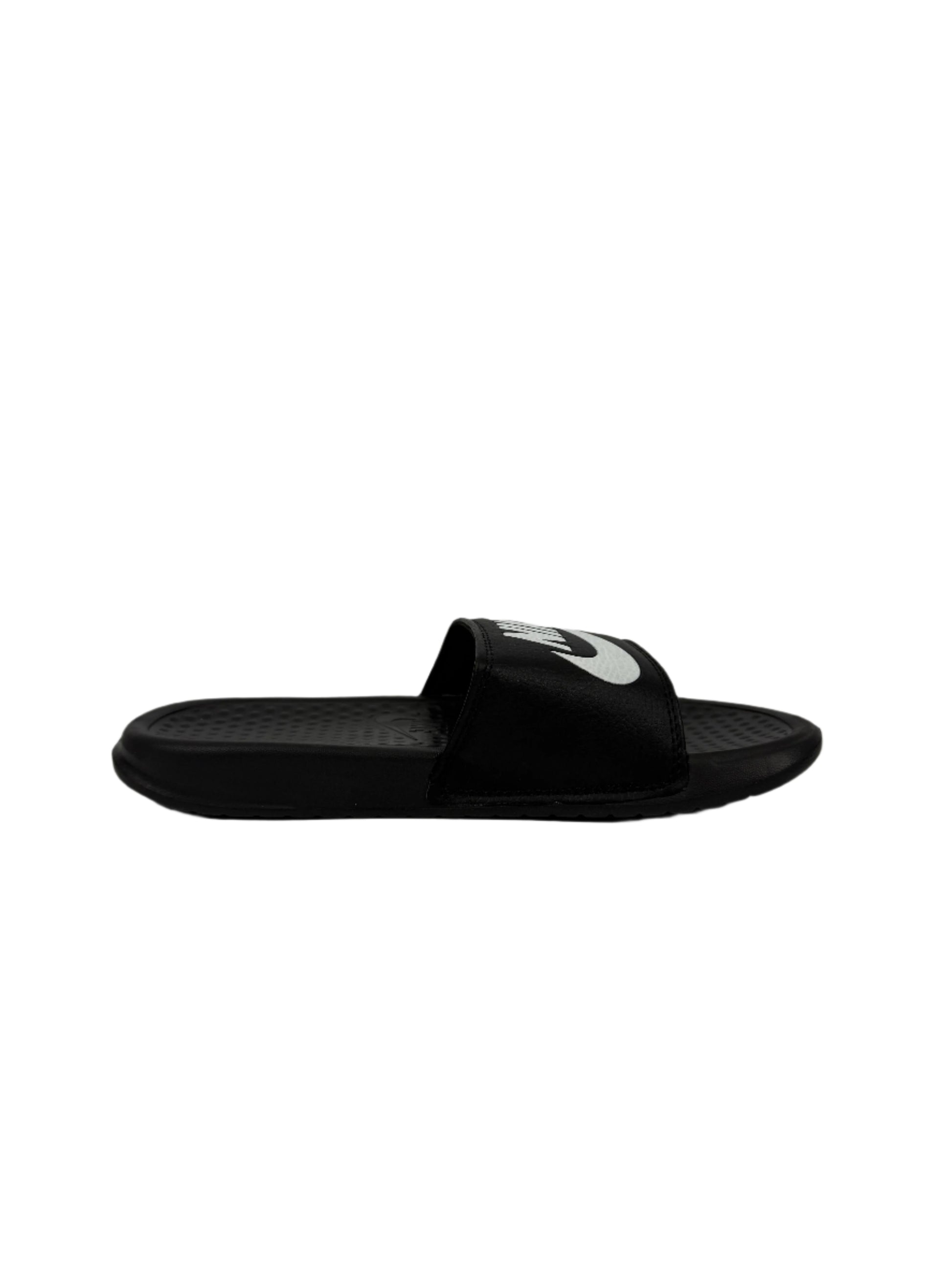 Nike Benassi Just Do It (JDI) slides in a classic black and white color scheme. The slides feature a single, wide black synthetic leather strap with a prominent white Nike "NIKE" wordmark and Swoosh logo debossed on top. The footbed is black with a textured surface, designed for comfort and grip. These slides are a popular choice for casual wear, post-activity relaxation, or showering due to their lightweight and comfortable design.