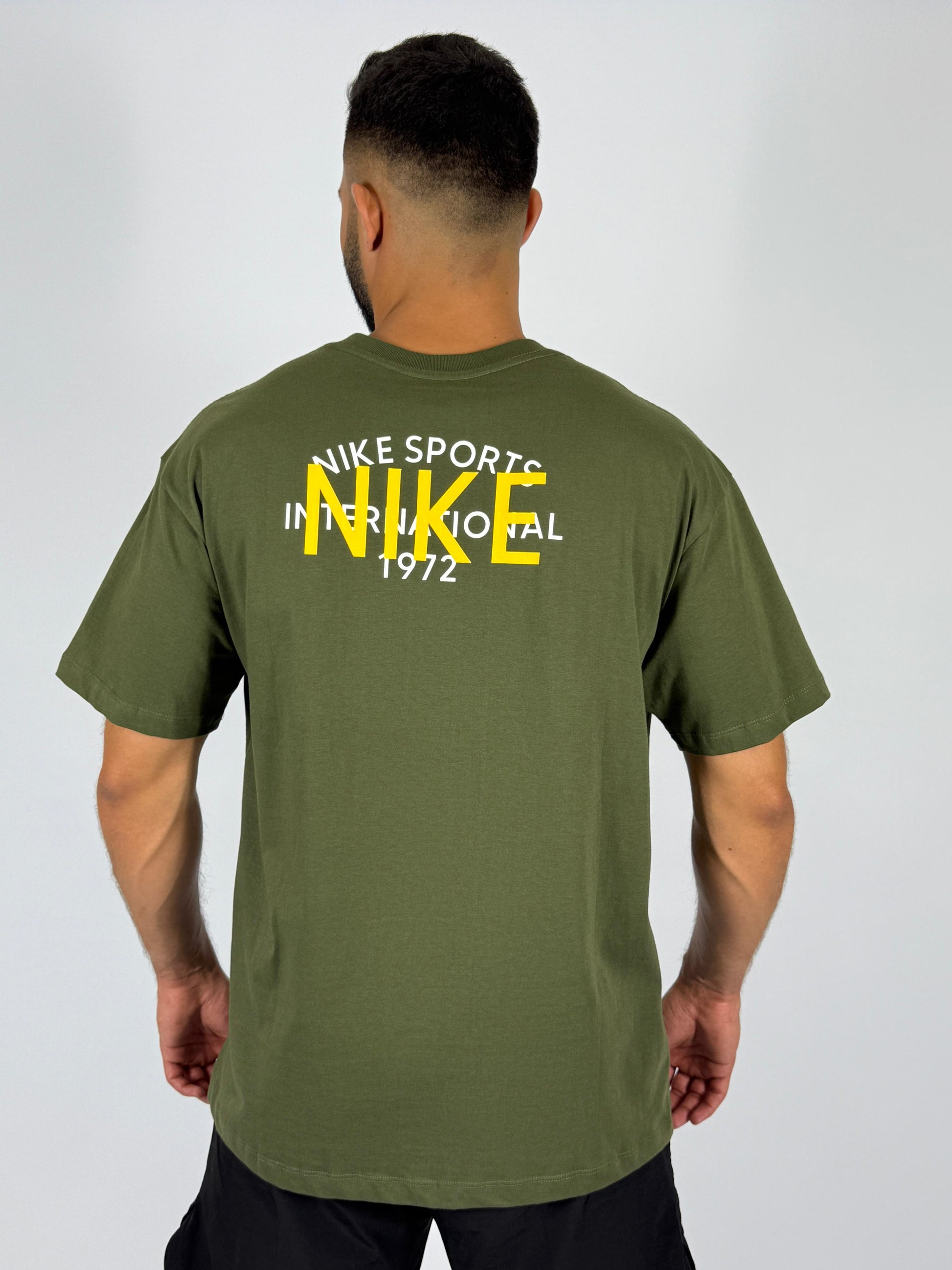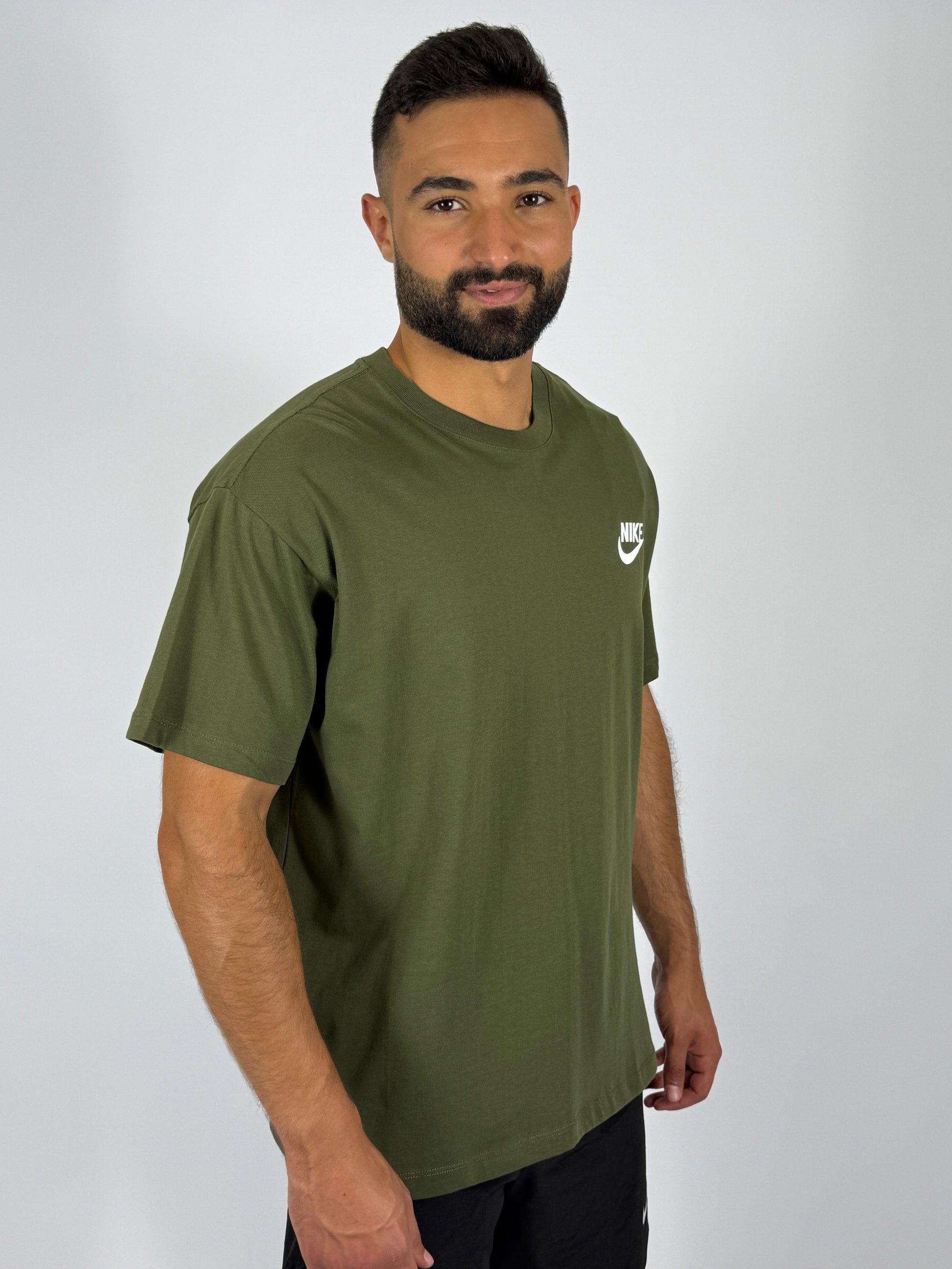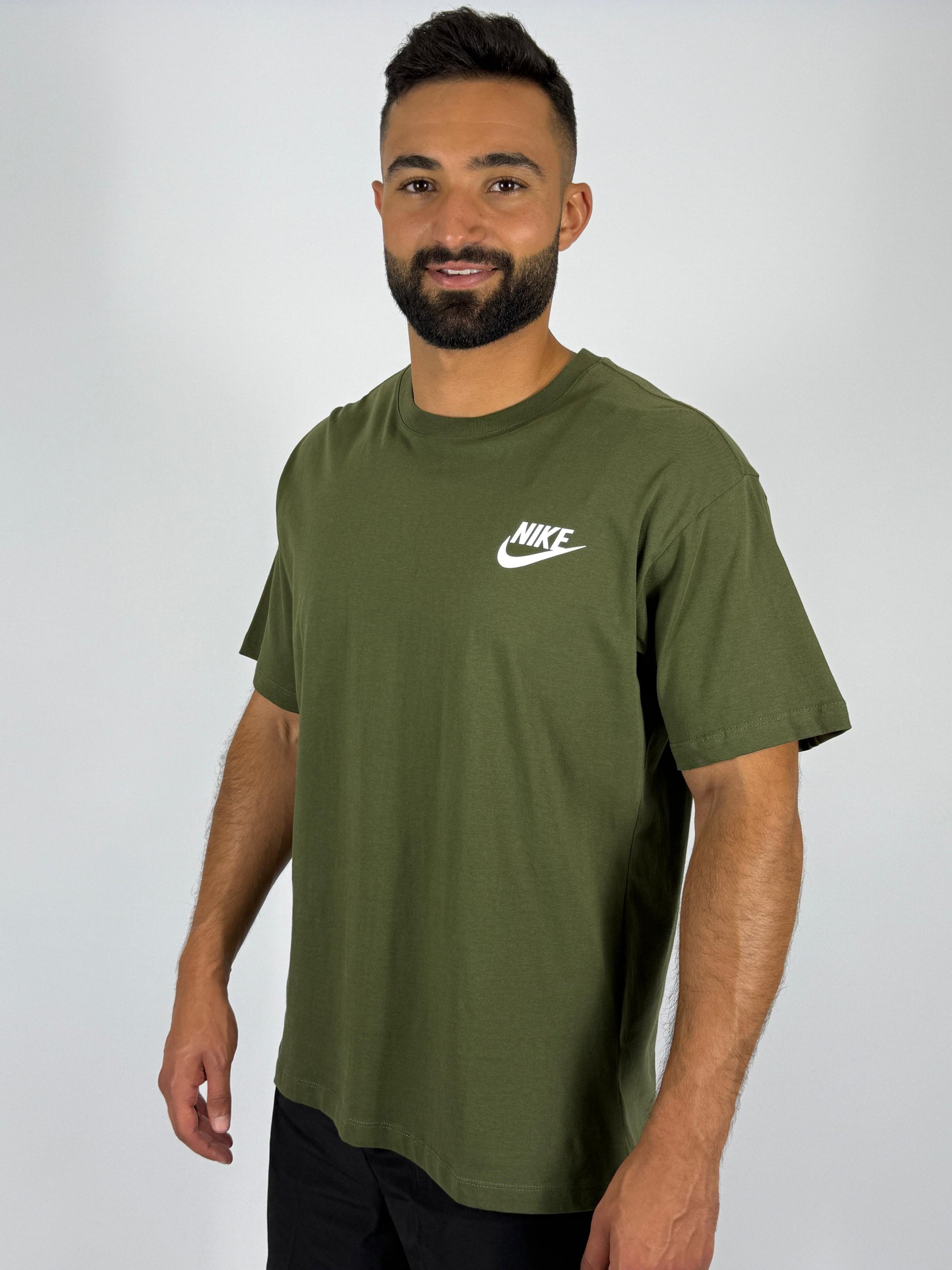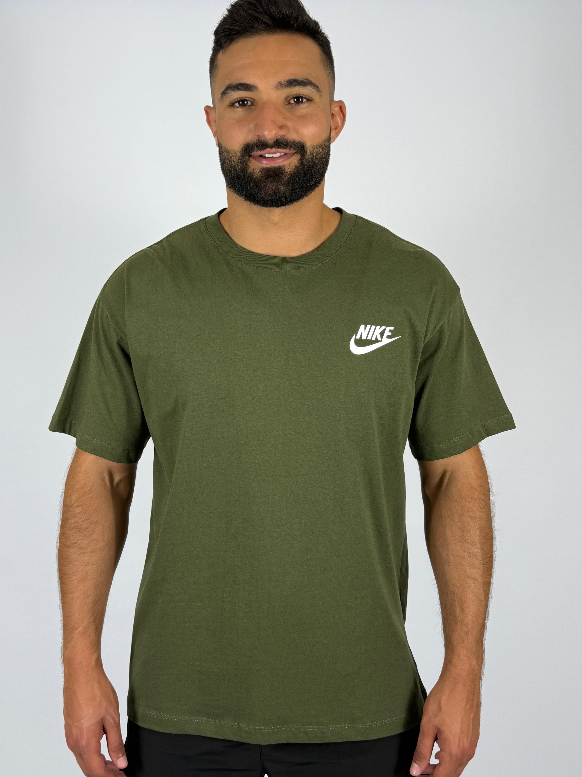 A classic olive green short-sleeve t-shirt from Nike featuring a large, white Nike logo. Made from comfortable cotton for everyday wear.