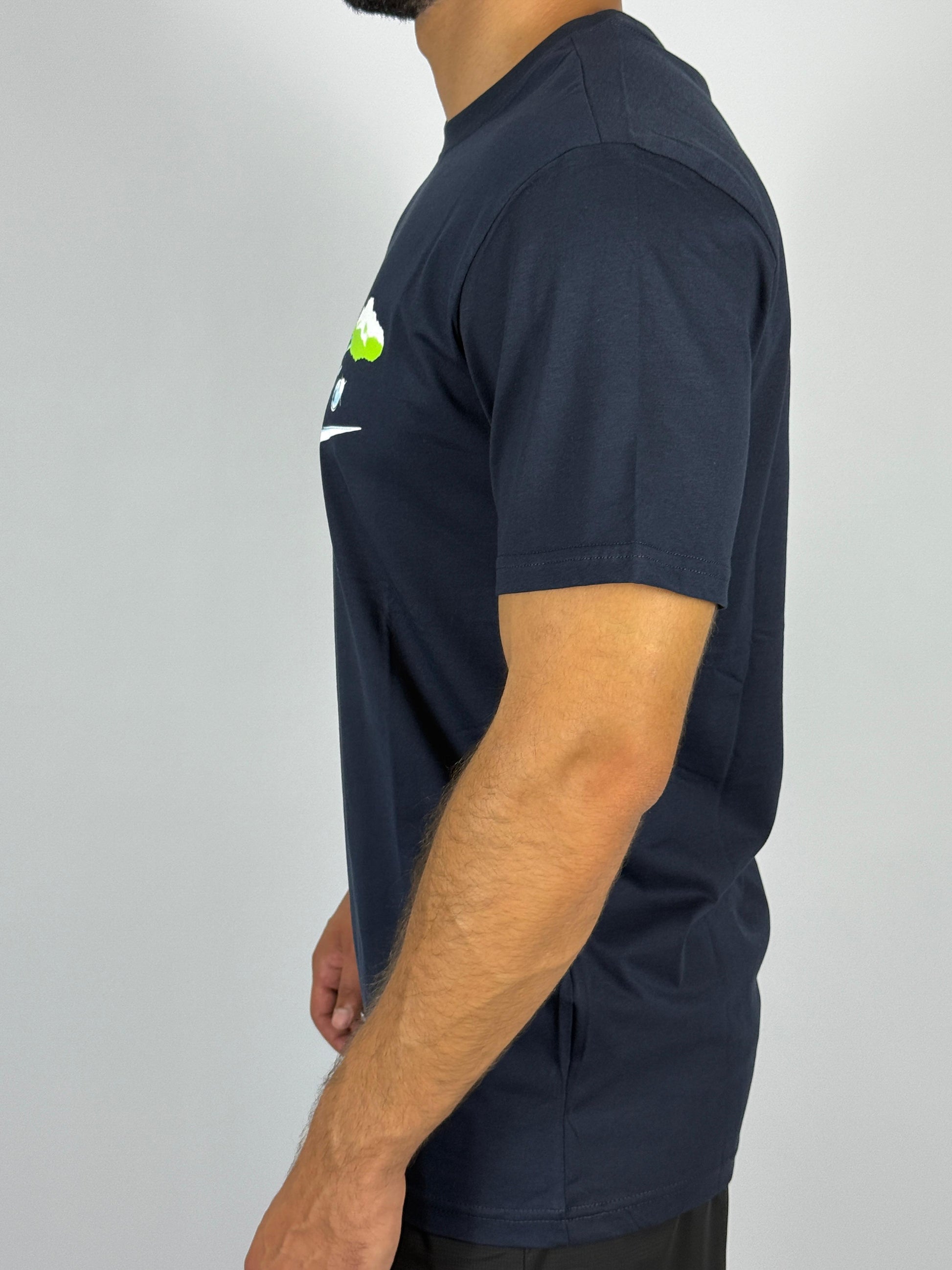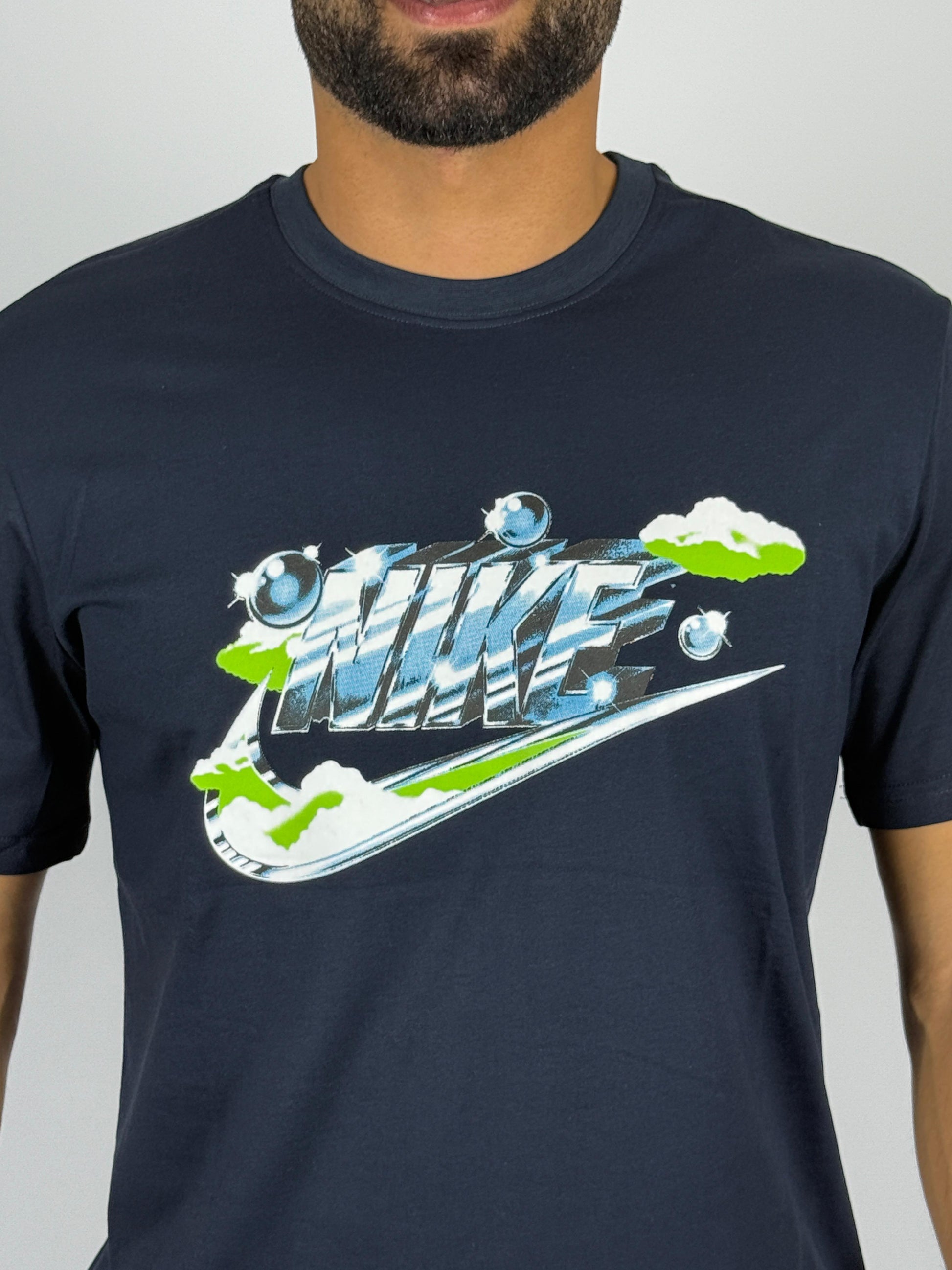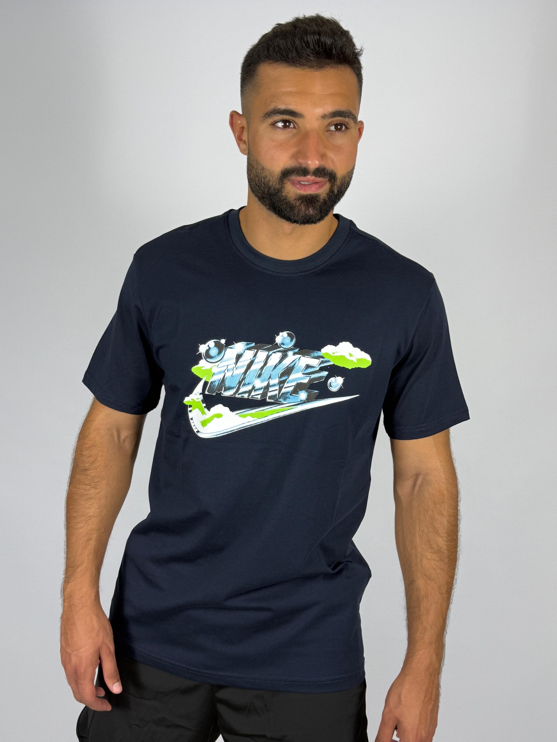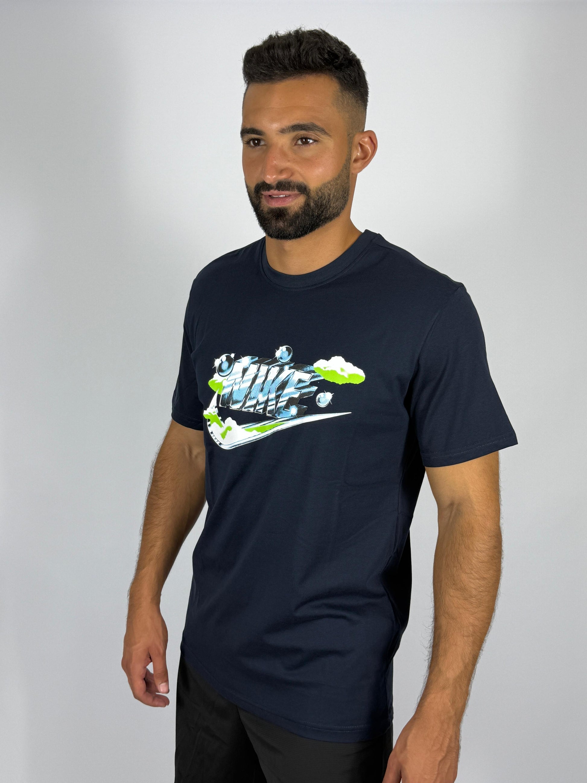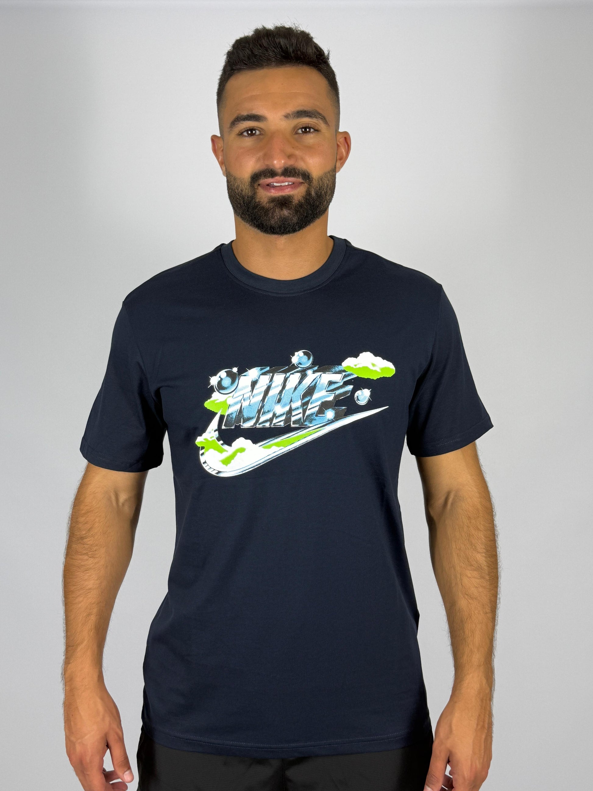 Add a fresh graphic to your collection with the Nike Men's Sportswear Club Graphic T-Shirt. This navy blue tee features a unique, stylized Nike logo with dynamic colors and a layered design. Made from soft, comfortable fabric, it’s a perfect choice for casual wear and stands out with its modern, eye-catching graphic