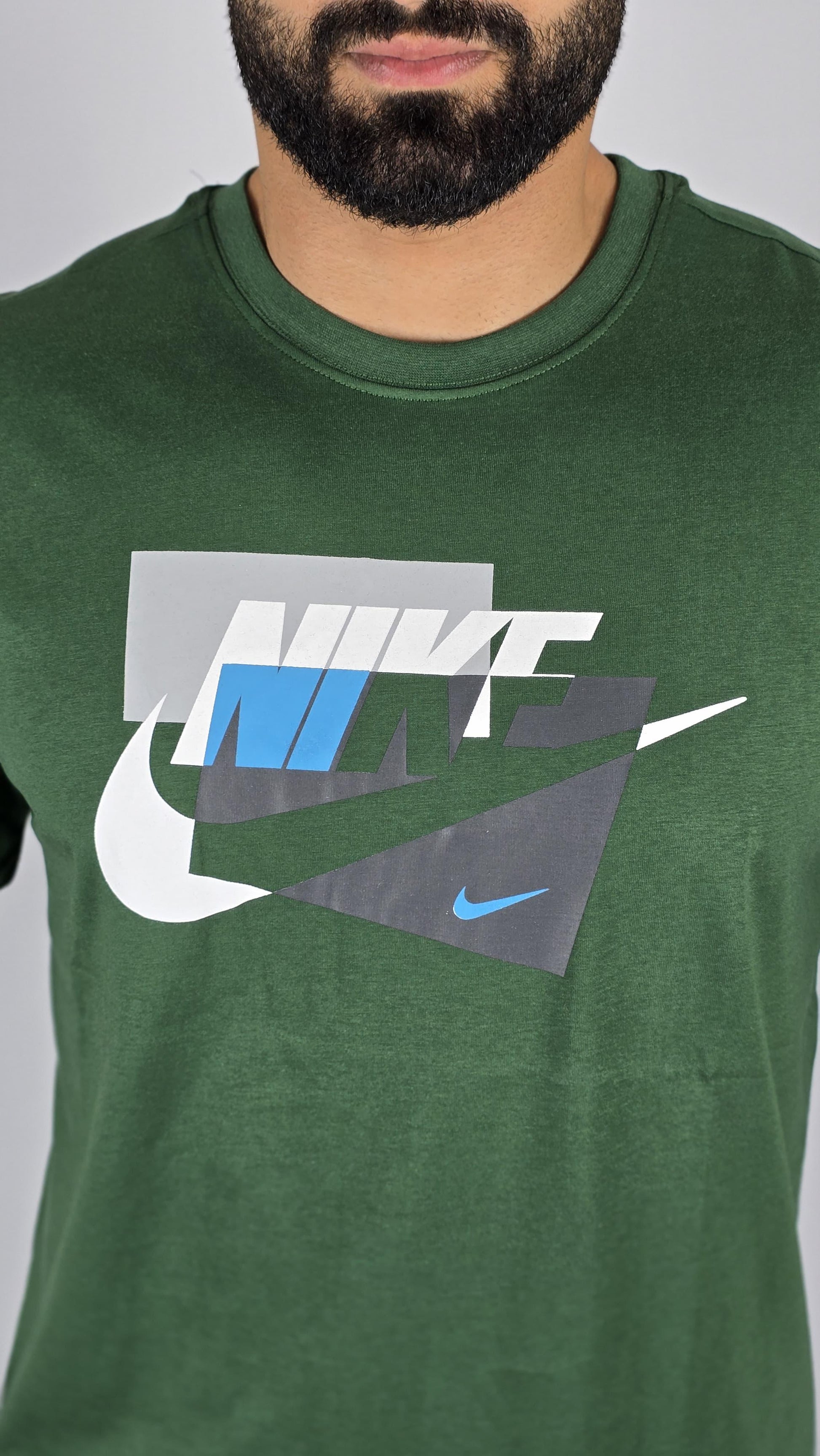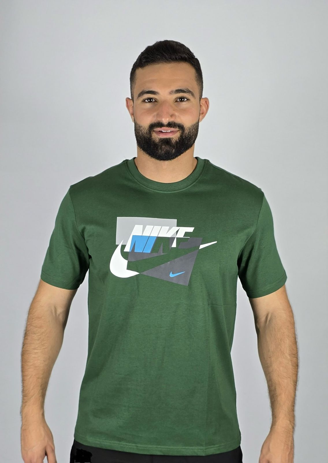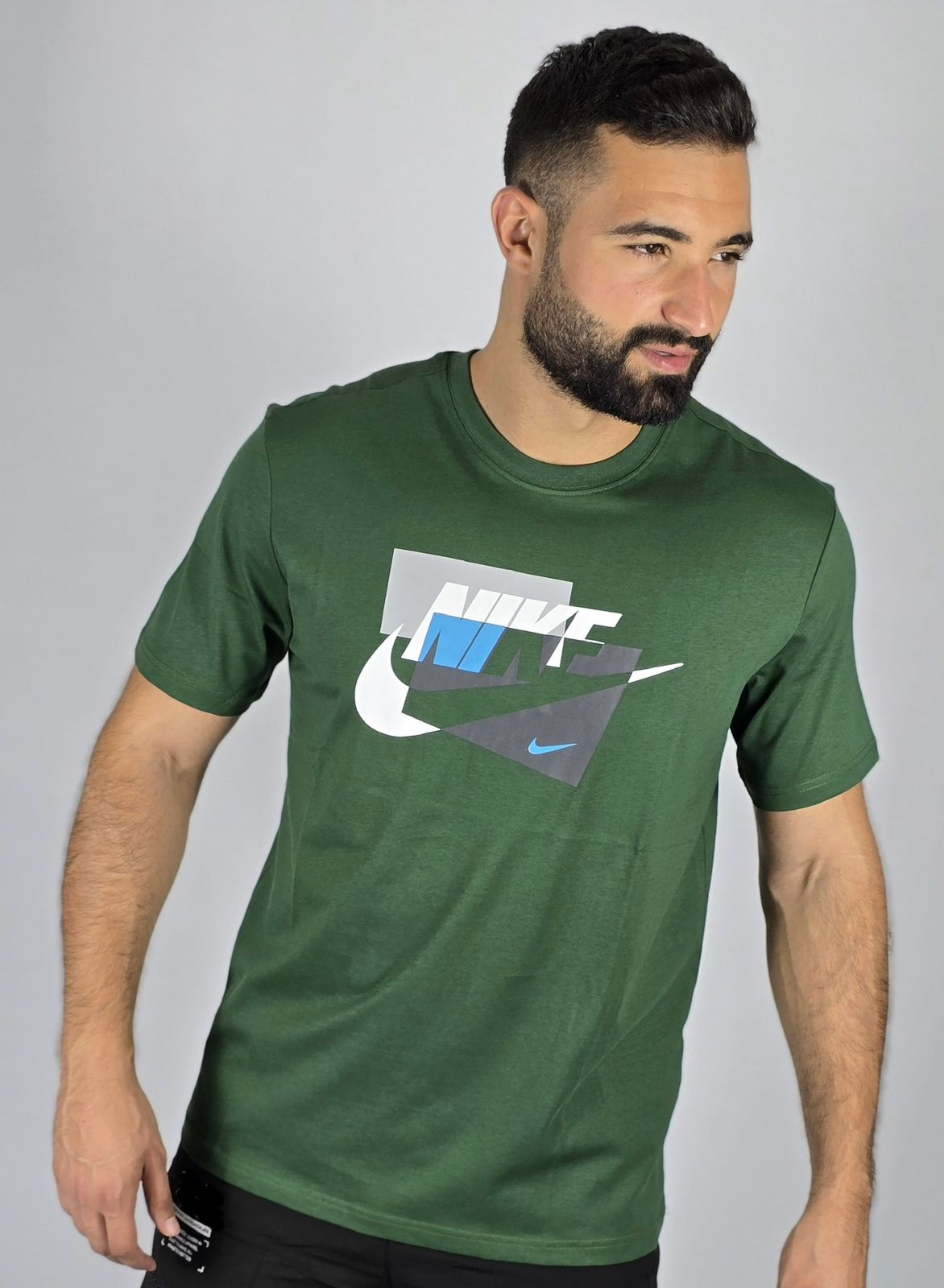 Add a modern edge to your style with this Nike graphic t-shirt. The tee features a dynamic, layered geometric logo in a mix of white, blue, and grey, giving the classic Nike Swoosh a bold, new look. Made from soft fabric, this comfortable and stylish shirt is perfect for everyday wear