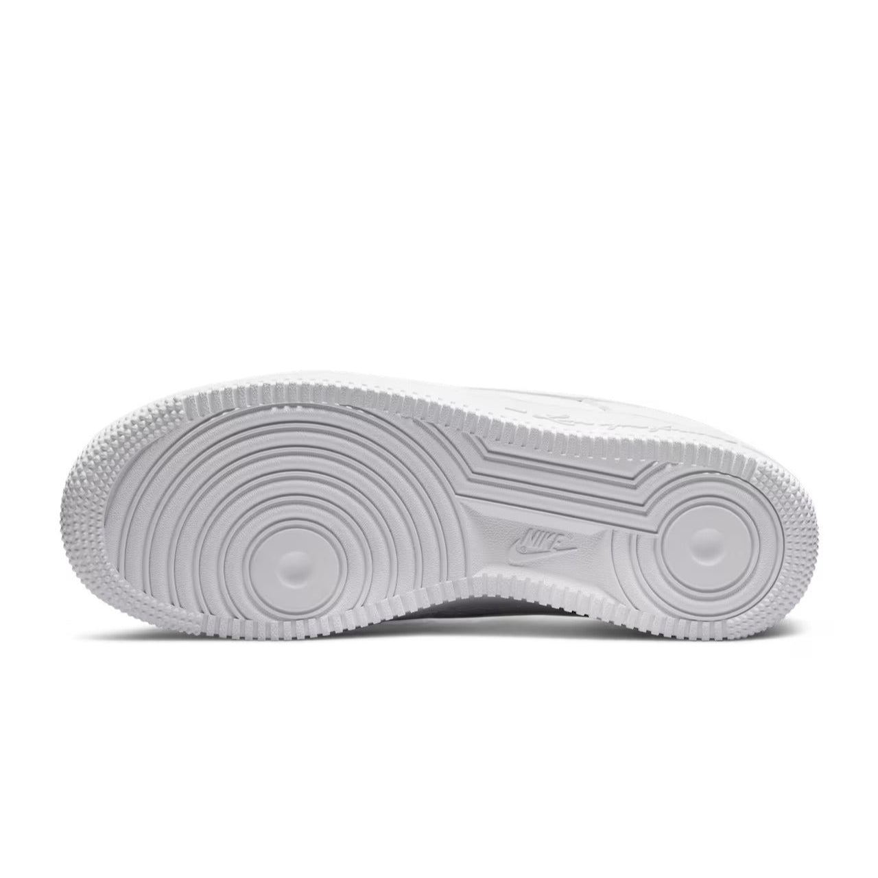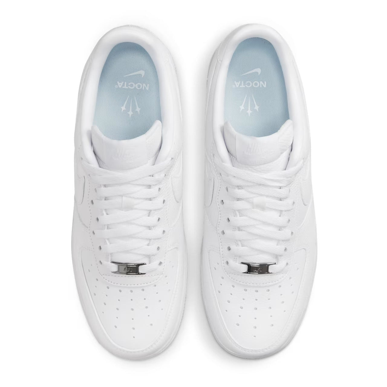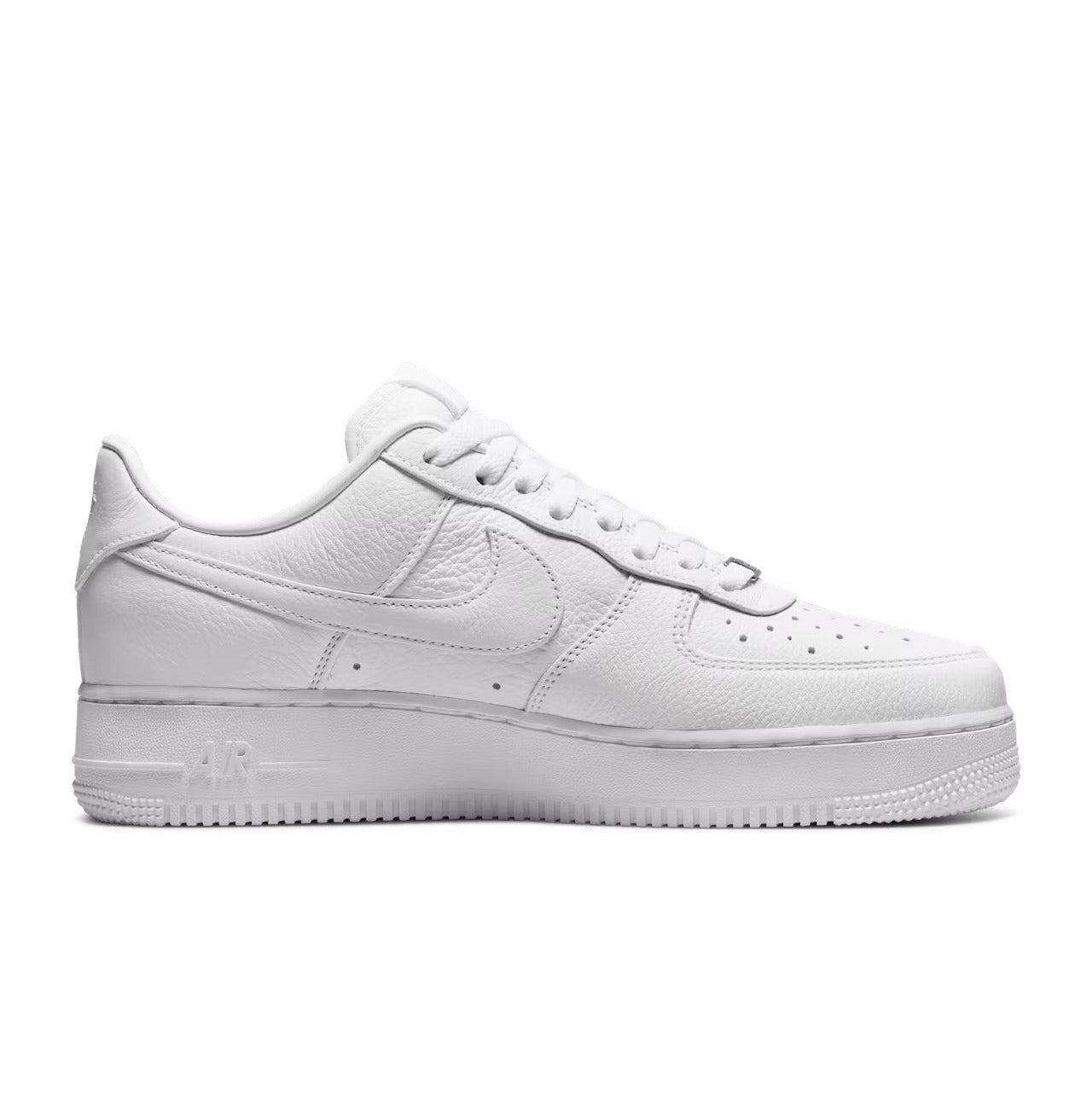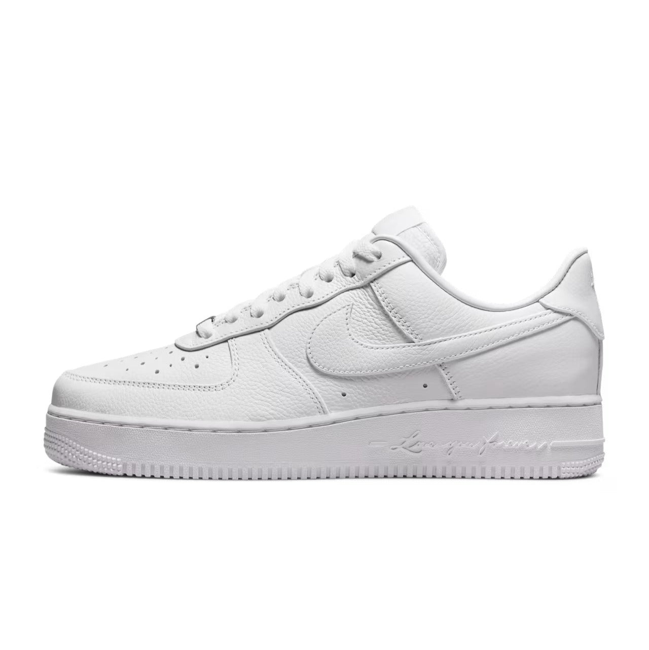 This premium-leather, triple-white AF-1 is a love letter to the classic model. Inspired by Drake's favorite childhood book—Love You Forever—and the sentiment of the phrase, the intent was to enhance the quality of the shoe and add subtle details that would tell the story but wouldn't change the iconic silhouette. For the first time, the midsole has been revised to read "Love You Forever" with complementary hearts that replace the stars on the outsole. Additional design elements include alphabetical beads to customize the lace dubrae, a NOCTA logo in place of Nike Air on the left heel and a new perforation pattern on the toe box.