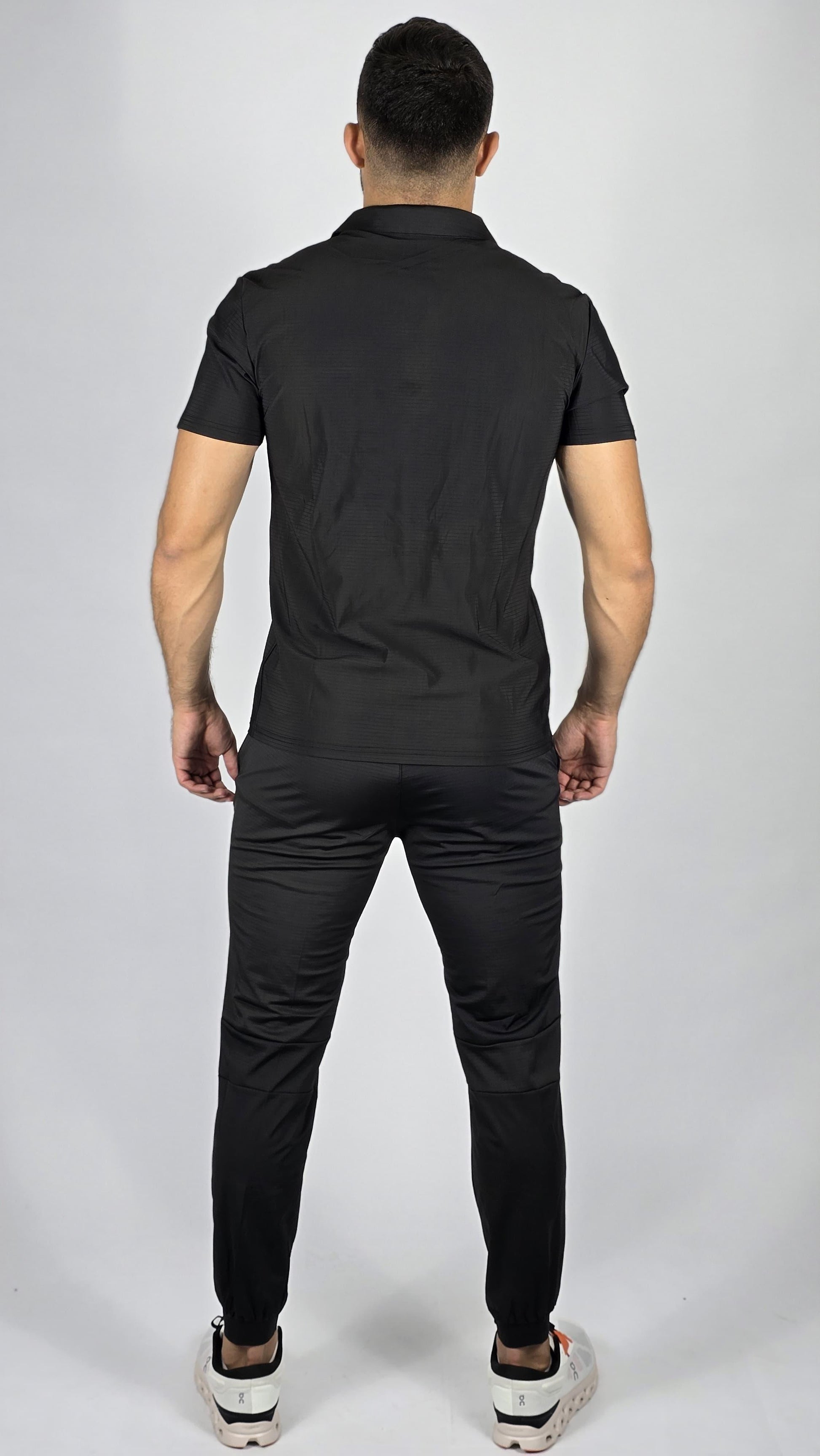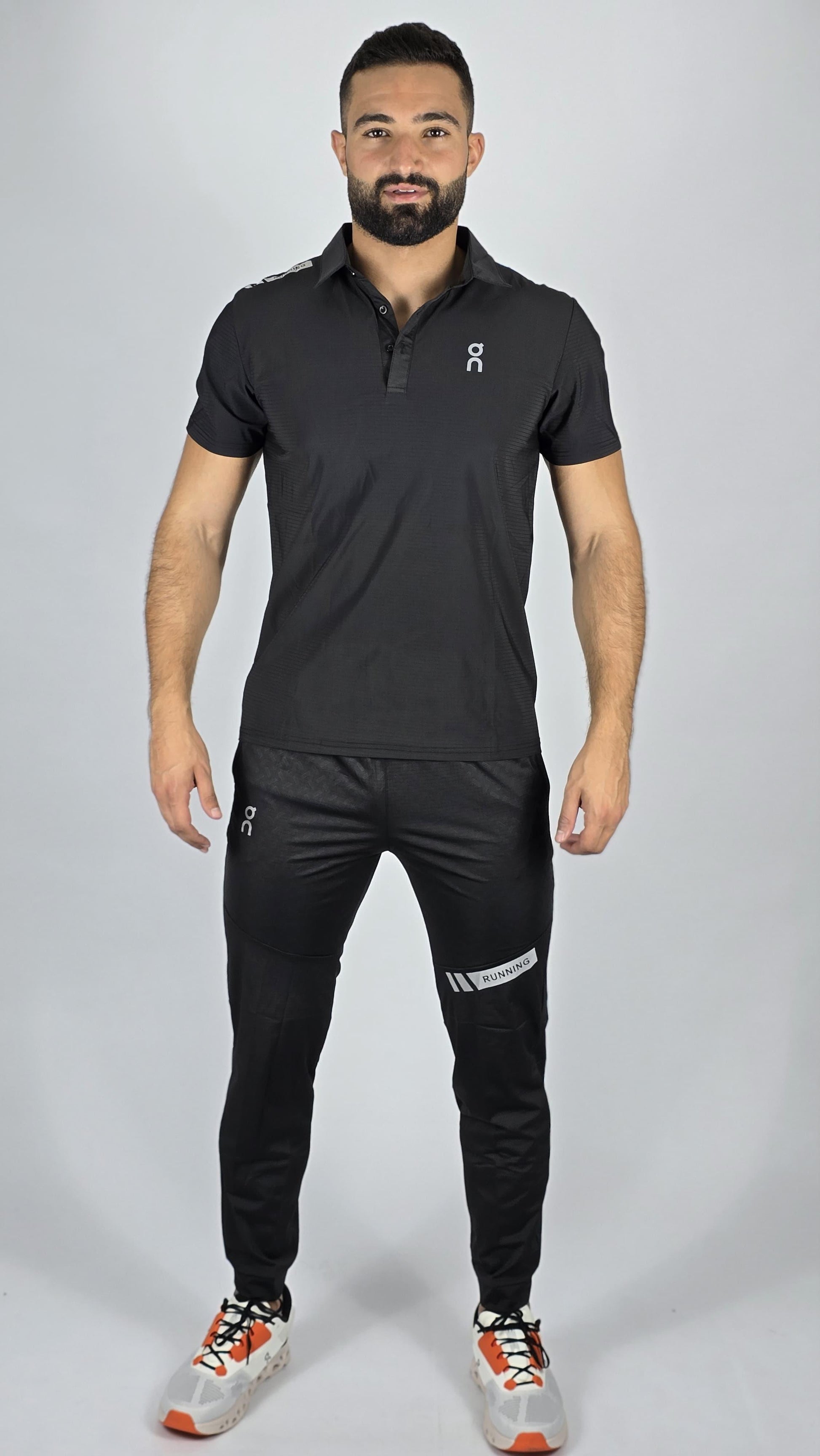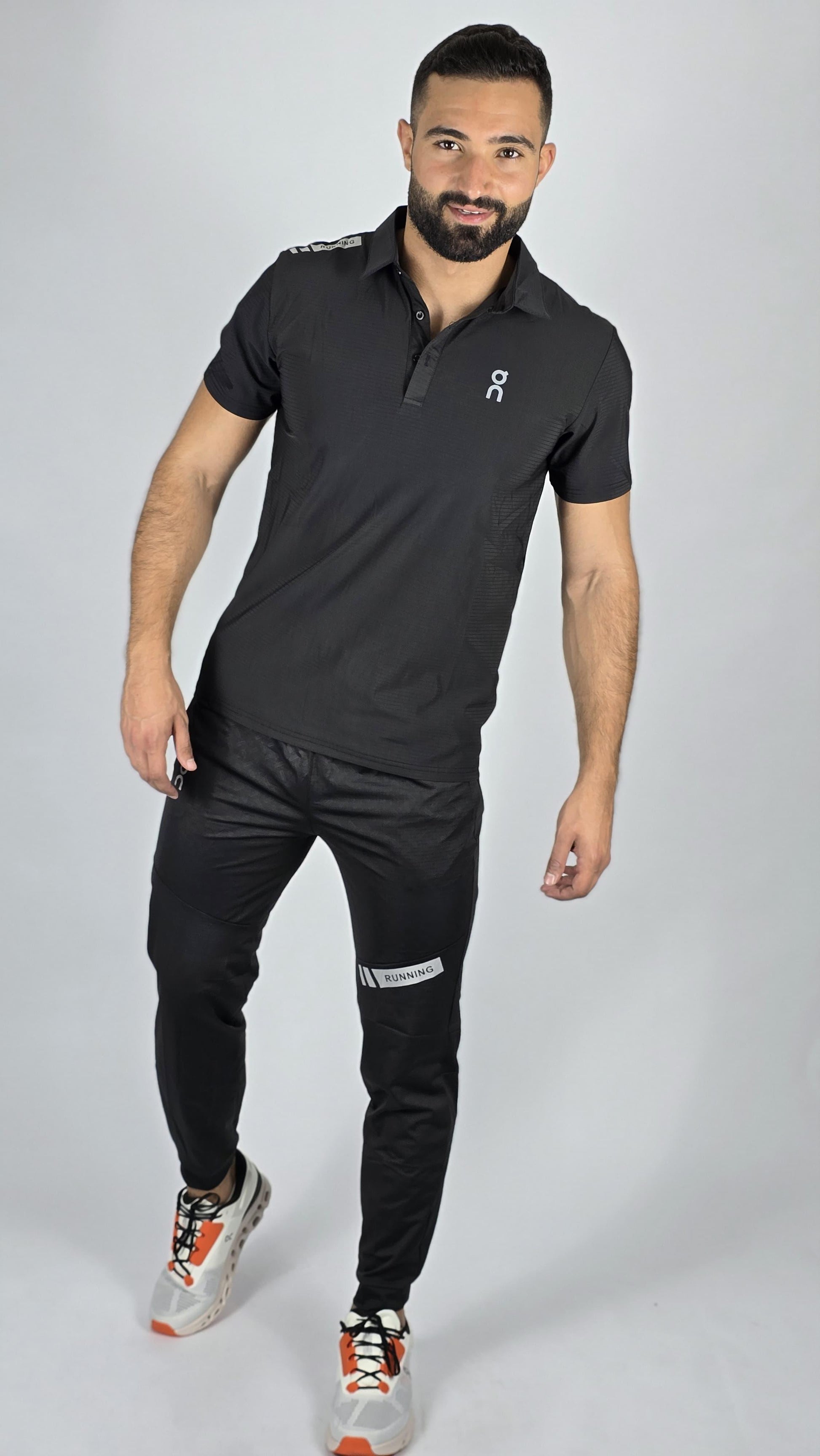 Experience superior performance and style with this coordinated athletic set from On. The top is a sleek black polo shirt, crafted from a lightweight, textured fabric for enhanced breathability and comfort. It's perfectly paired with matching black training pants that feature a slim fit and a "RUNNING" patch, combining a modern look with high-tech functionality for any workout