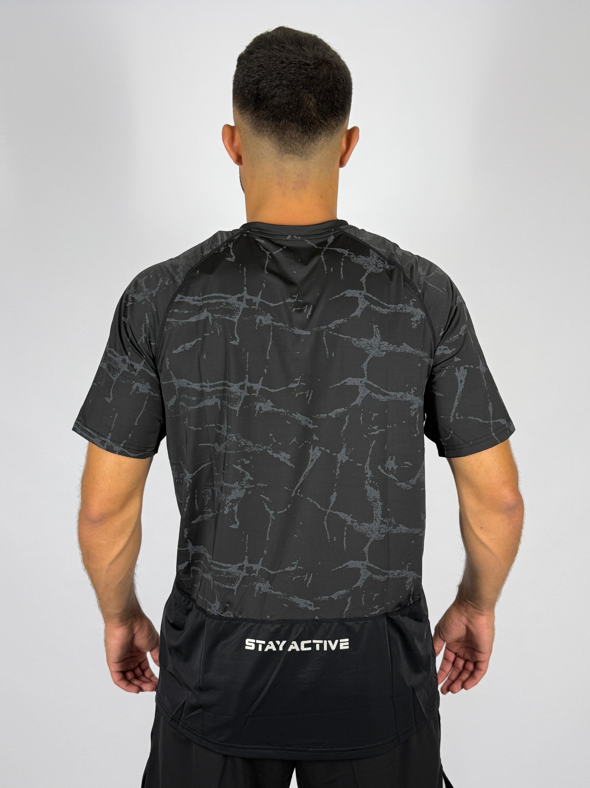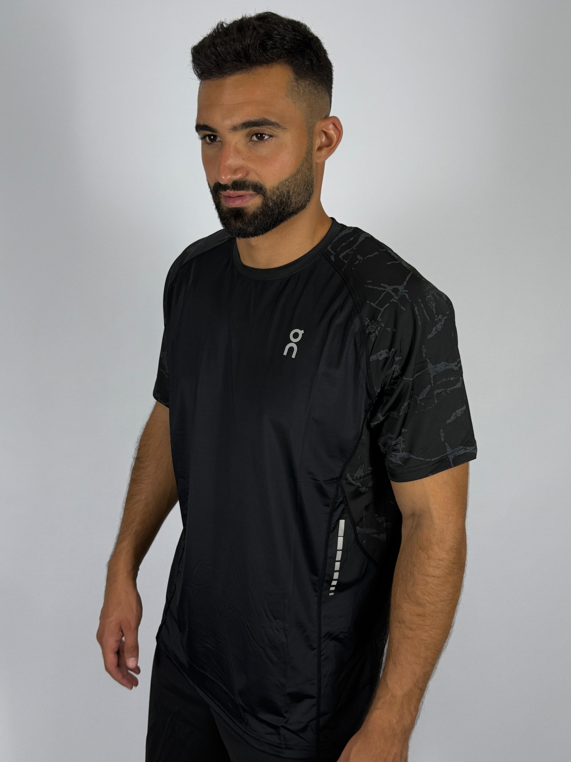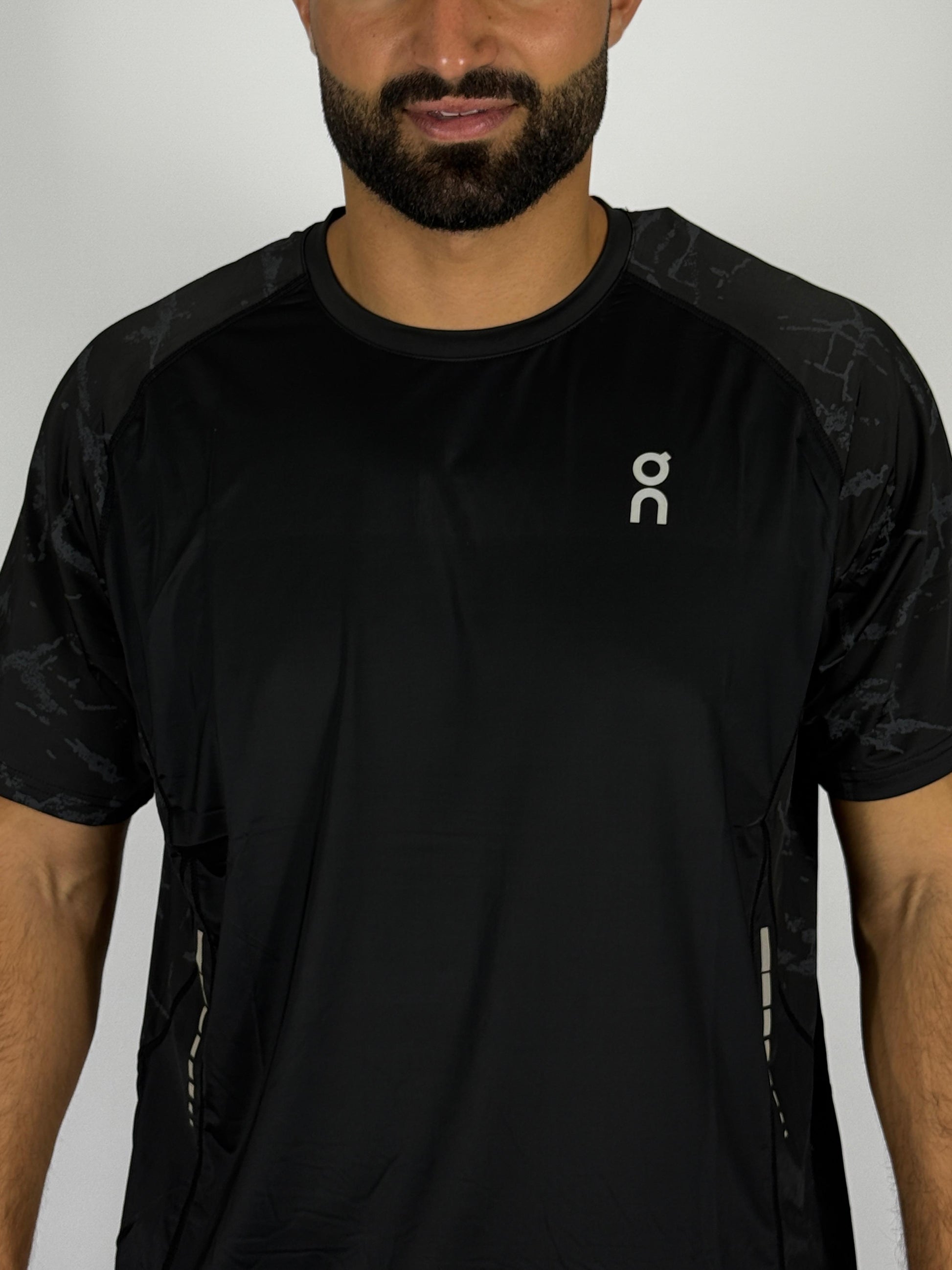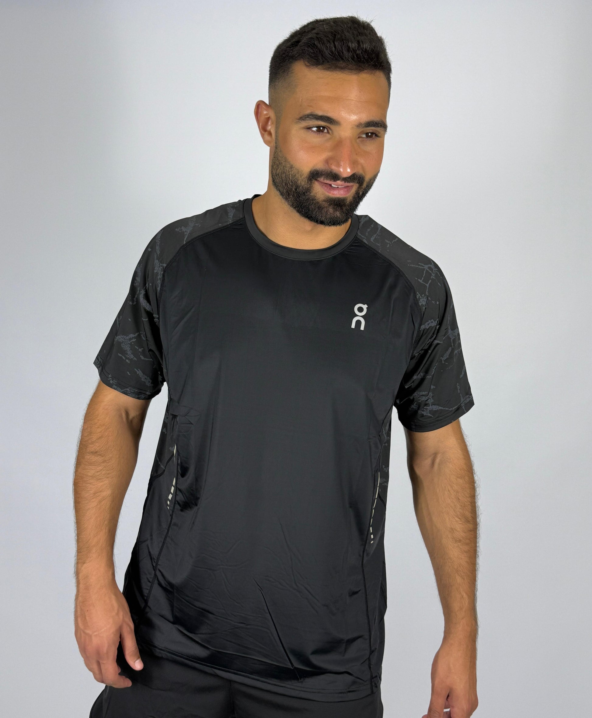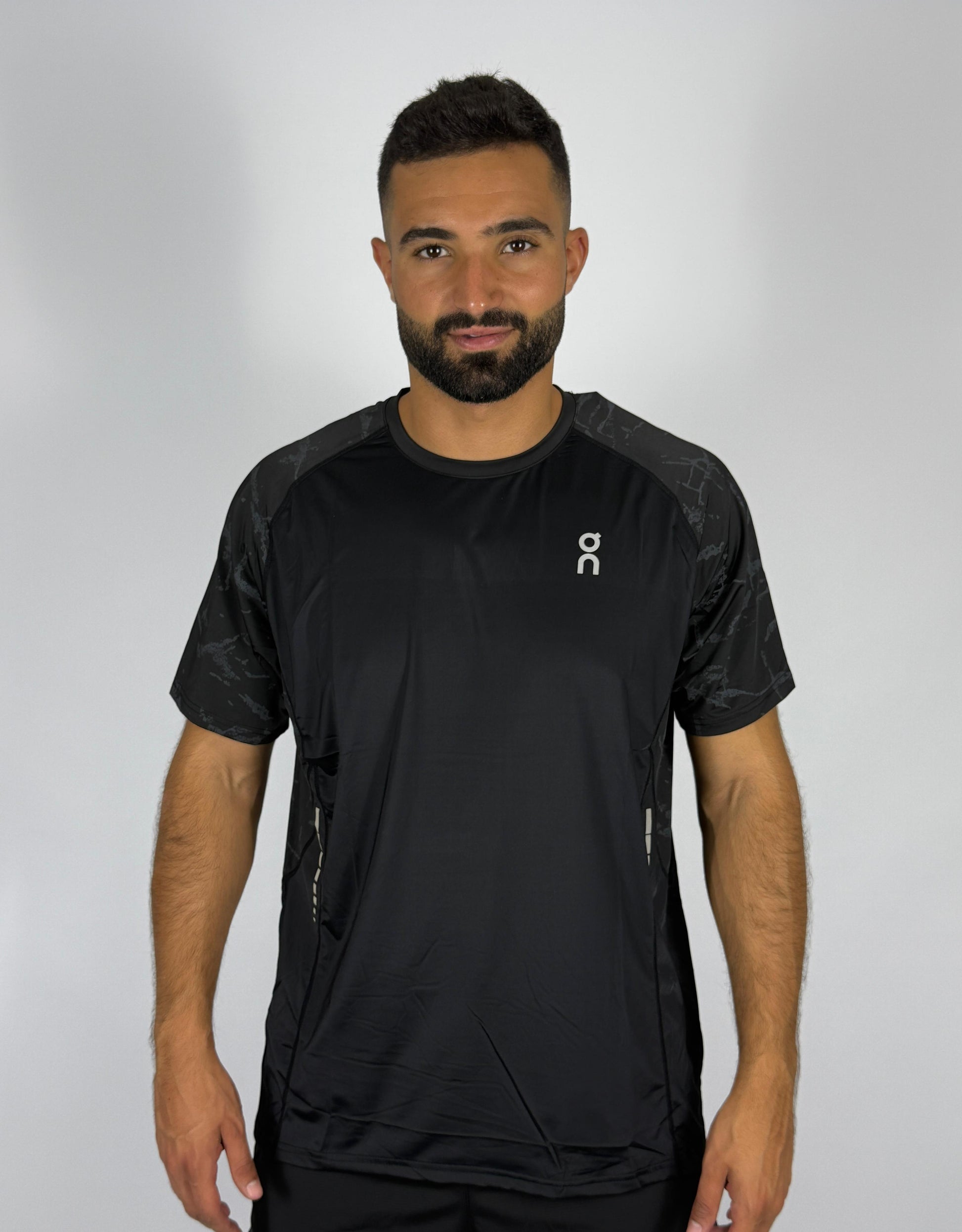 Command the track with the On Performance-T in a sleek black finish with a subtle camo pattern on the sleeves. This high-performance T-shirt is made from a lightweight, moisture-wicking fabric to keep you cool and dry. Its athletic fit and targeted ventilation ensure maximum comfort and freedom of movement, making it a perfect choice for your most demanding runs