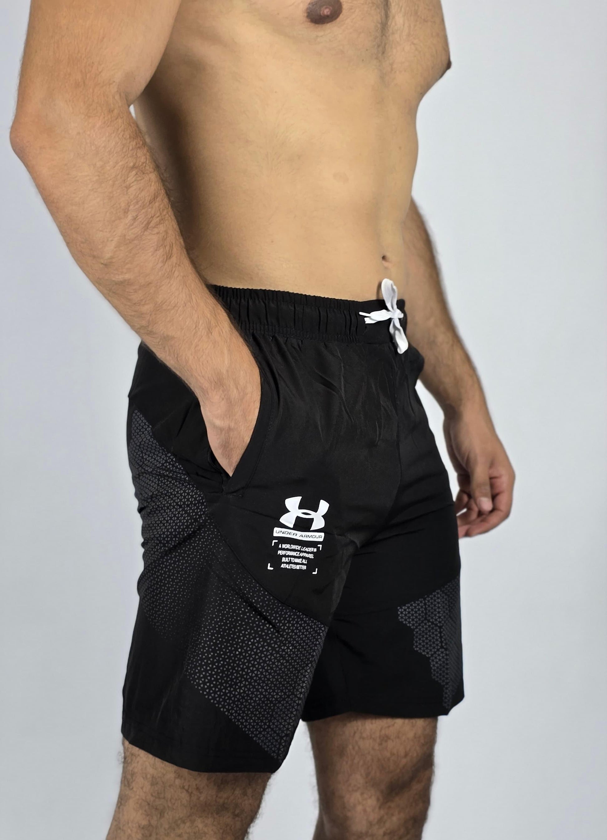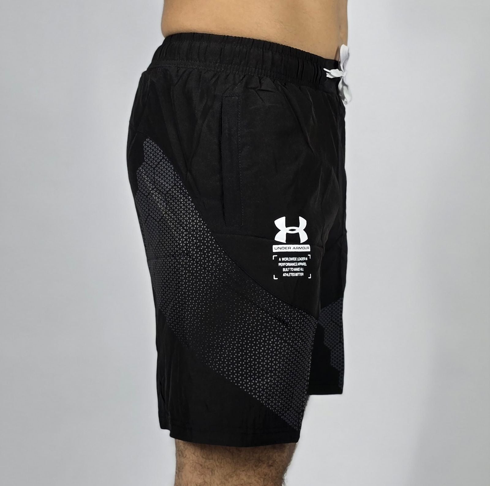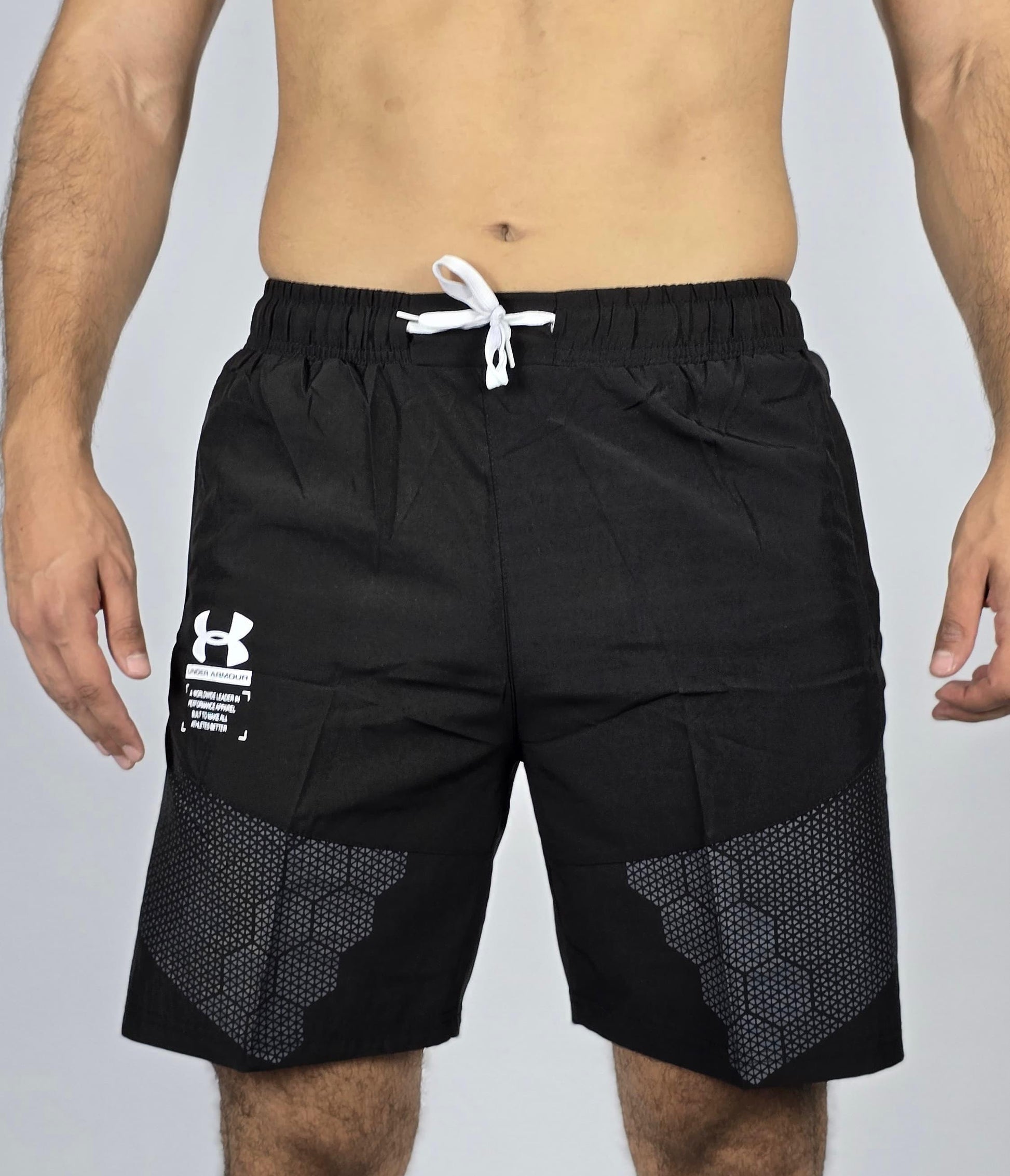 Conquer your workout with these Under Armour performance shorts. Designed for training, they feature a lightweight, breathable fabric that keeps you cool and dry. The shorts have a comfortable elastic waistband with a drawstring for a custom fit and a dynamic geometric print on the lower legs for a modern athletic look